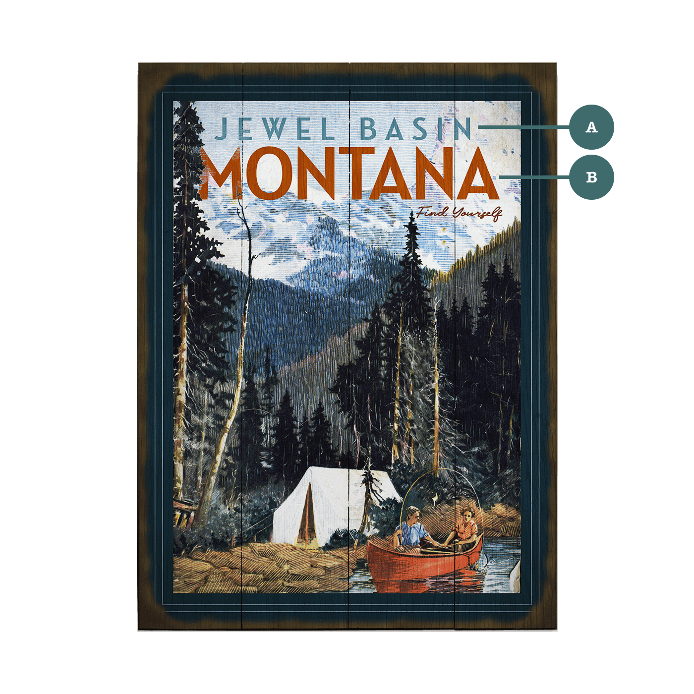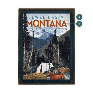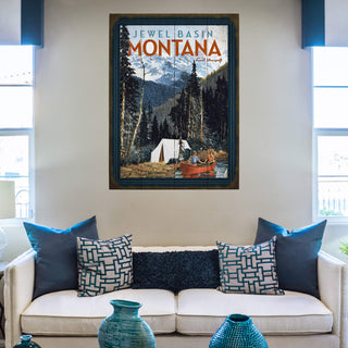 Discover the enchanting wilderness of Jewel Basin in Montana through this captivating artwork. Immerse yourself in the rustic charm of the great outdoors, depicted with a serene campsite and a couple canoeing amidst towering pines and snowy mountains. Add a touch of Montana’s majestic landscapes to your home decor with this unique, nature-themed artwork, ideal for anyone looking to bring the spirit of exploration and tranquility into their living space.
