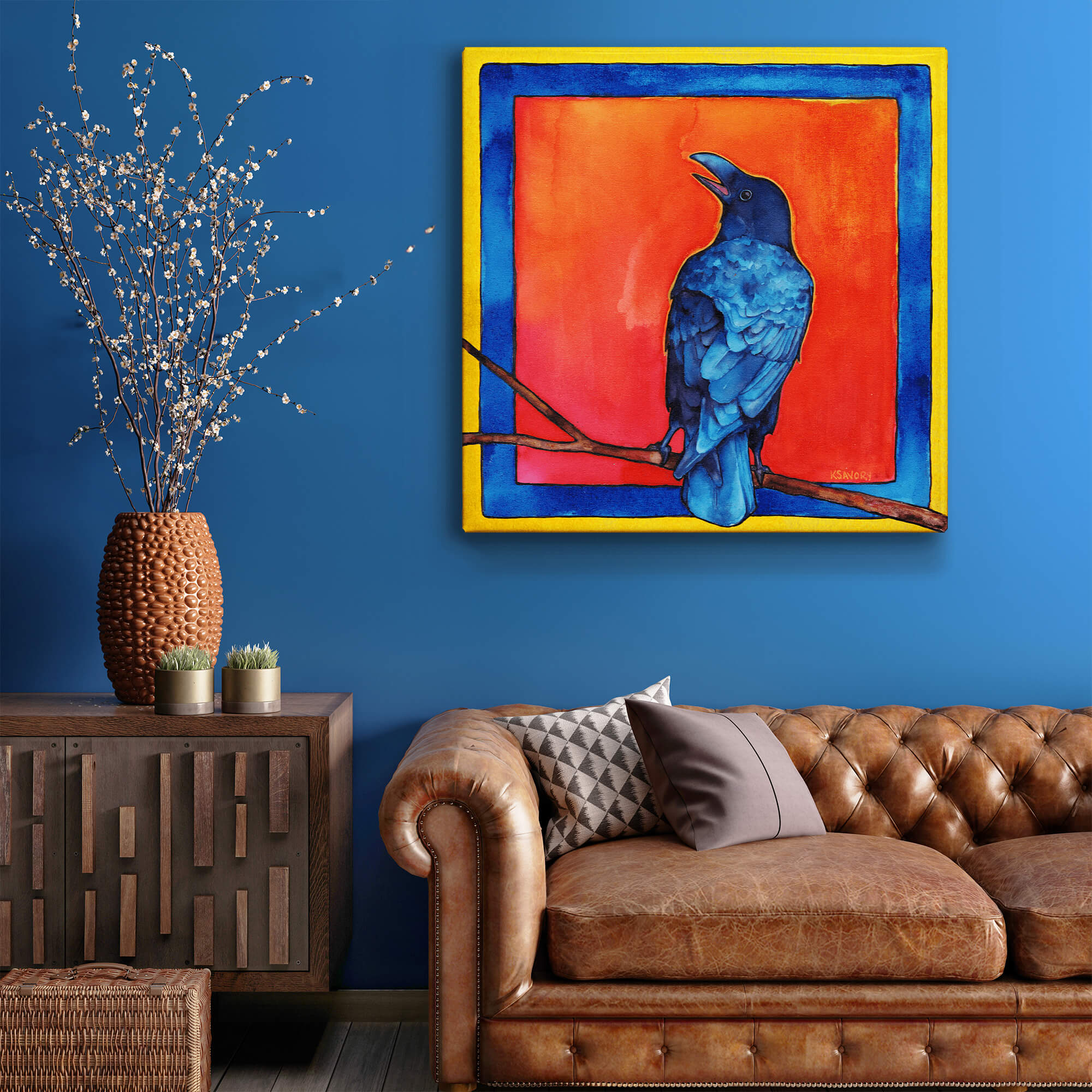 "Fire on the Mountain" is a compelling watercolor painting that features a raven perched on a branch, set against a striking backdrop of fiery red. This vivid representation highlights the raven's detailed plumage and intense expression as it calls out, evoking the drama and beauty of nature's moments. The bold colors framing the raven symbolize the intensity and untamed spirit of a mountain ablaze, creating a powerful contrast that captures the viewer's imagination. Perfect for those who appreciate artwork that combines natural wildlife elements with dynamic, emotive landscapes.