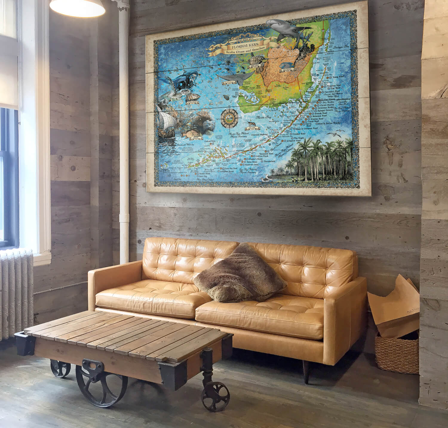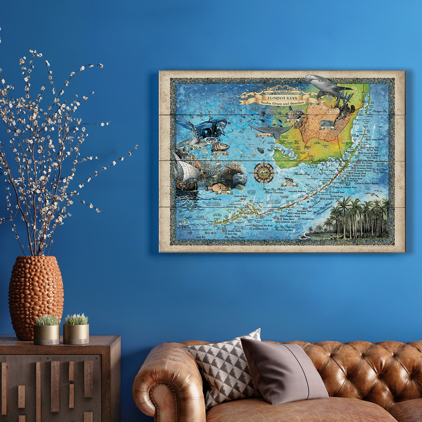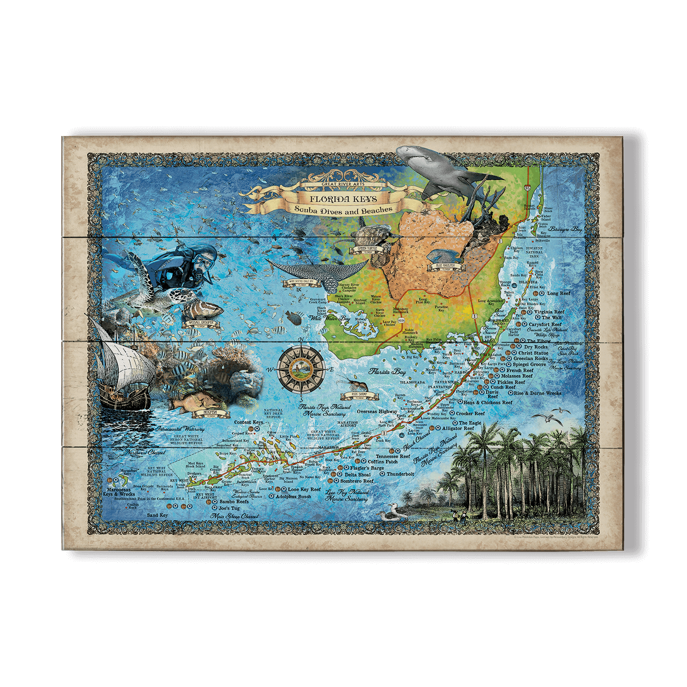 Discover the beauty of the Florida Keys with our stunning decorative wood or metal map. The map features intricate details of the tropical paradise, highlighting popular activities like scuba diving, surfing, and sailing. The warm waters and sandy beaches of the Keys are calling, and this map will be a constant reminder of all the adventures waiting for you.