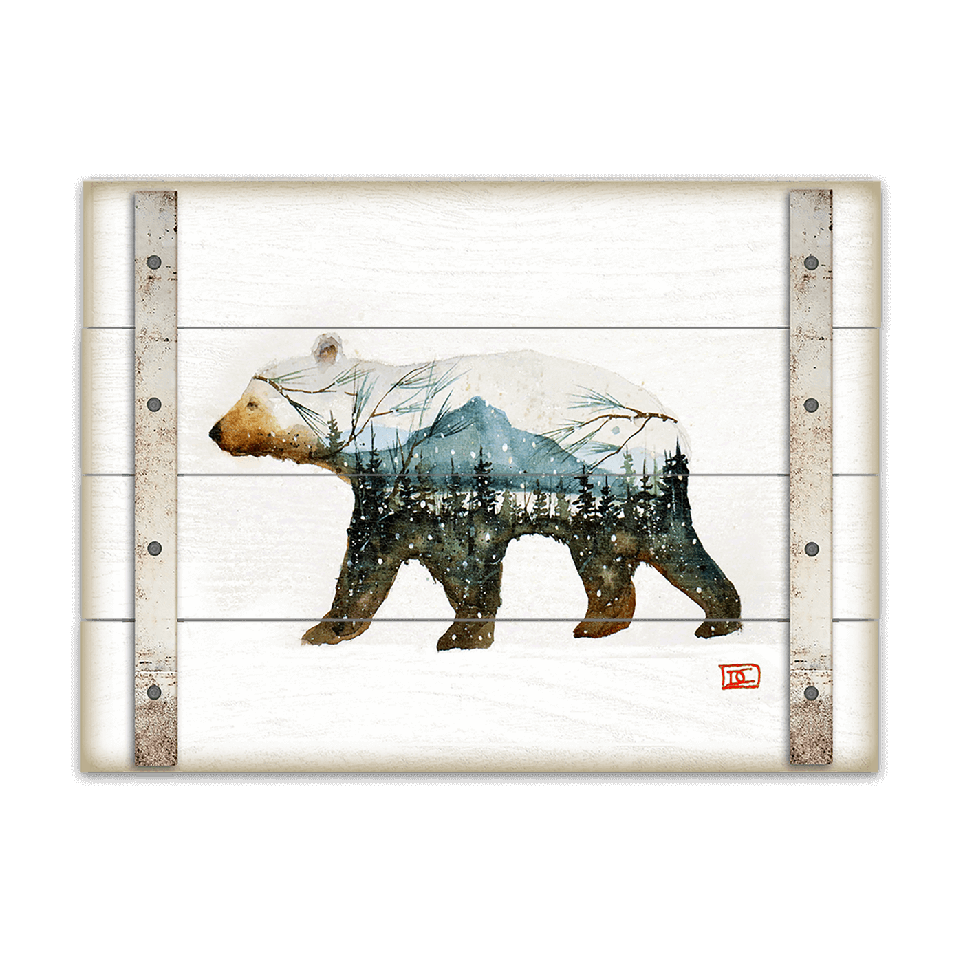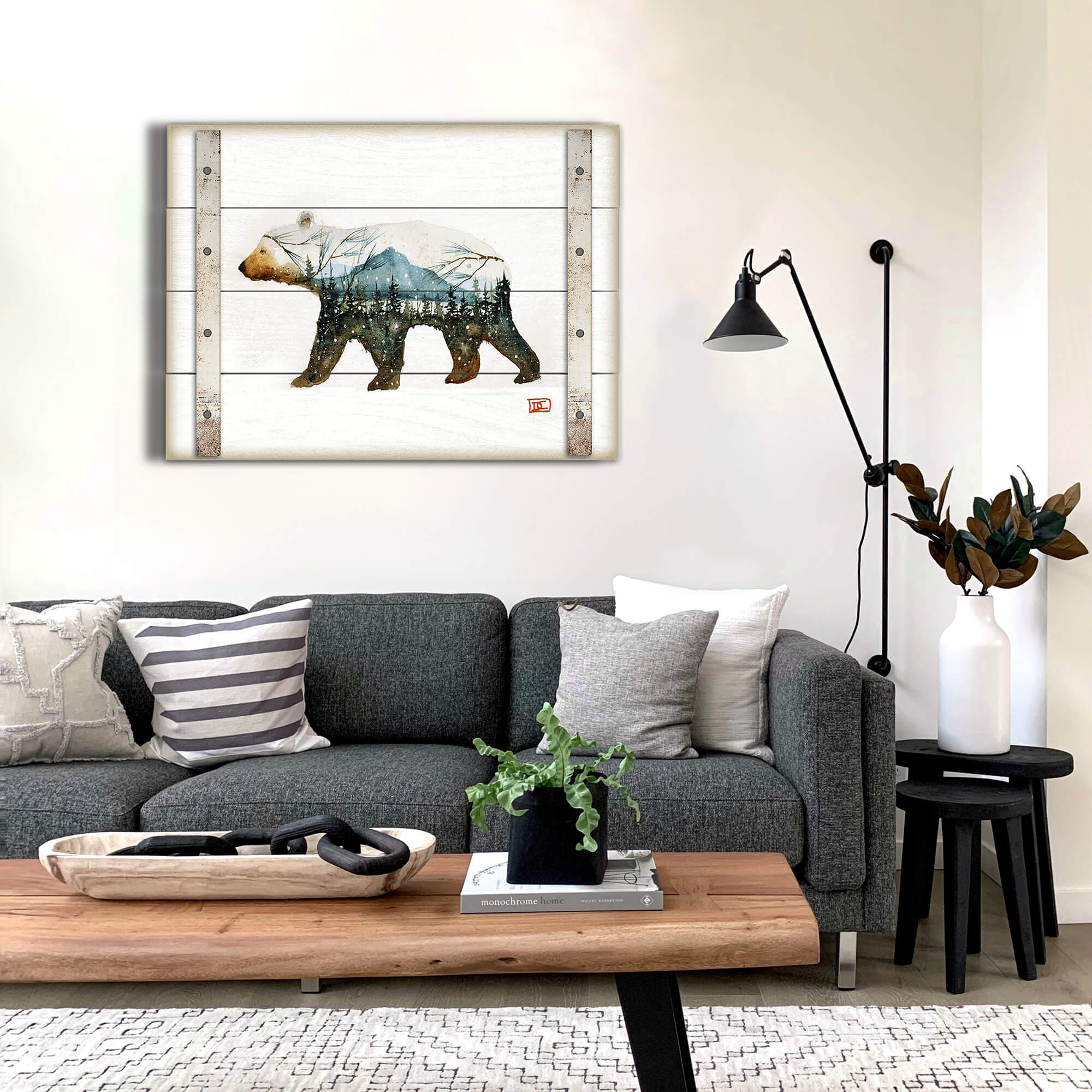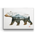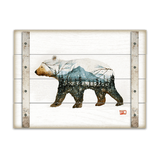 This captivating watercolor seamlessly merges the stoic figure of a bear with the tranquil scenery of a forest landscape. The bear's silhouette is filled with pine trees and mountain vistas, symbolizing its integral role as a guardian of the wilderness. This piece of art is a homage to the beauty of nature and wildlife, ideal for those who wish to bring the spirit of the great outdoors into their living space.