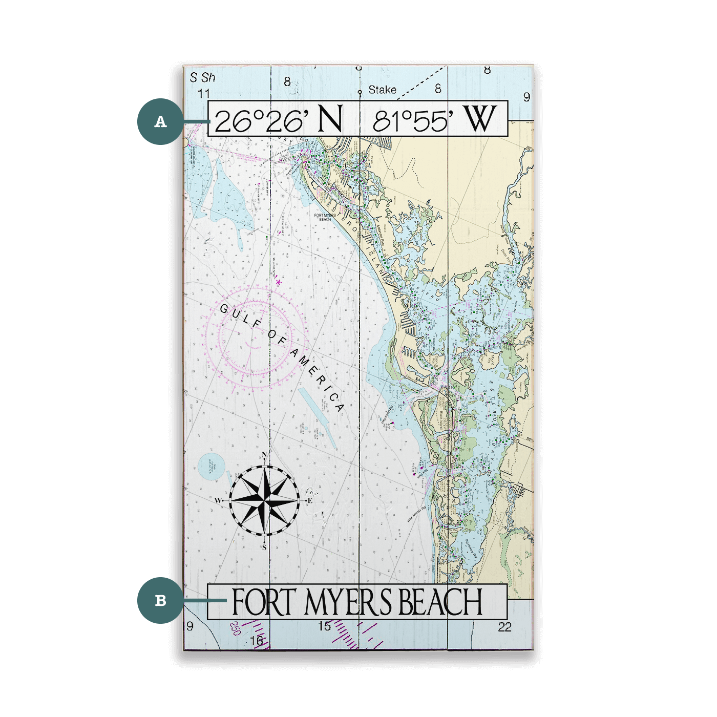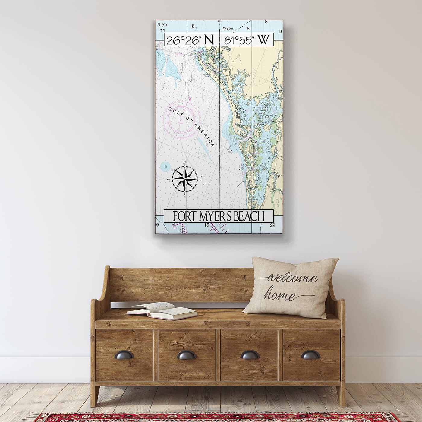 This artwork features a detailed chart of Fort Myers Beach, Florida, capturing its position along the Gulf and the intricate waterways of Estero Island. The design includes precise coordinates (26°26' N, 81°55' W) and a decorative compass rose, highlighting the town’s strong connection to the sea. Known for its sugar-sand beaches, vibrant fishing culture, and lively waterfront, Fort Myers Beach is a favorite destination for boaters, anglers, and beach lovers. Both the name and coordinates can be customized, making this artwork a unique way to celebrate the coastal charm and nautical spirit of Fort Myers Beach in any home or space.