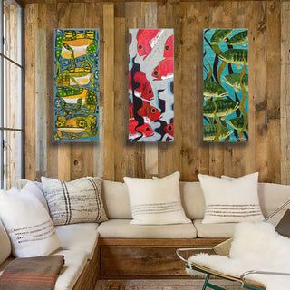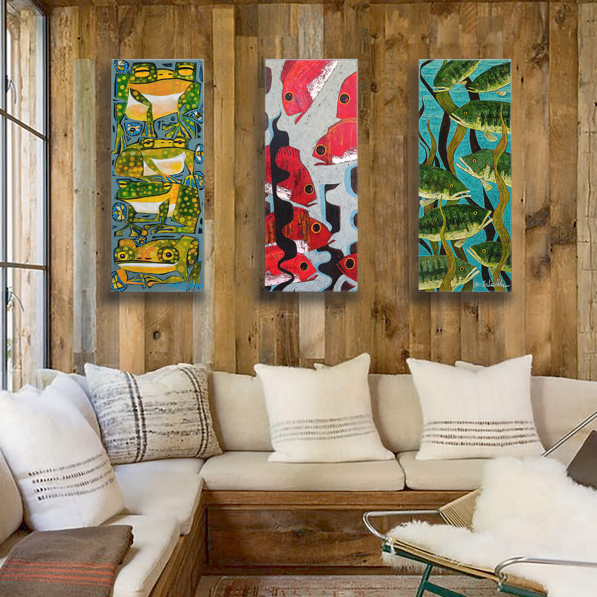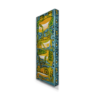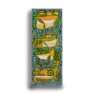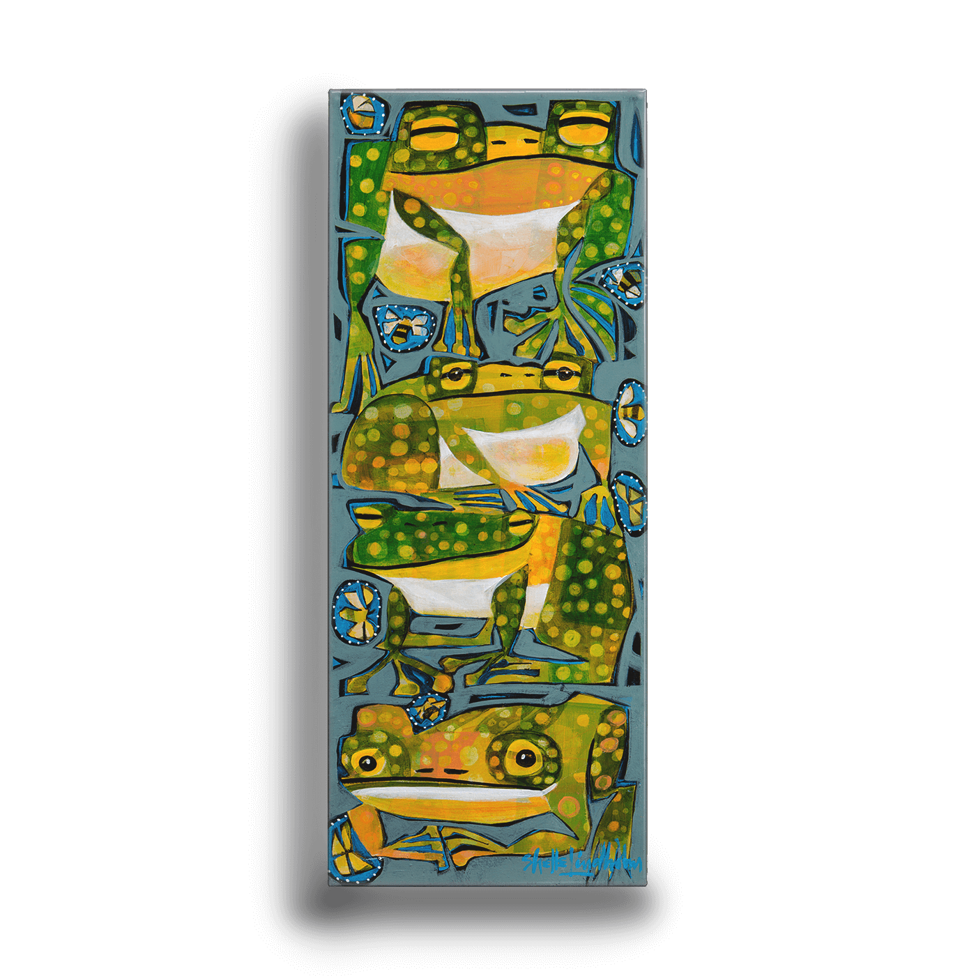 Add a playful touch to your decor with this vibrant artwork featuring a charming group of frogs. Bold greens and yellows bring each character to life against a cool blue-gray background accented by flying insects. Perfect for nature lovers and contemporary art enthusiasts, the layered composition and expressive forms create a sense of charm and whimsy, making this piece an engaging focal point for any space.