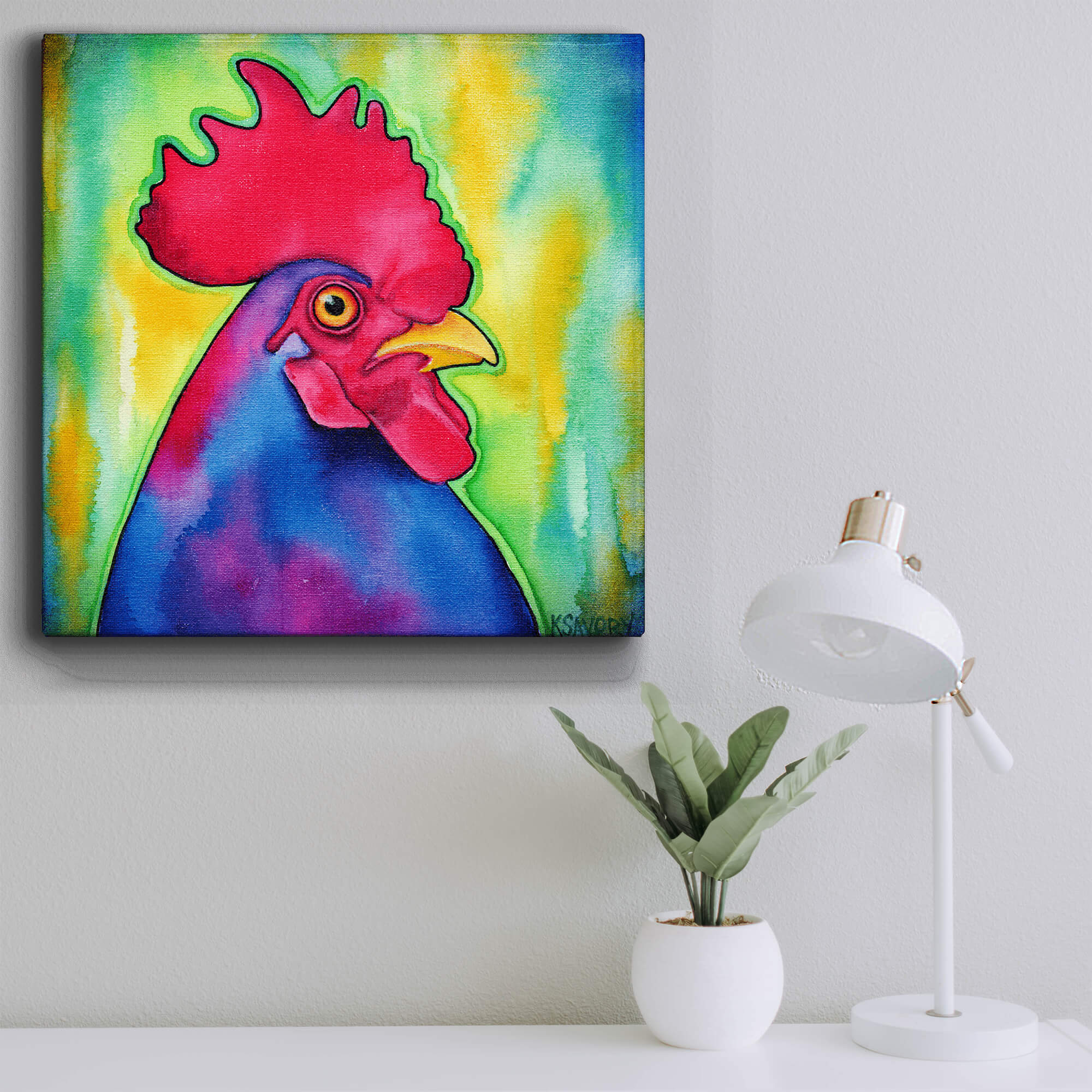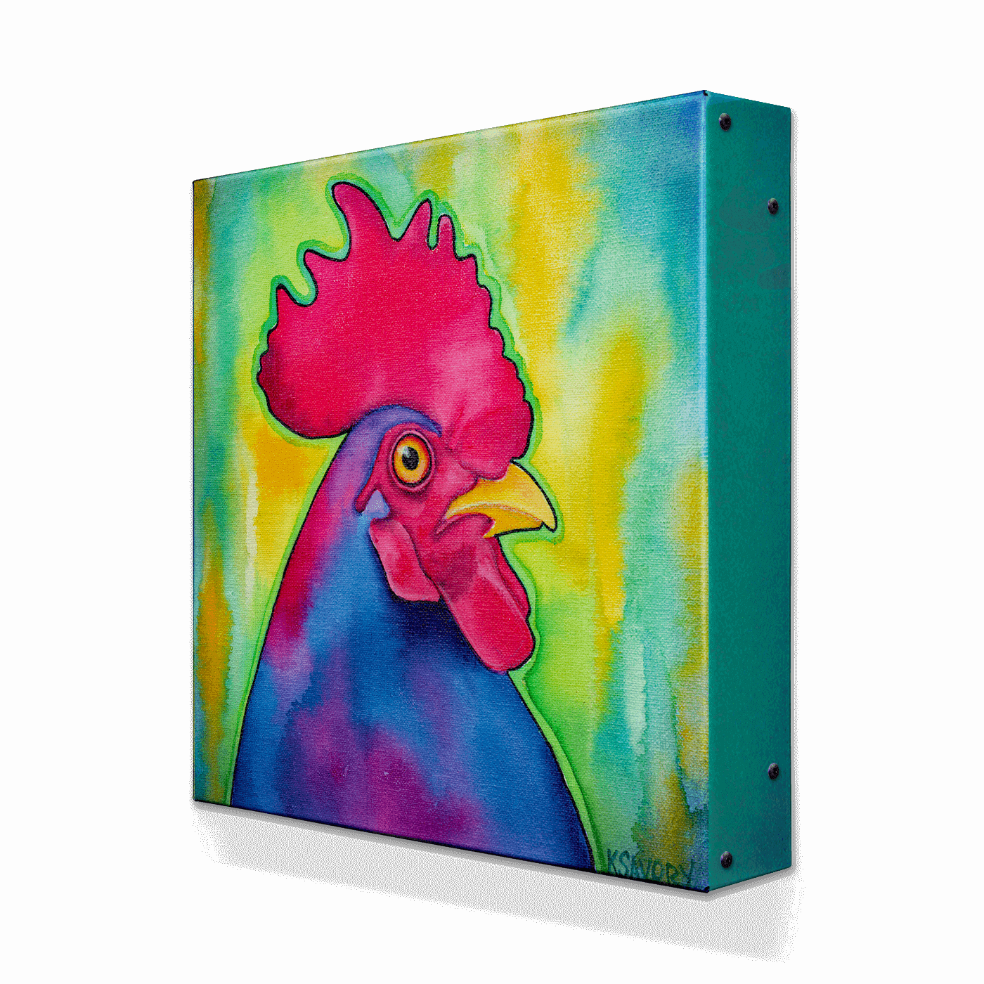 "George" is an eye-catching and vibrant portrayal of a rooster, depicted with a kaleidoscope of bright colors against a lively green and yellow background. The artwork brilliantly captures the spirited and bold nature of the rooster, with its striking red comb and deep blue feathers, emphasizing its commanding presence. This piece is perfect for adding a splash of color and energy to any space, making it a standout addition for those who appreciate art that is both lively and expressive. Ideal for kitchens, dining rooms, or any area that benefits from a touch of whimsical charm and vivid imagery.