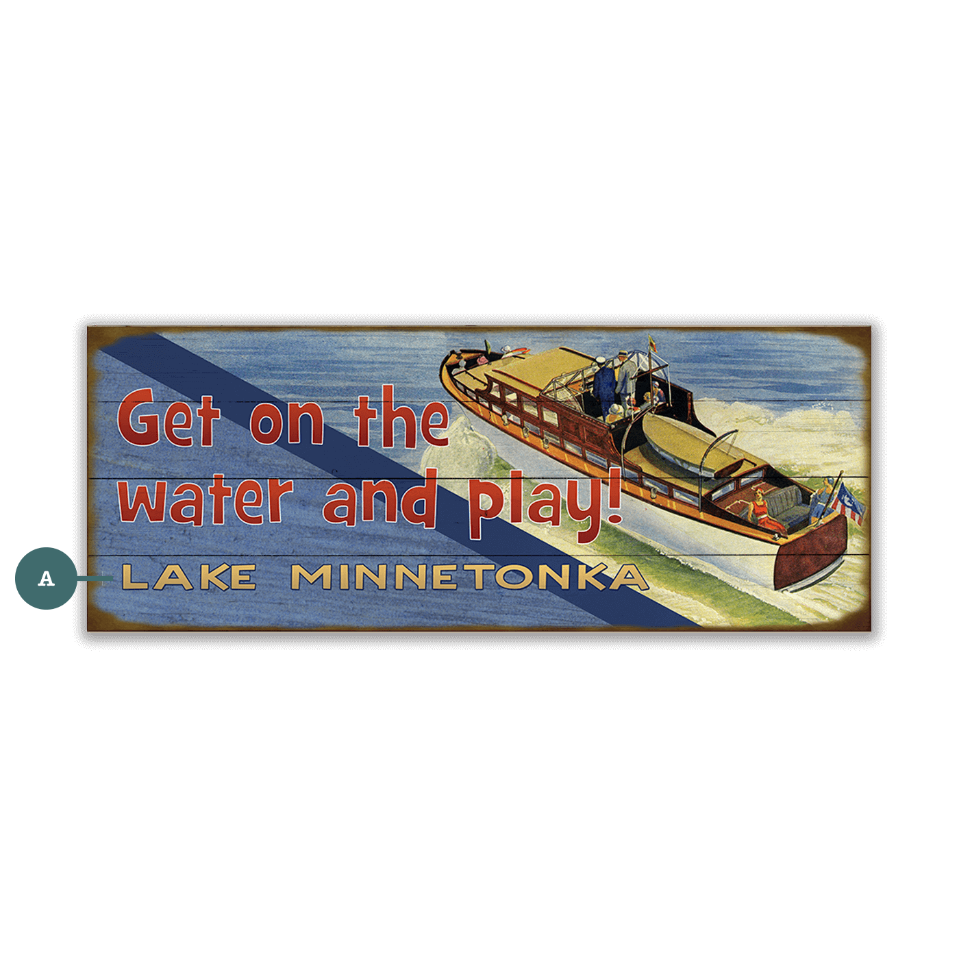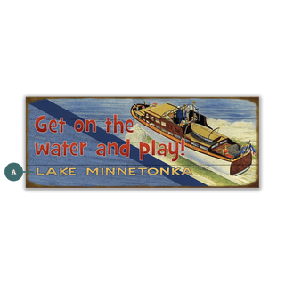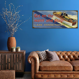 Dive into the excitement of aquatic adventures with our inspiring vintage sign! This artwork captures the thrill of getting on the water, featuring a vibrant scene of a boat filled with joyful passengers. The vivid imagery and energetic slogan 'Get on the water and play!' convey the spirit of fun and leisure that awaits. Whether you’re decorating a lake house or looking to bring a little of the outdoor spirit indoors, this piece is an ideal choice for adding a splash of action and joy to any setting.