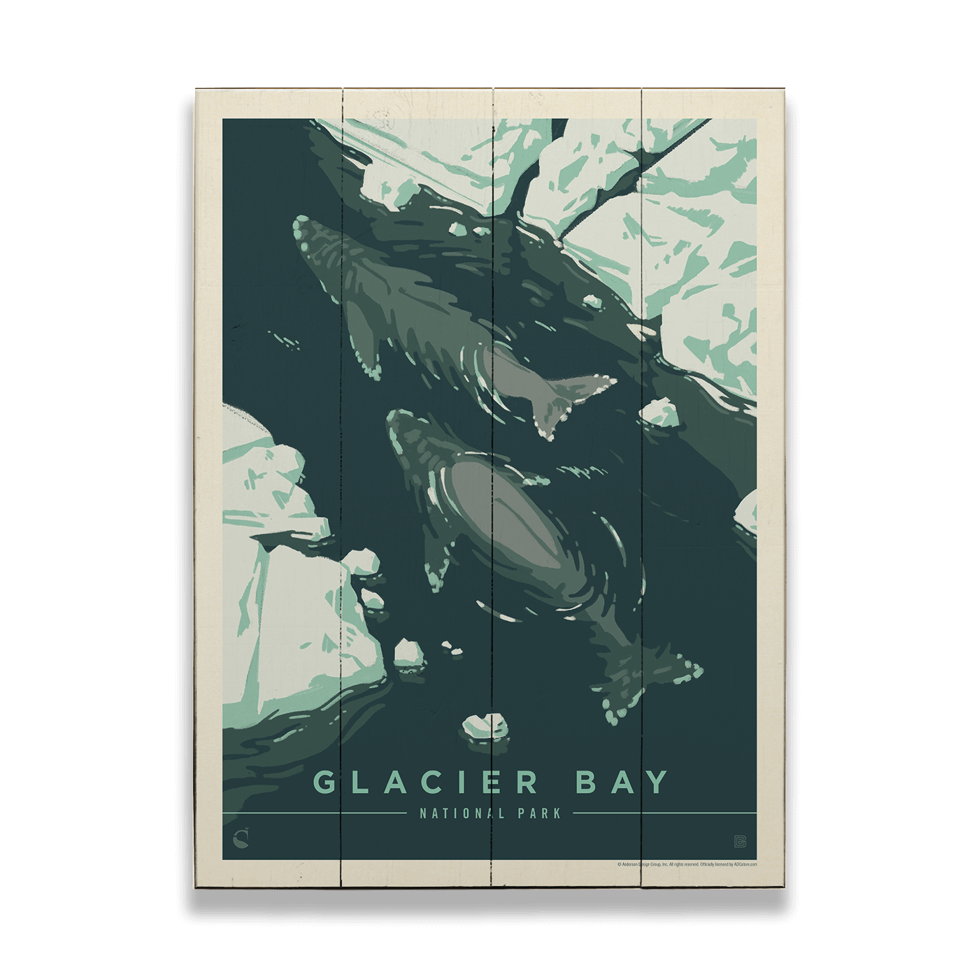 Plunge into the icy depths of Alaska’s wild coast with this striking artwork of Glacier Bay National Park. Two humpback whales swim gracefully through frigid, glacier-fed waters, surrounded by floating blocks of ice. This remote marine sanctuary is renowned for its dramatic fjords, dynamic tidewater glaciers, and thriving populations of whales, sea lions, and seabirds. A testament to the power and beauty of nature in motion, this piece captures the quiet majesty of an untouched Arctic seascape teeming with life.