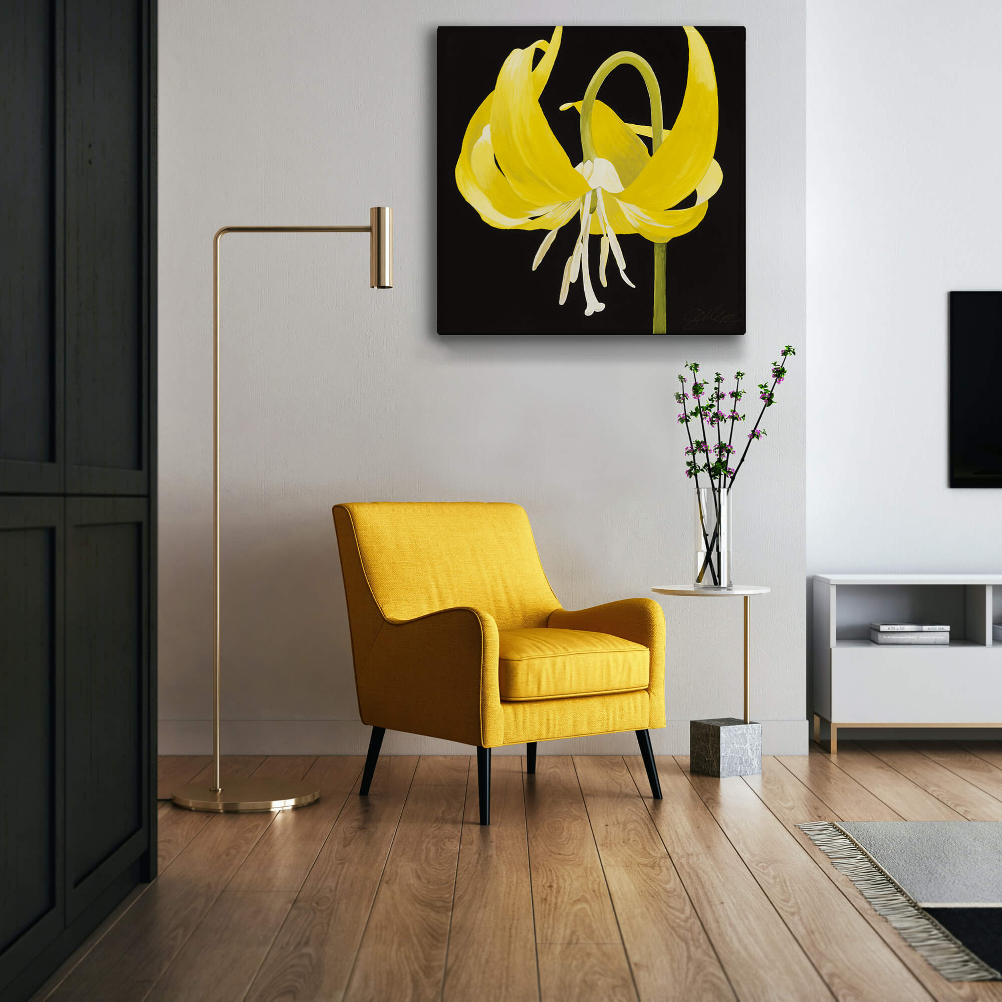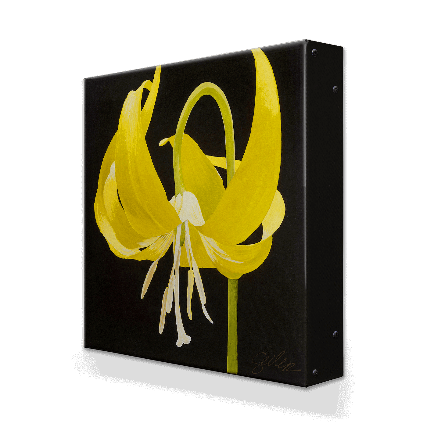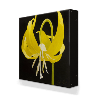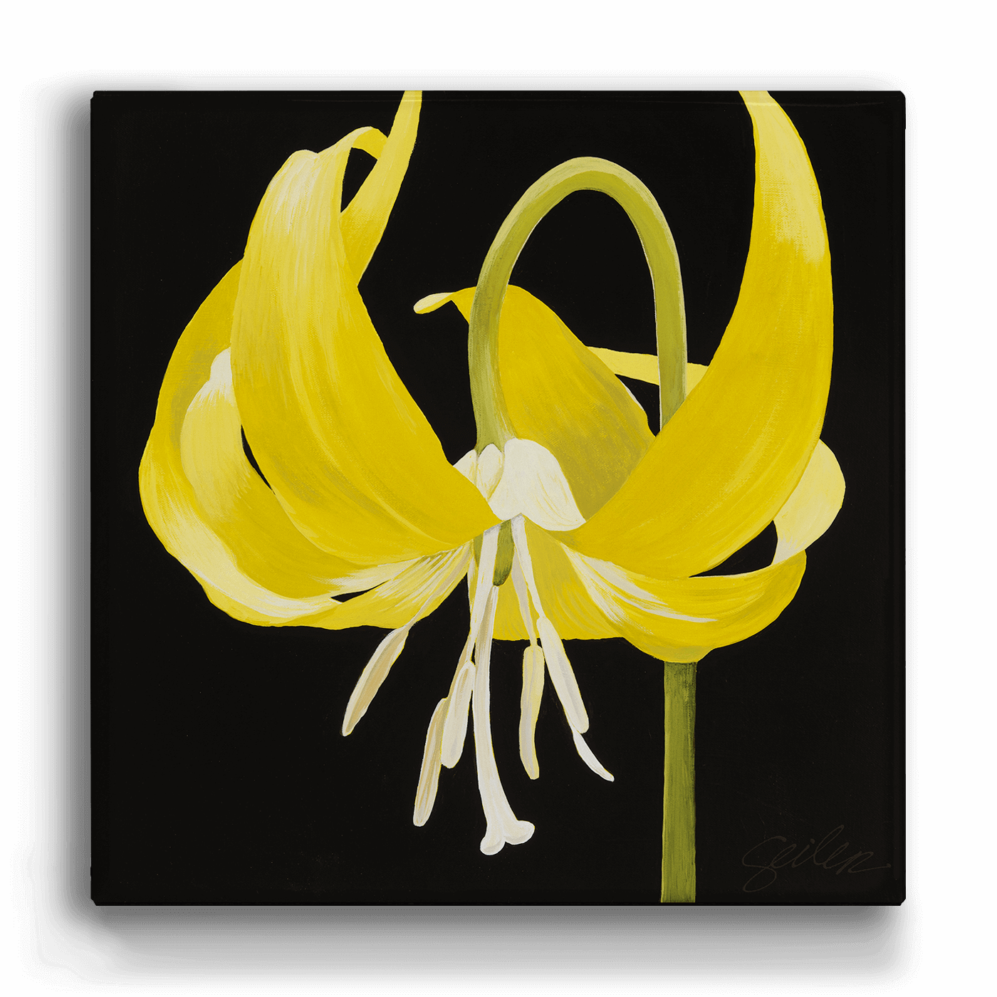 Introducing 'Glacier Lily', a radiant portrayal of the striking flower known for gracing mountain meadows. The painting's bright yellow tones and elegant form are set against a stark black background, capturing the lily's wild beauty. A perfect piece to brighten any room, it's a must-have for those who cherish the delicate balance of nature's artistry