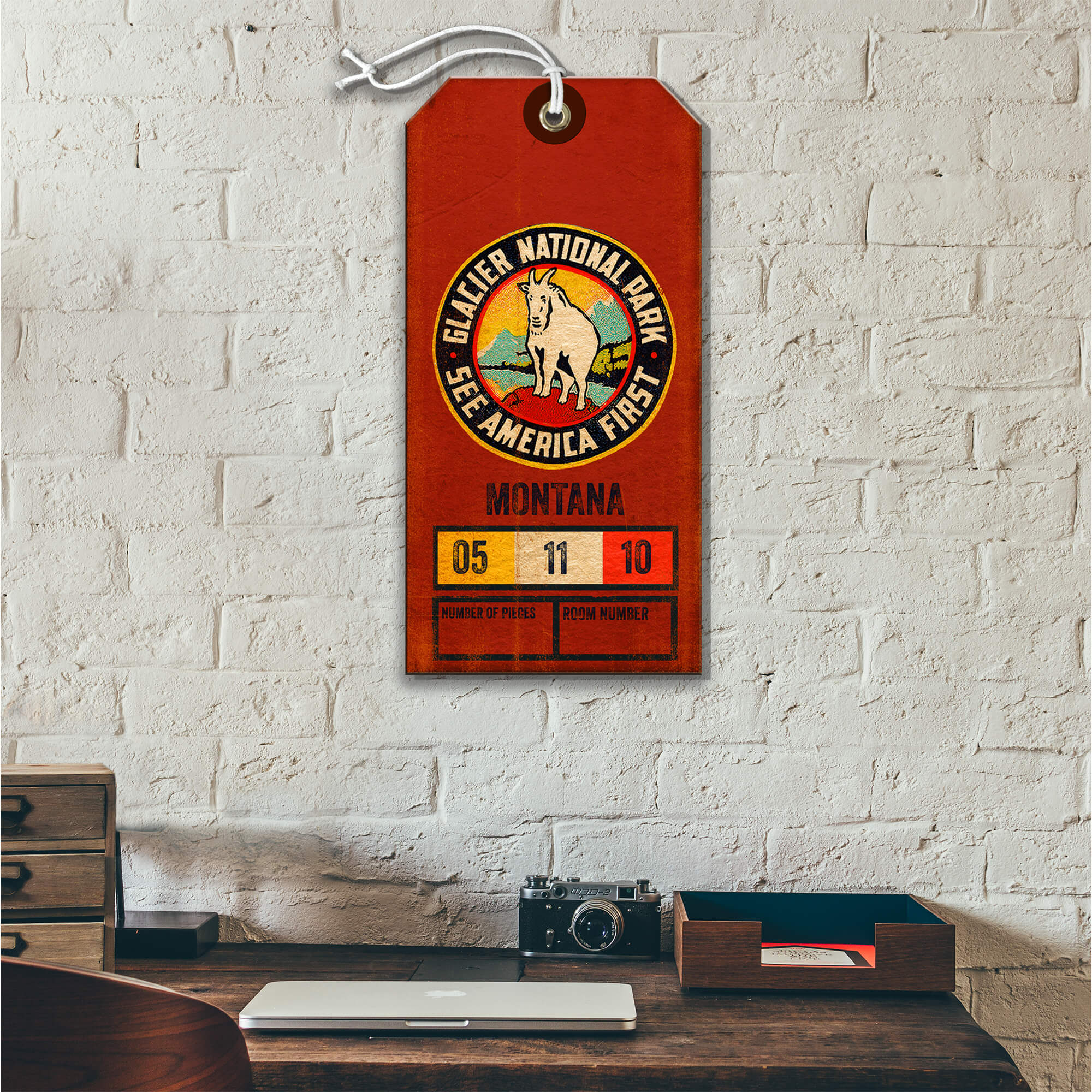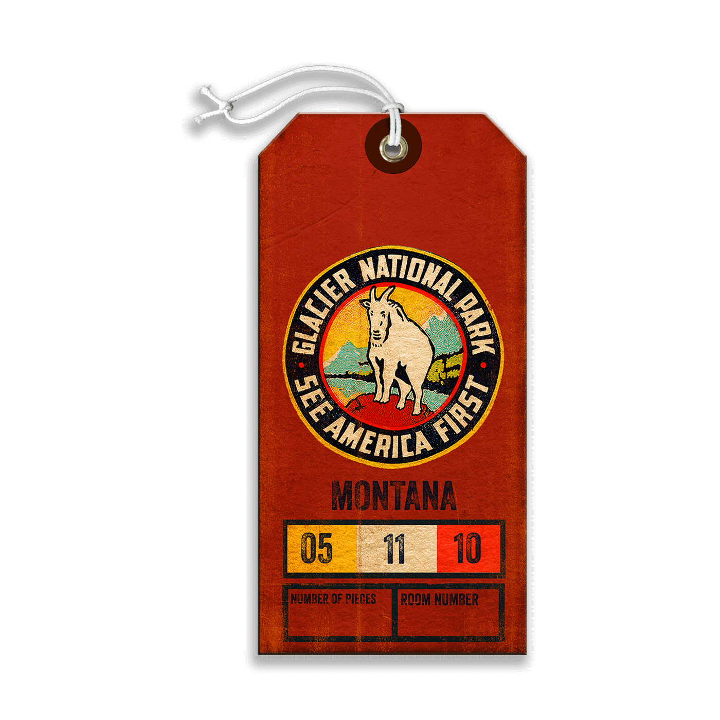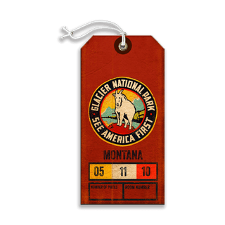 This artwork features a vintage-inspired luggage tag design that proudly showcases Glacier National Park. With its earthy colors and retro typography, the piece evokes the spirit of adventure and the natural beauty of this iconic Montana destination. The design highlights the park's famous mountain goat symbol, surrounded by majestic mountain landscapes, embodying the rugged charm of Glacier National Park. Perfect for travel enthusiasts and nature lovers alike, this artwork adds a touch of nostalgia and wanderlust to any room.