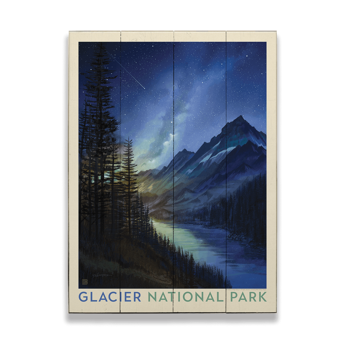 This evocative artwork presents a starlit spectacle over Glacier National Park, where the night sky comes alive with a celestial glow, illuminating the rugged mountain landscape and the serene lake below. The silhouetted pines stand tall, witnessing the tranquil beauty of nature's nighttime display. This piece is a tribute to the park's breathtaking nocturnal ambiance, inviting onlookers to marvel at the wonders that unfold when day turns to night.