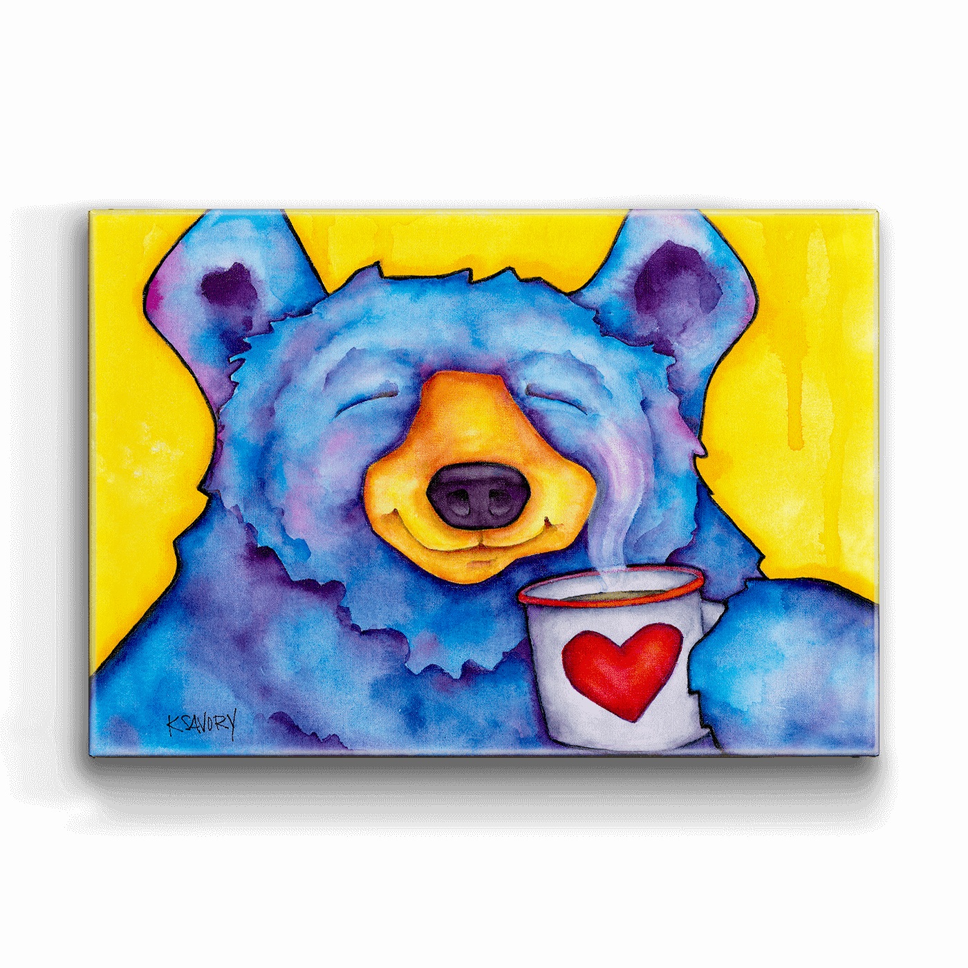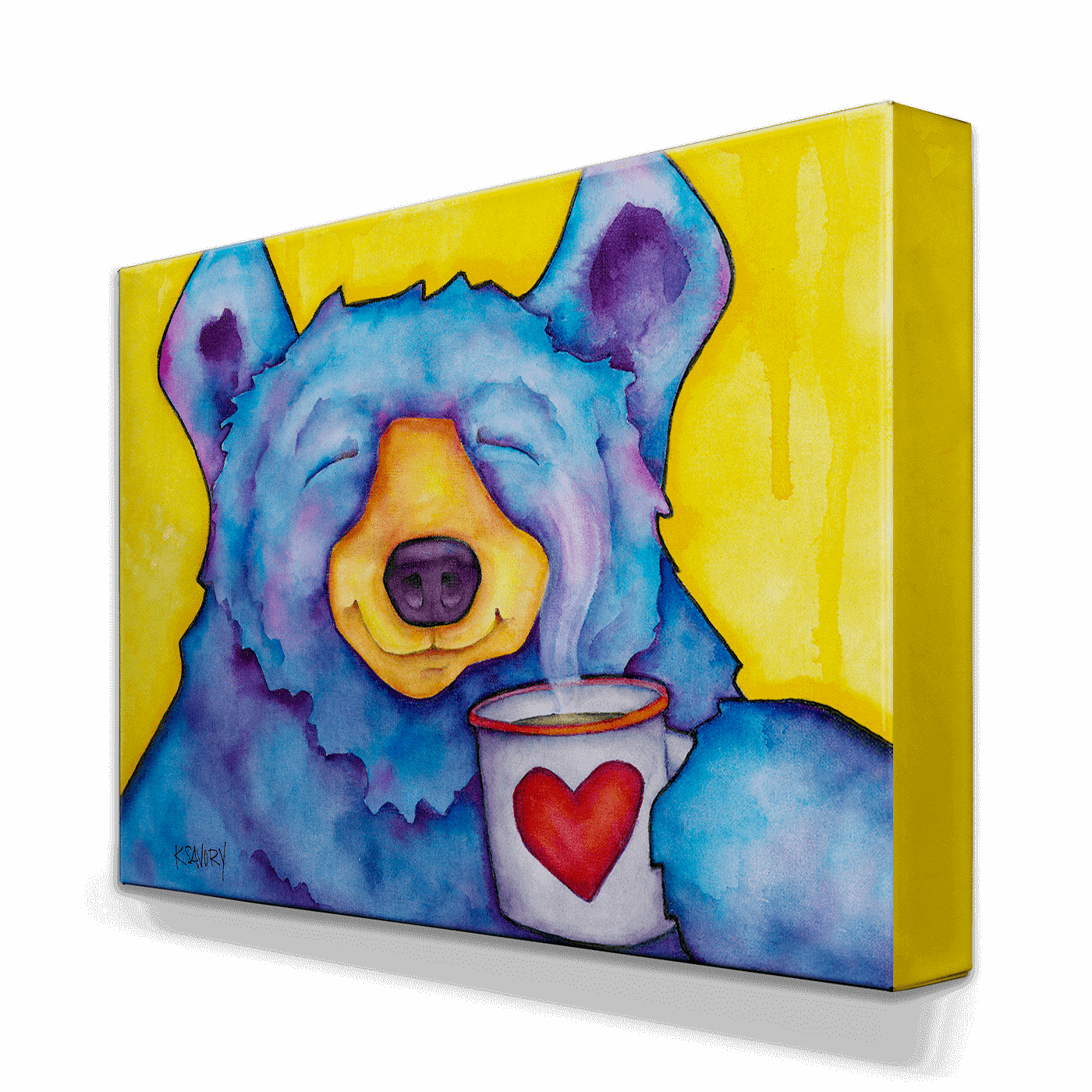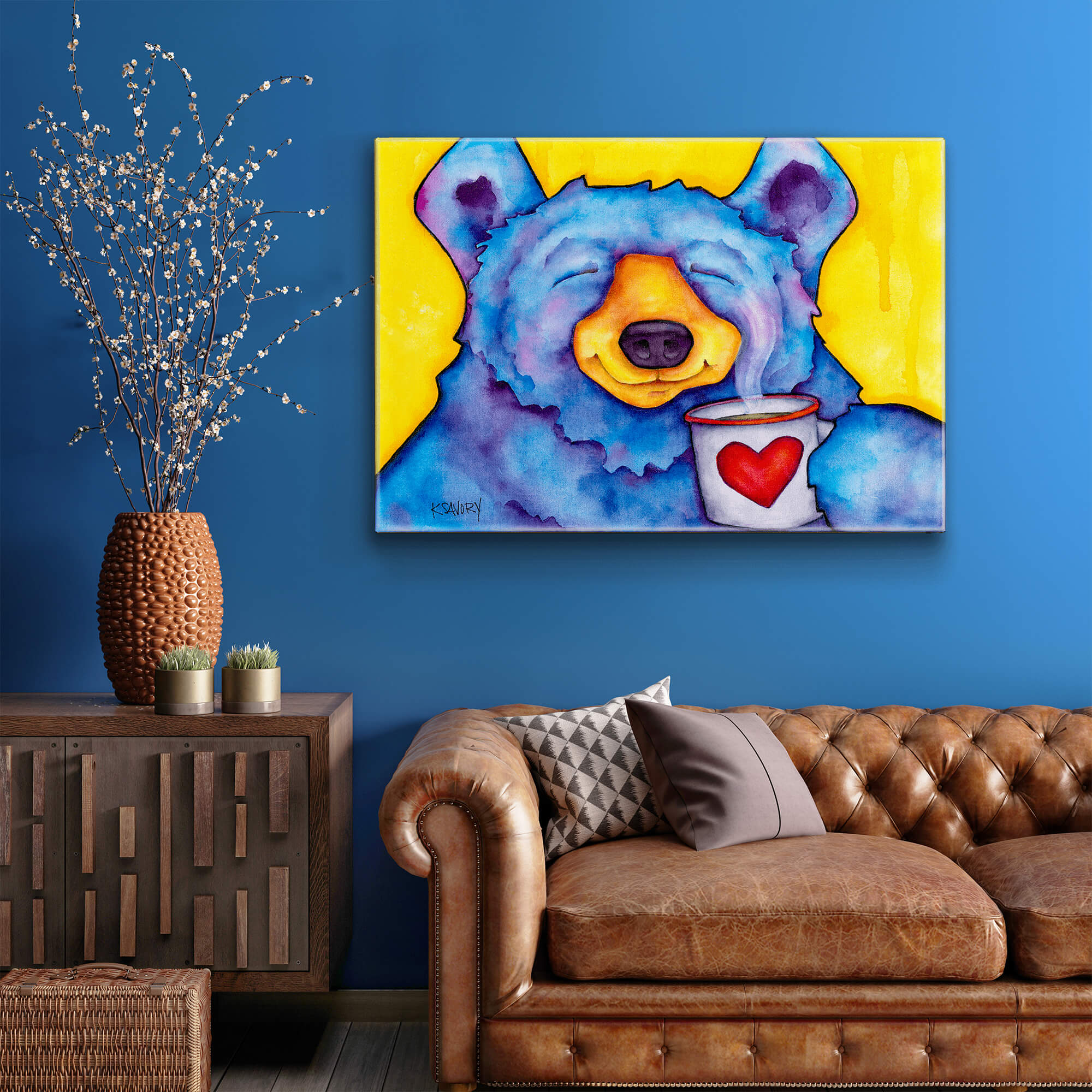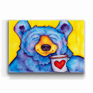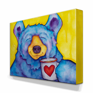 Brighten your day with this joyful and heartwarming watercolor painting of a blue bear blissfully enjoying a hot beverage. The vibrant yellow background enhances the soothing blues of the bear’s fur, emphasizing the serene and comforting mood of the piece. This artwork captures the simple pleasures of life, perfect for anyone looking to bring a touch of coziness and cheer into their home. It’s an ideal choice for cafes, kitchens, or any space that could use a splash of warmth and happiness.
