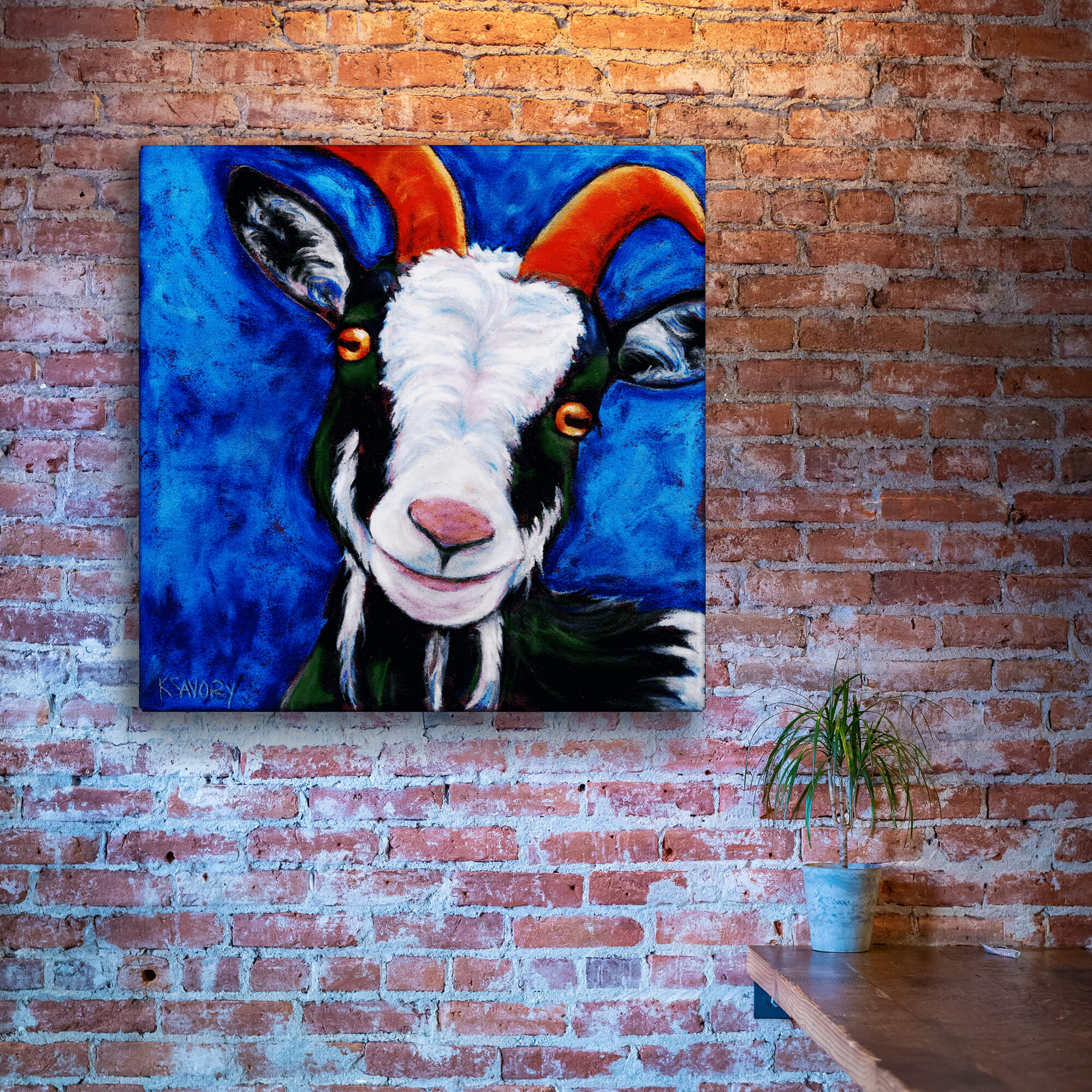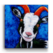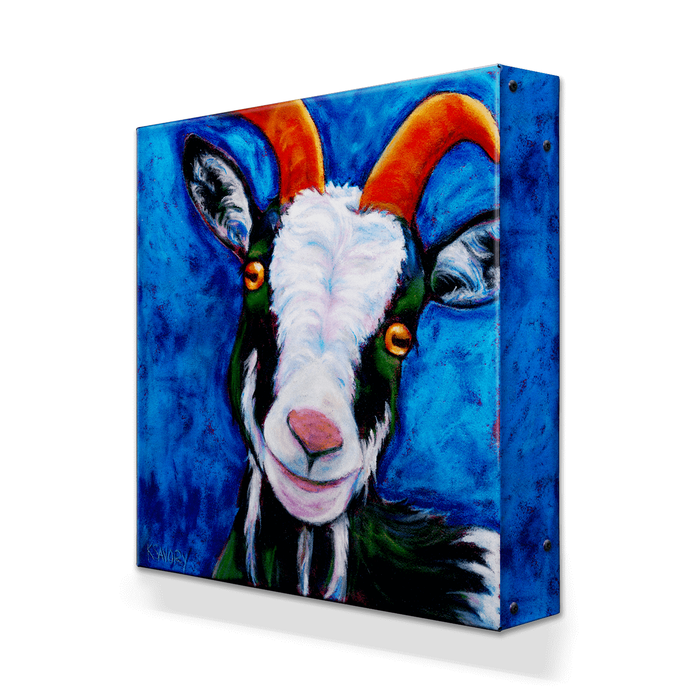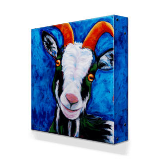 This vibrant goat artwork captures the playful charm and personality of the animal with bold colors and expressive details. The deep blue background contrasts with the goat’s warm orange horns and lively eyes, giving the piece a captivating and whimsical energy. Perfect for adding a pop of color and character to any space, this painting brings a joyful and lively touch to animal art lovers and fans of unique, colorful decor.