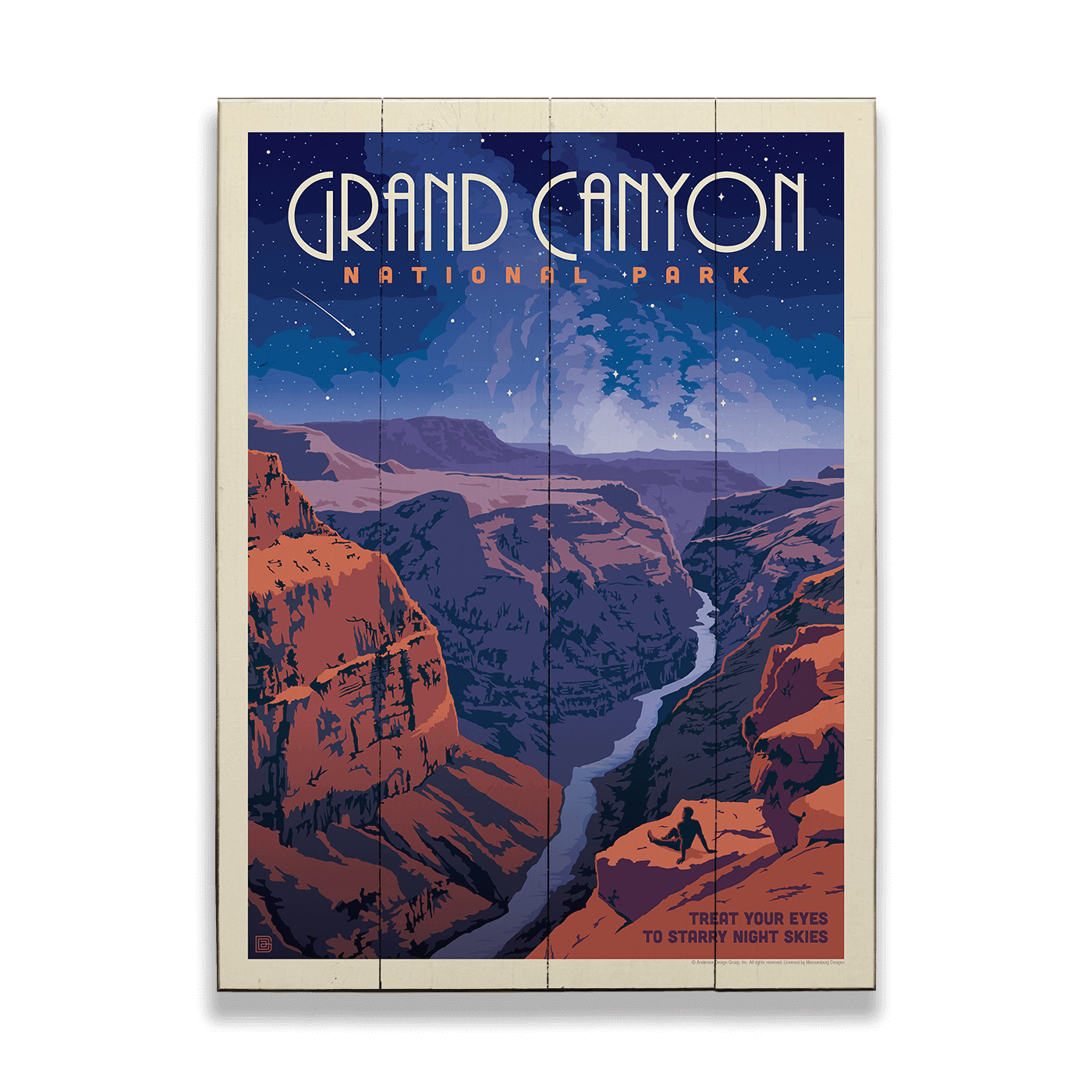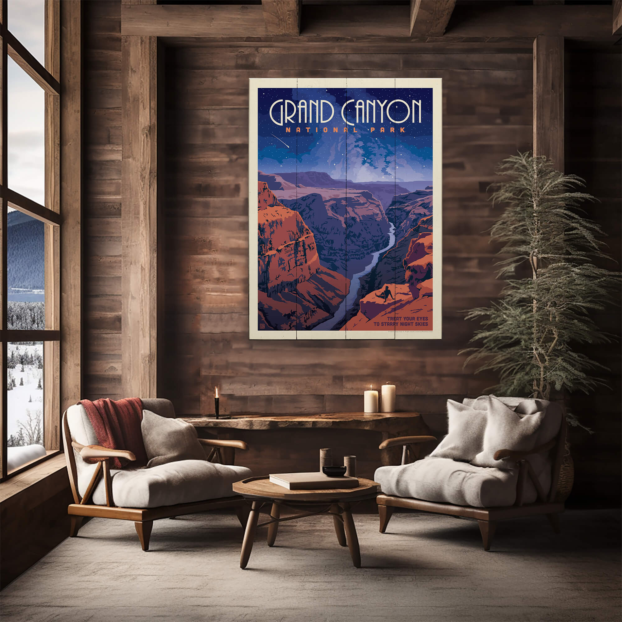 Gaze upon the starlit majesty of Grand Canyon National Park with this enchanting artwork that captures the park's nocturnal beauty. As dusk turns to night, the sky above the canyon is a canvas of stars, offering a celestial spectacle that enchants and inspires. This print, with its deep blues and contrasting warm tones of the canyon walls, embodies the quiet, mystical experience of the Grand Canyon under a night sky. The silhouette of a lone observer is a powerful reminder of our place in the universe. Perfect for stargazers and nature lovers.