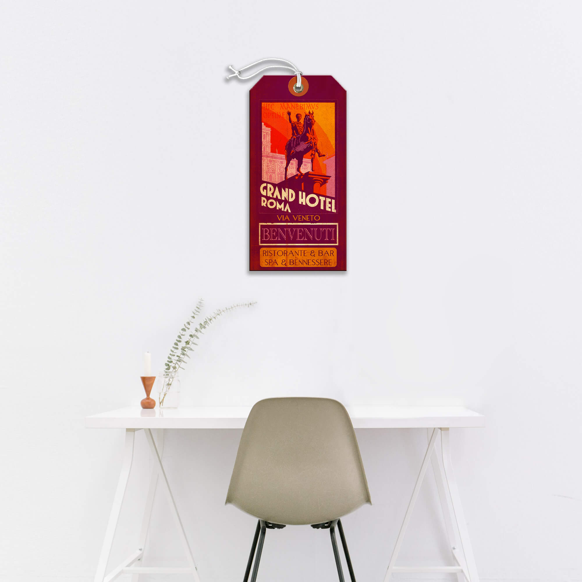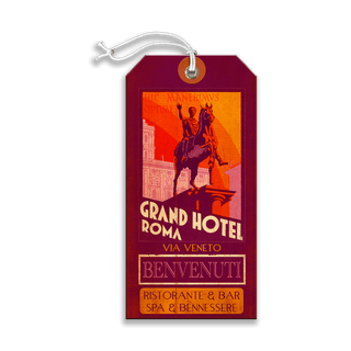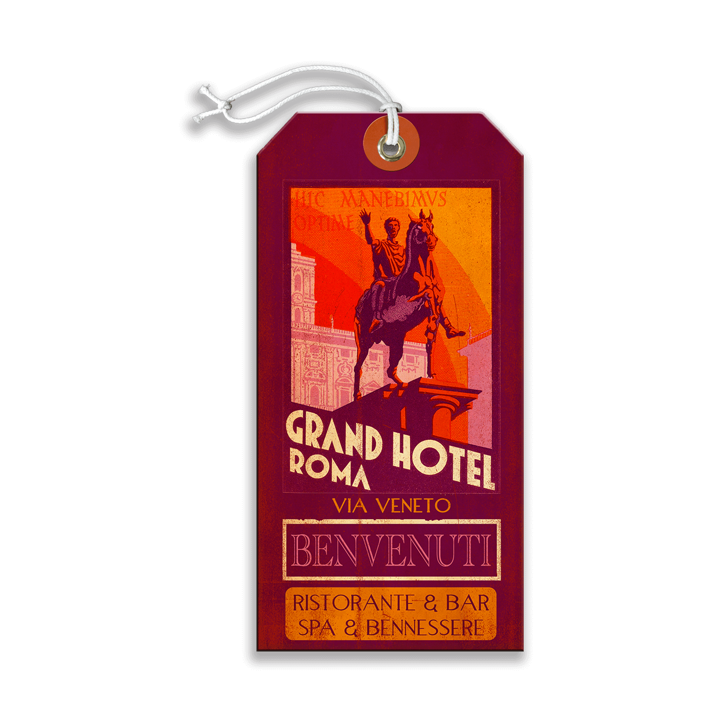 This artwork features a vintage-inspired luggage tag design for the Grand Hotel in Rome, Italy. Highlighting the iconic Via Veneto, the piece captures the timeless beauty and grandeur of the Eternal City. With its rich colors and classic imagery, this artwork evokes the luxurious experience of staying at one of Rome's most renowned hotels. Perfect for travel enthusiasts or those with a love for Italian culture, this piece adds a touch of sophistication and nostalgia to any space.
