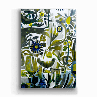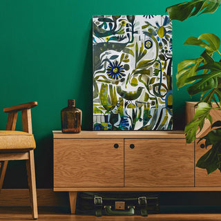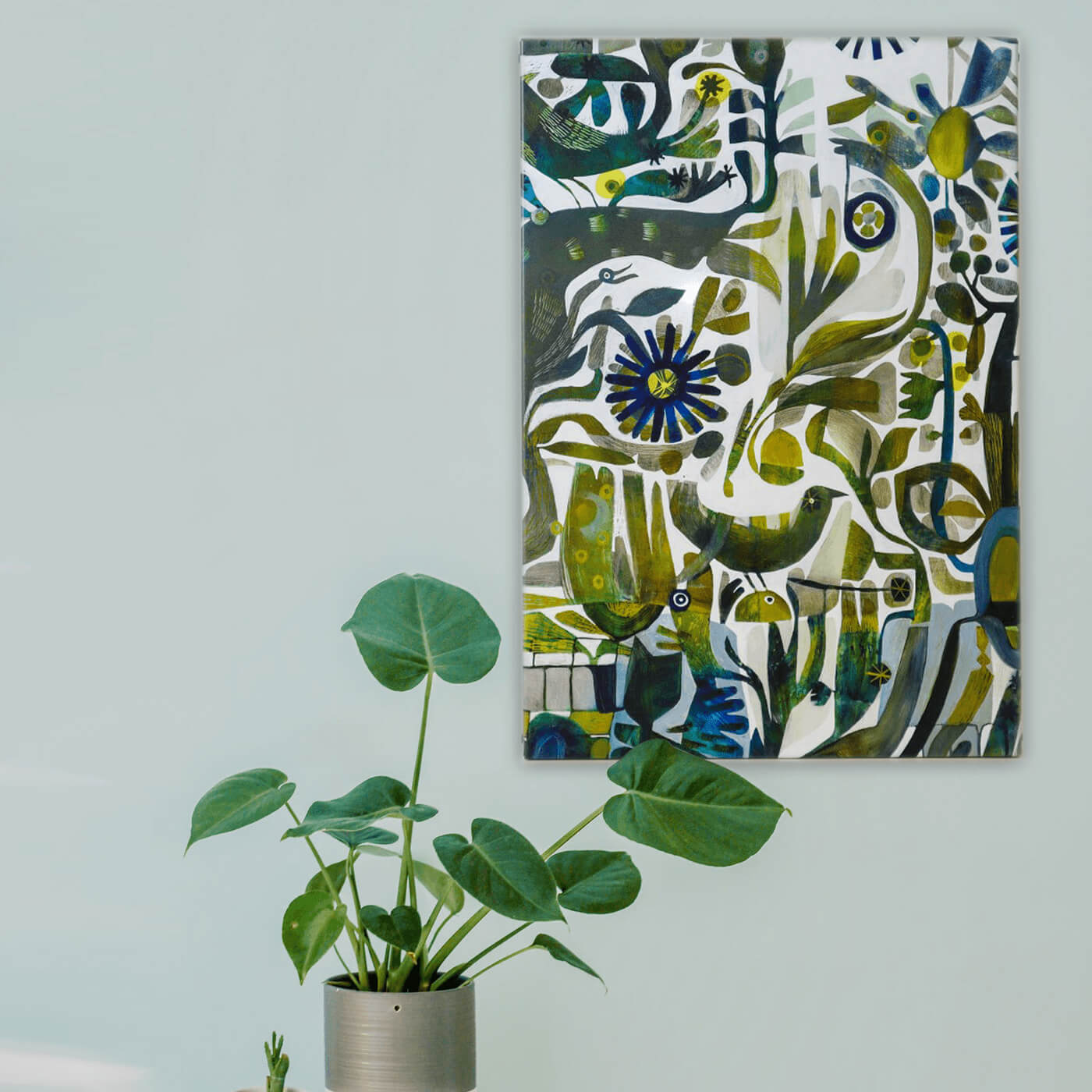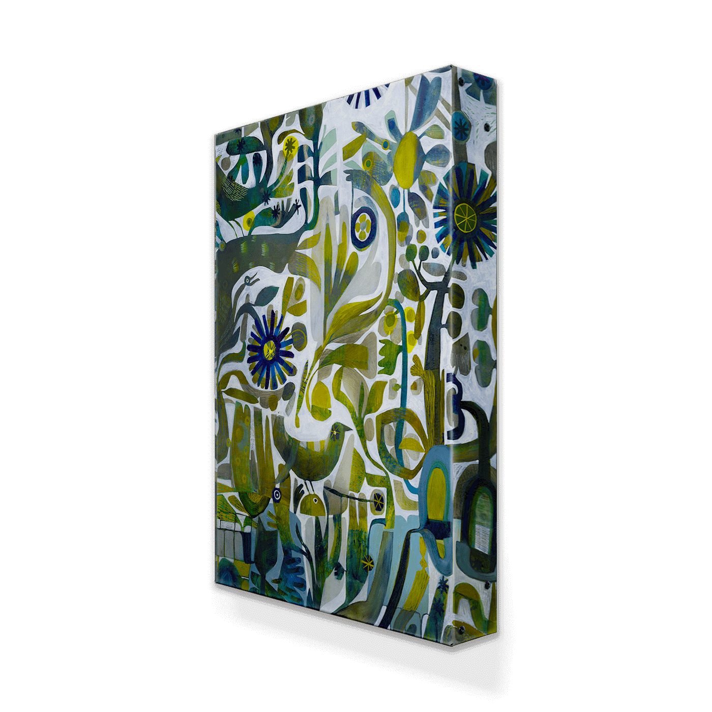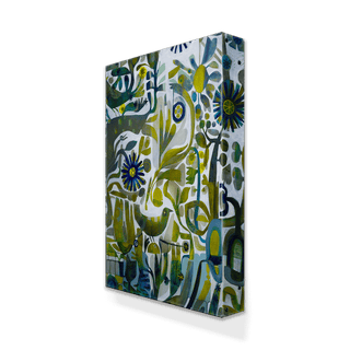 This unique artwork, printed on a piece of aluminum and crafted into a shallow box, draws the eye with its stylized, organic forms and a soothing palette that speaks to Esté's expertise in textile and ceramic design. The dark tones are enlivened with splashes of yellow and blue, creating a serene yet dynamic composition. "Grigio" stands as an ode to the natural world's subtle beauty, offering a tranquil yet joyous vision that would bring a sophisticated whimsy to any art collection or living space.