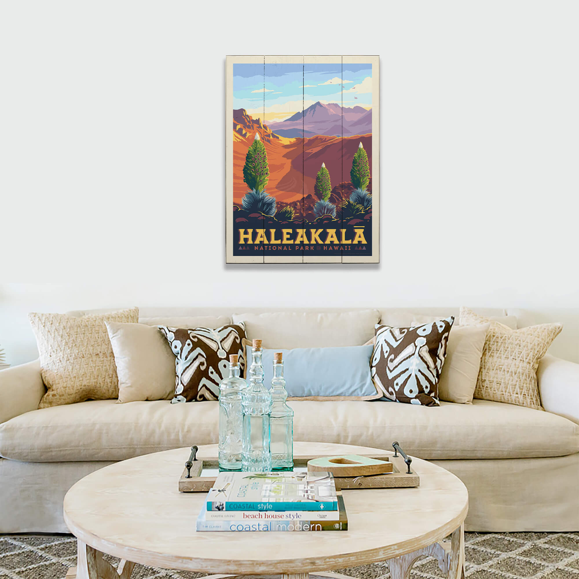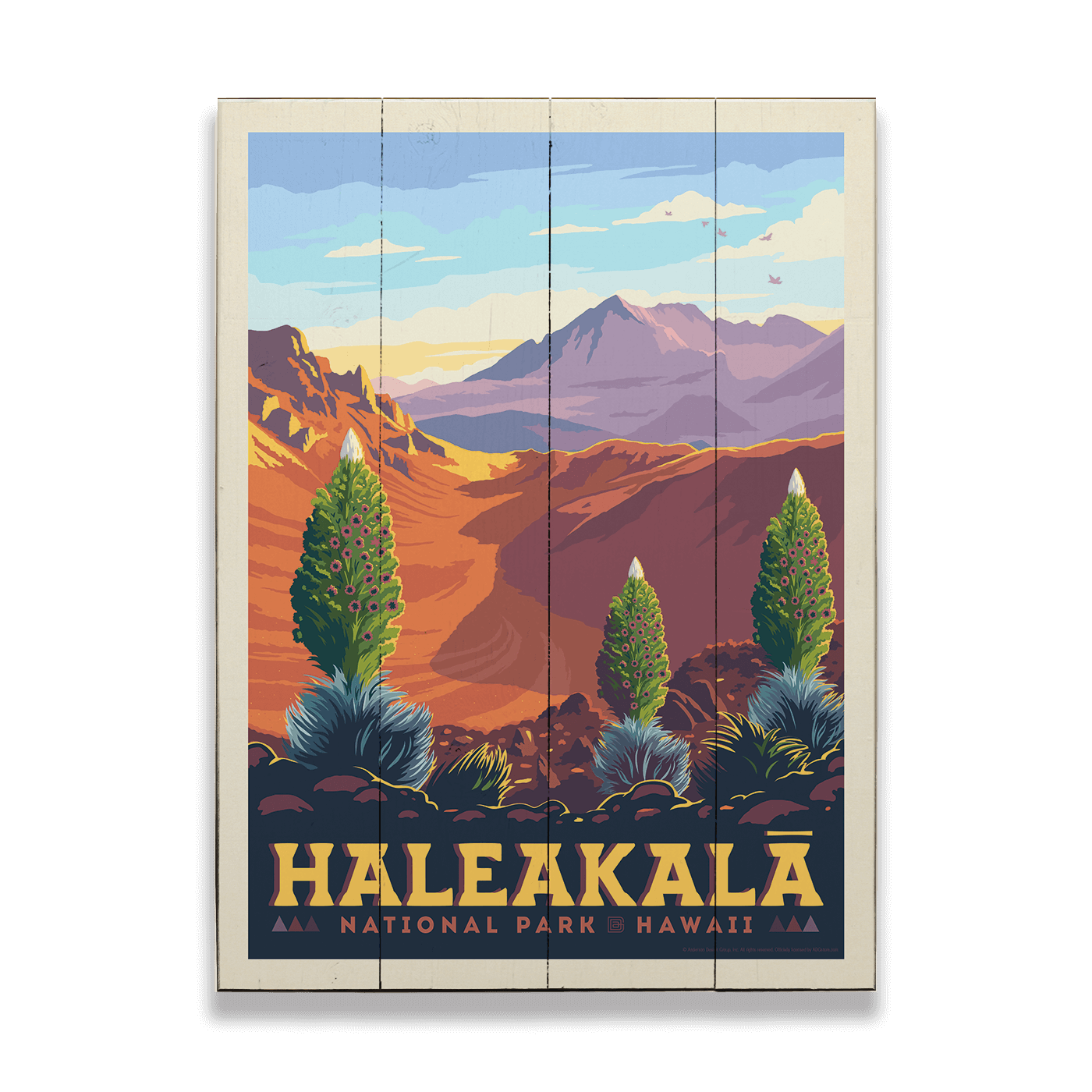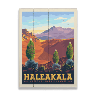 Experience the striking contrast of Haleakalā’s volcanic landscape with this vivid desert-inspired design. Towering silverswords bloom in the foreground, their rare and radiant forms standing out against the rugged terrain of crimson cinder cones and sweeping lava flows. In the distance, the sun casts warm hues across the mountain ridges, highlighting the vastness and solitude of the summit region. This artwork captures the raw beauty and otherworldly stillness that define one of the most unique ecosystems in the world.
