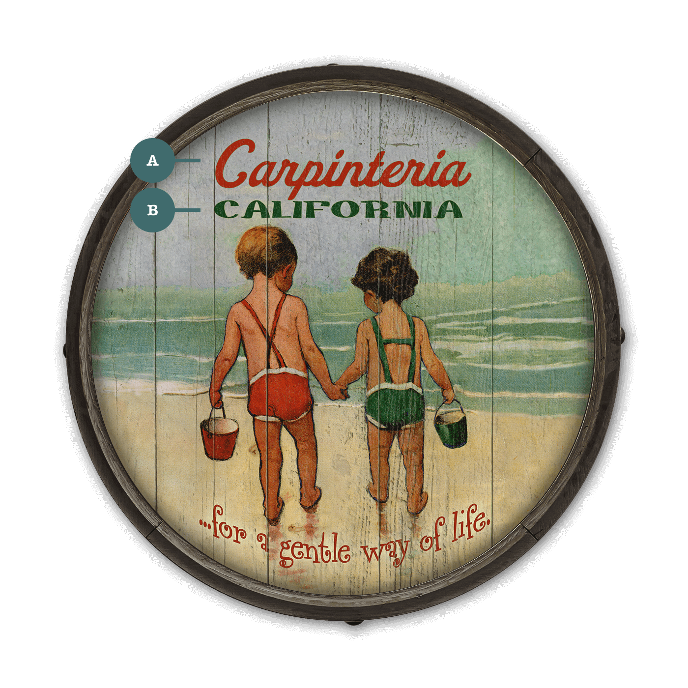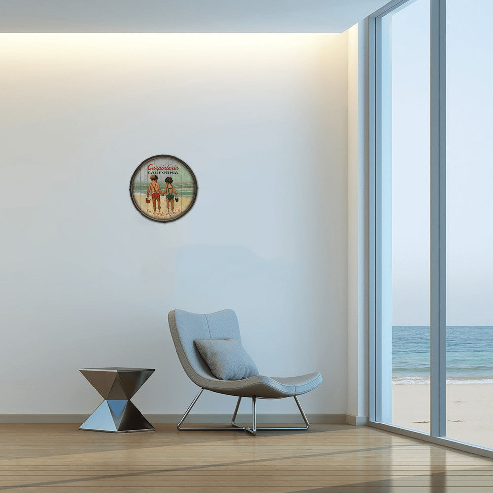 Immerse yourself in this evocative barrel-end artwork, capturing the essence of a carefree coastal lifestyle. The piece features two children, hand-in-hand, as they venture towards the ocean waves. Their relaxed posture and the gentle splash of water around their feet evoke a sense of timeless summer days spent by the sea. The artwork's vintage style and warm, earthy tones enhance its nostalgic appeal, making it a perfect decorative element for anyone who cherishes the simple joys of beach life.