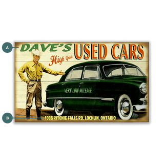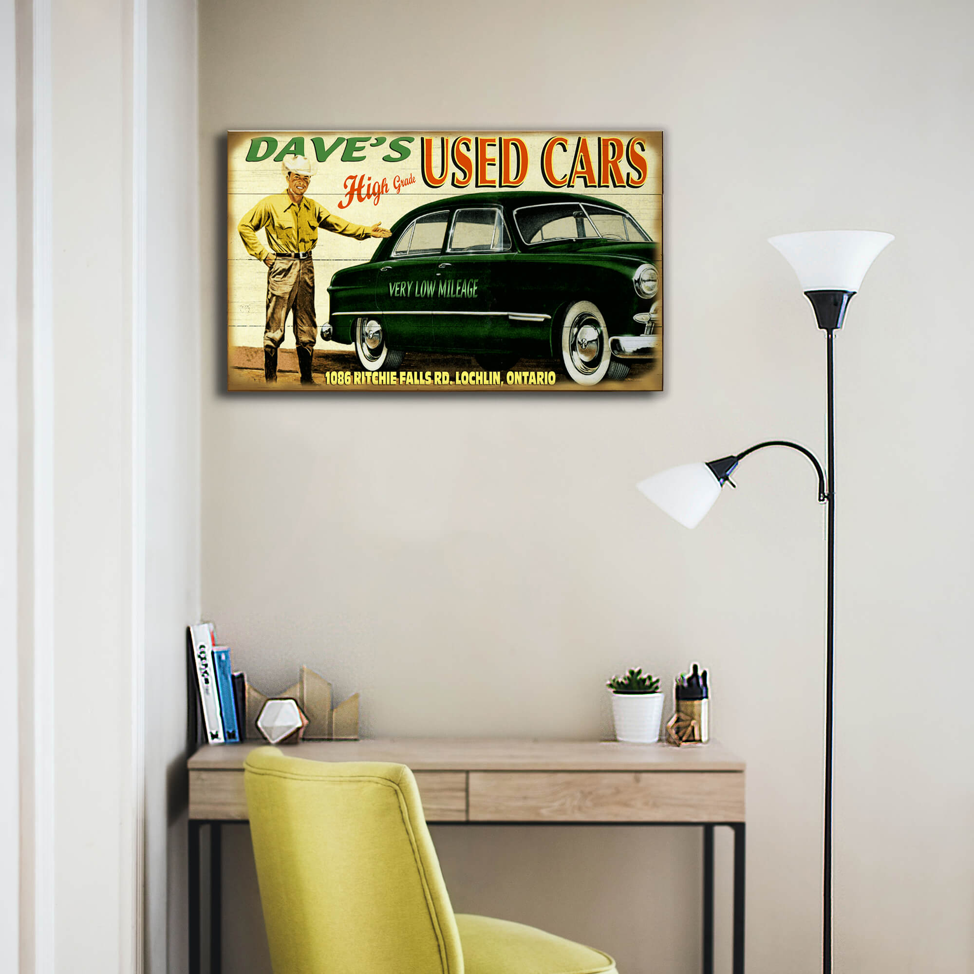 Discover the charm of classic car buying with our "High Grade Used Cars" print, a delightful nod to vintage auto sales. Featuring a friendly and trustworthy salesman in front of a sleek, high-grade used car with "very low mileage," this artwork perfectly captures the essence of mid-20th-century car advertisements. This car salesman offers a promise of quality and value, appealing to car enthusiasts and vintage art collectors alike. Ideal for decorating automotive businesses or adding a retro touch to personal spaces, this artwork combines nostalgia with the allure of finding that perfect old-school ride.