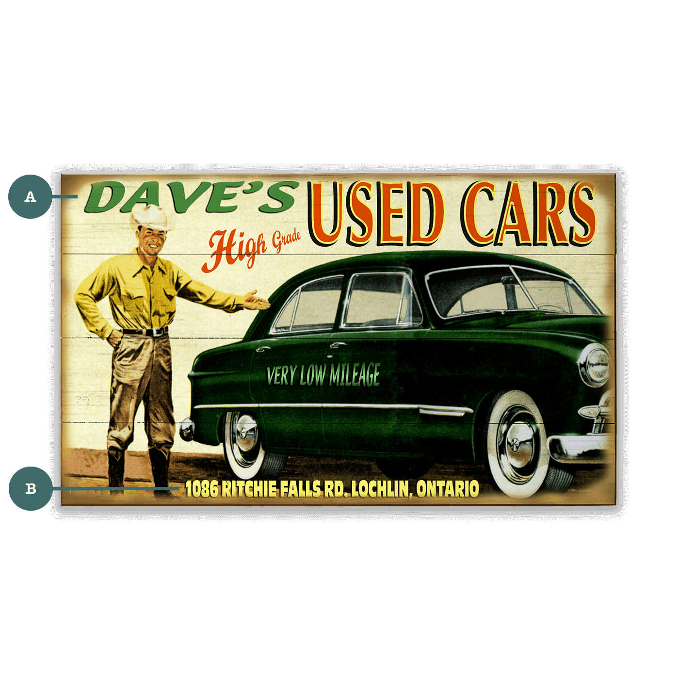 Enjoy complimentary personalization for this piece, meticulously handcrafted by our graphic design team. Specify your desired text for points A and B. To ensure perfection in your custom piece, please verify your text carefully. Missing personalization information will revert to our default design as shown. To remove all text from a field, type "Remove" in that field.