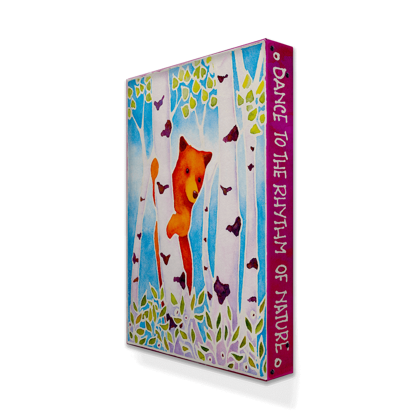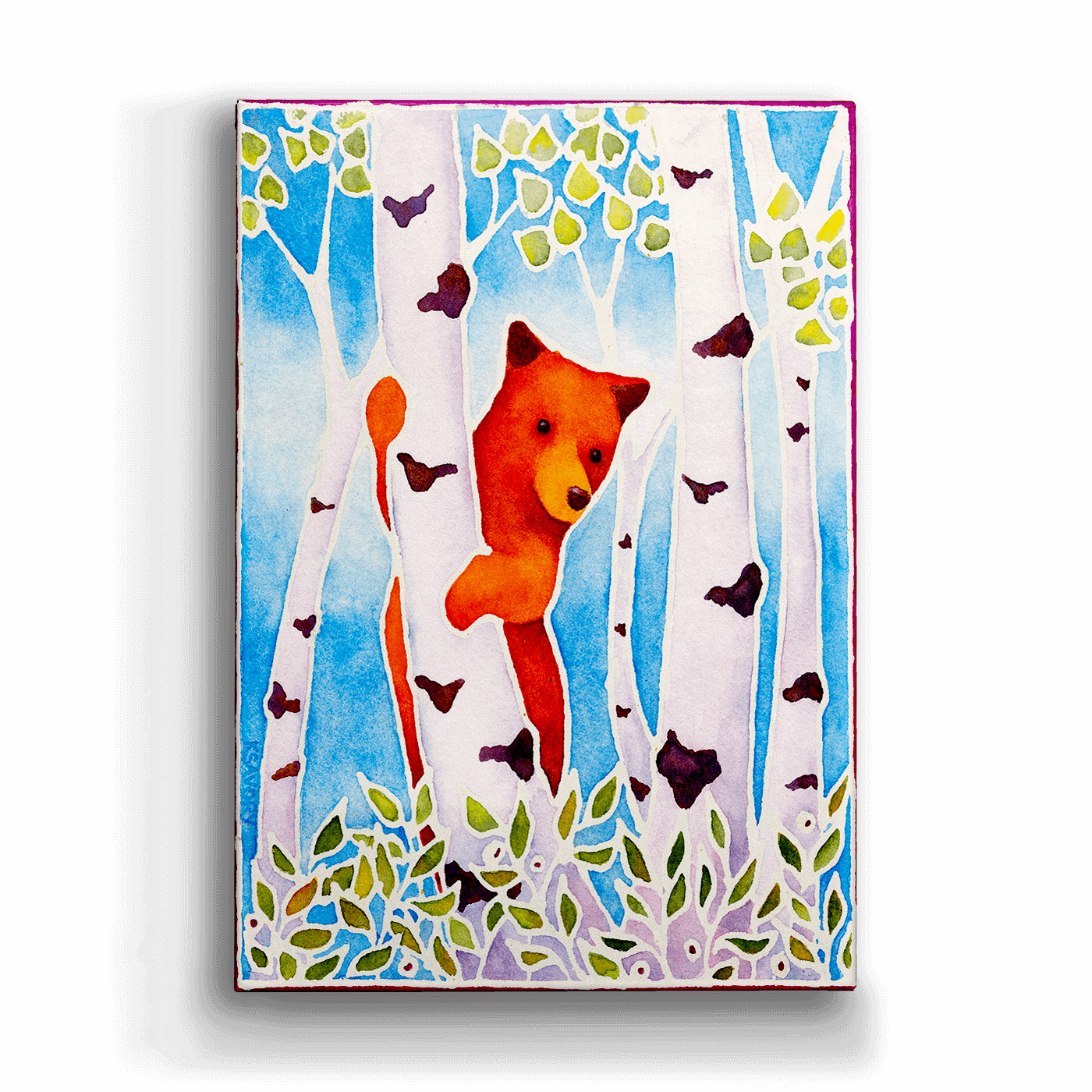 This enchanting painting captures the whimsical essence of nature through the depiction of a vibrant young bear amidst a serene birch forest. The artwork skillfully uses soft watercolor shades to create a dreamlike atmosphere, where light blue and white trees contrast with the playful pops of green leaves and dark brown bark, enhancing the magical feel. Perfect for adding a touch of charm and color to any room, this piece combines simplicity with a profound sense of tranquility and wonder. Ideal for those who appreciate nature and the arts, it makes a delightful addition to any art collection or a thoughtful gift for art lovers.