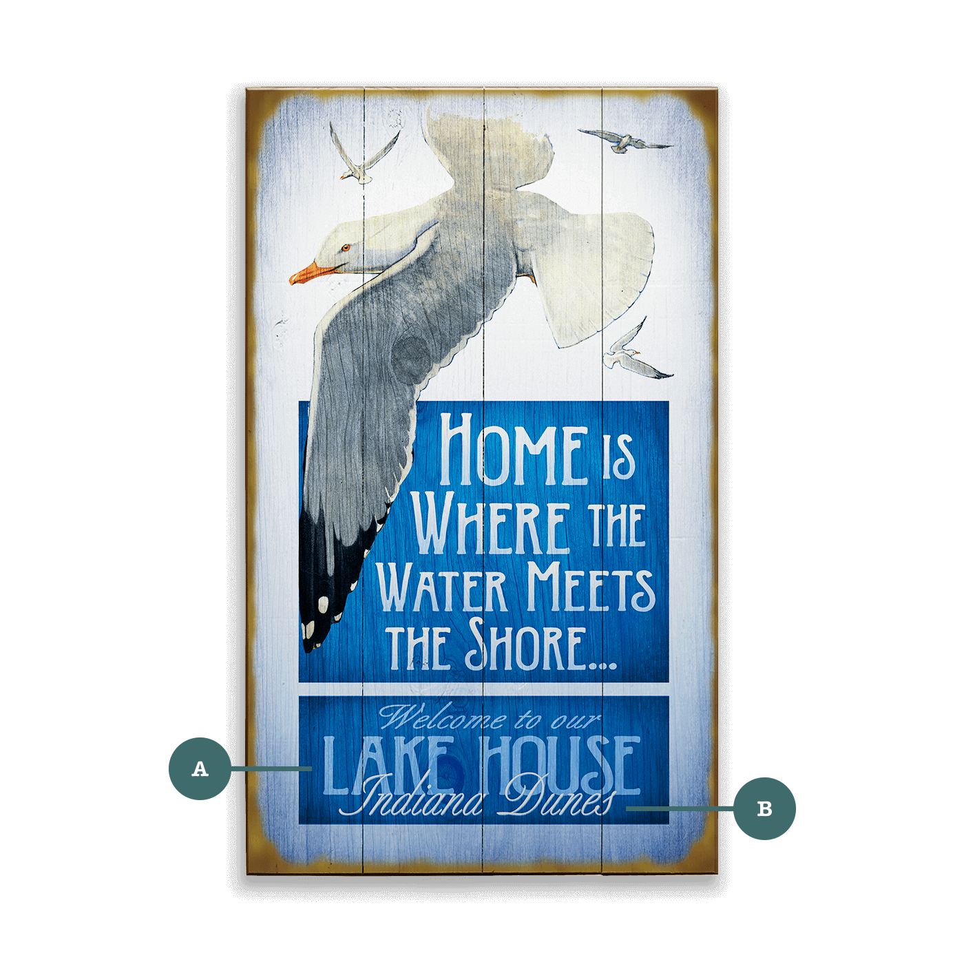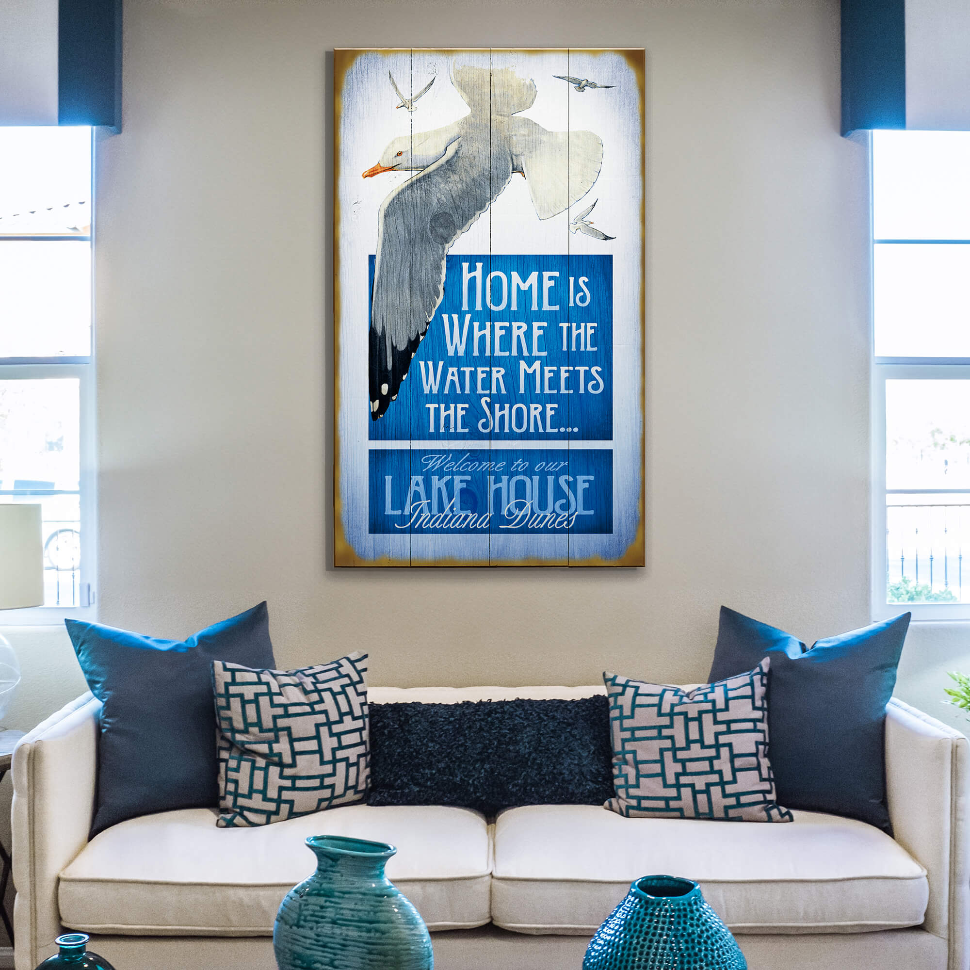 Embrace the tranquil beauty of lake living with this charming artwork, ideal for any lake house or coastal decor. The design features an elegant seagull in flight over a serene blue background with the heartfelt quote, 'Home is where the water meets the shore.' This piece not only adds a touch of nature's grace to your space but also warmly welcomes everyone to your lake house at Indiana Dunes.