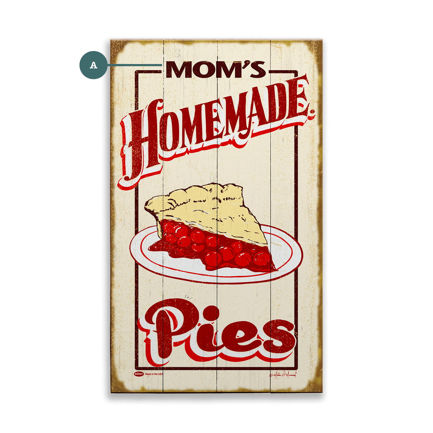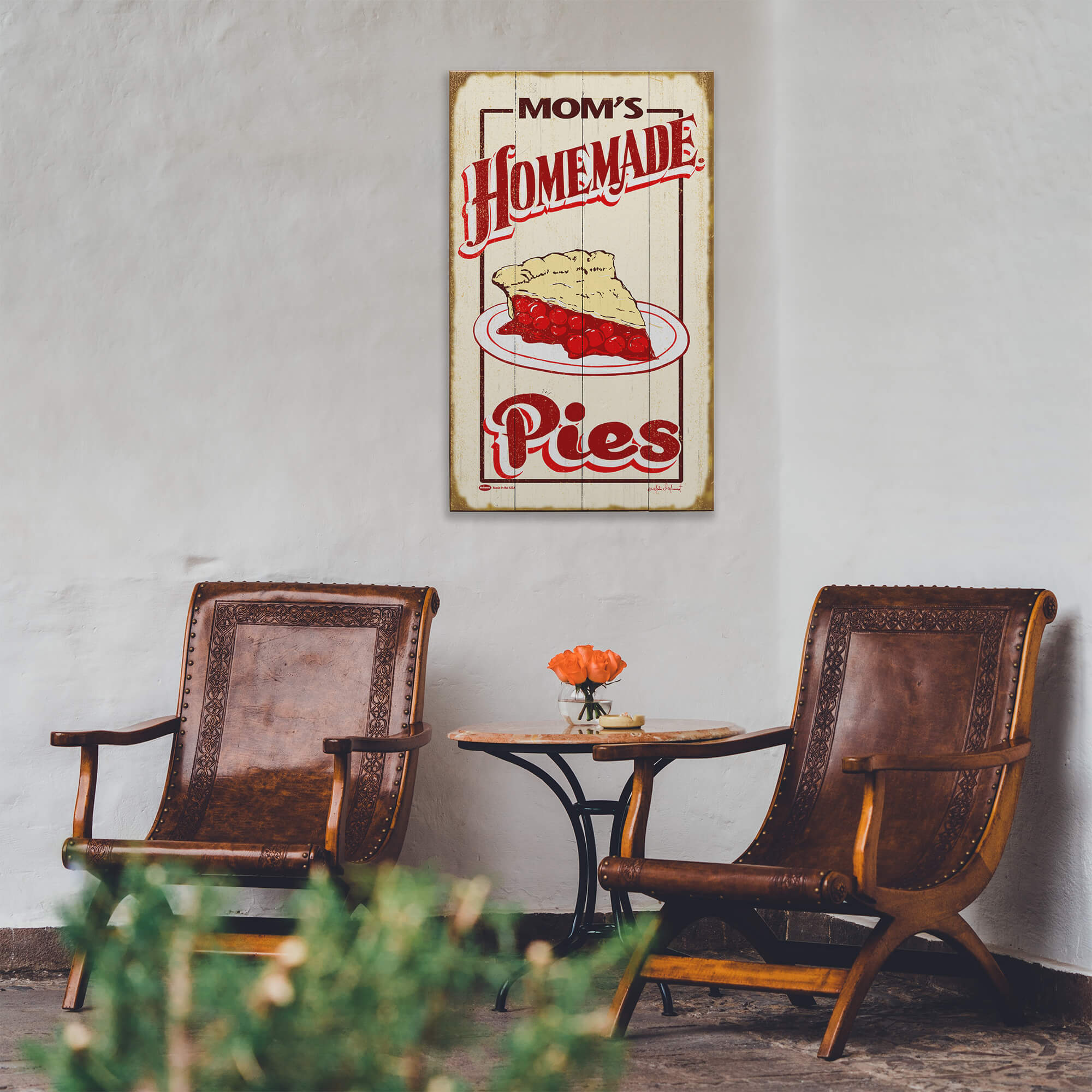 Warm, inviting, and full of nostalgia, this piece brings to life the comforting tradition of homemade pies. Bold, vintage-style lettering and a classic illustration of a golden, flaky-crusted cherry pie evoke the charm of old-fashioned diners and cozy family kitchens. The aged background adds a rustic touch, making it feel like a well-loved sign from a beloved hometown bakery. Perfect for kitchens, cafés, bakeries, or any space that celebrates the joy of fresh-baked goodness, this artwork serves up a slice of home and heartwarming memories.