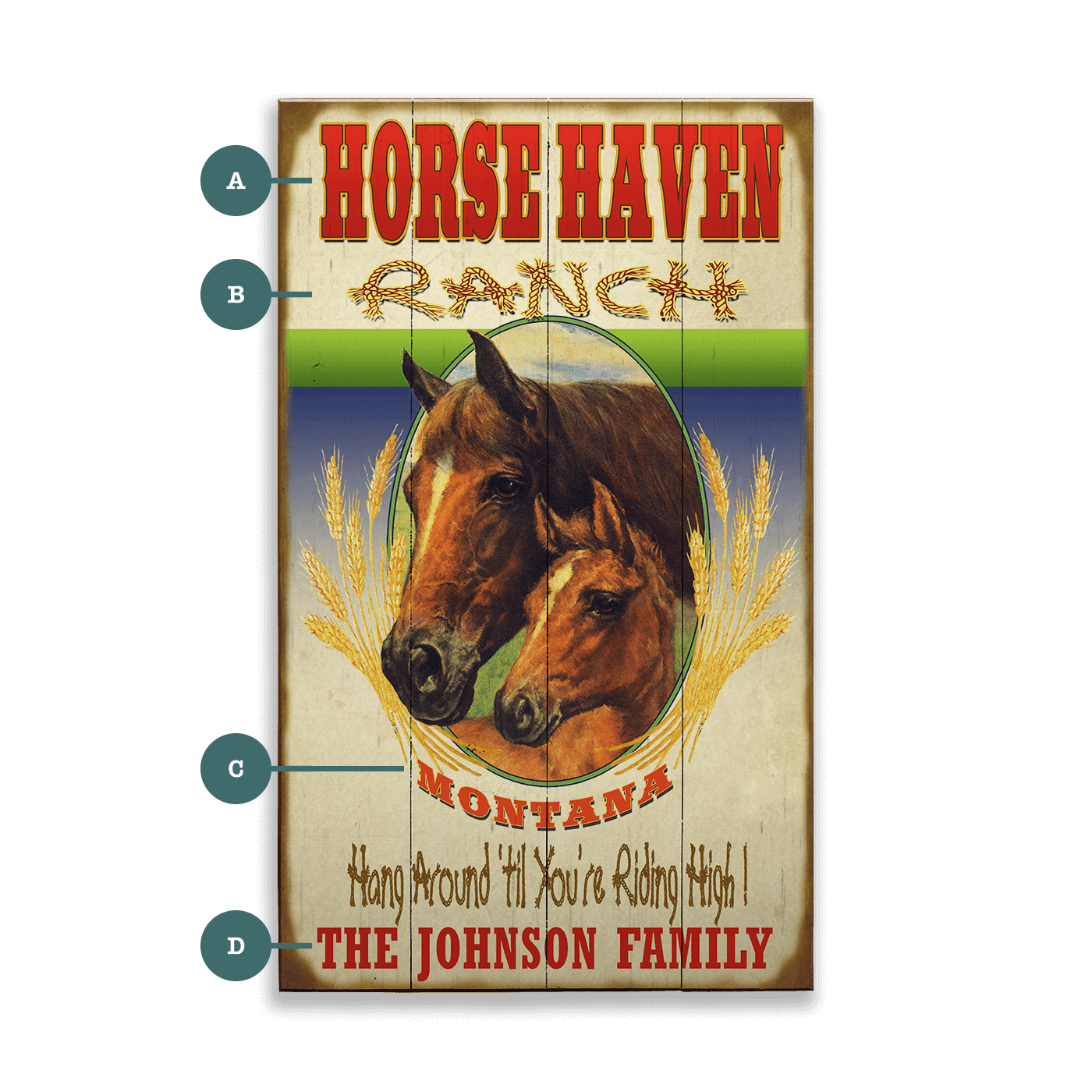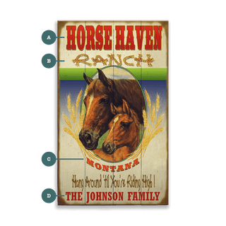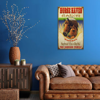 This vintage-style artwork captures the warmth and charm of ranch life with a beautifully detailed portrait of a horse and foal. The rustic design, bold typography, and classic western elements create a welcoming feel, evoking the deep connection between people and their horses. The distressed finish adds nostalgic appeal, making it an ideal piece for equestrian lovers, ranch owners, and those who appreciate country living. Perfect for barns, stables, or western-themed spaces, this artwork brings the spirit of horsemanship and the open range into any setting.