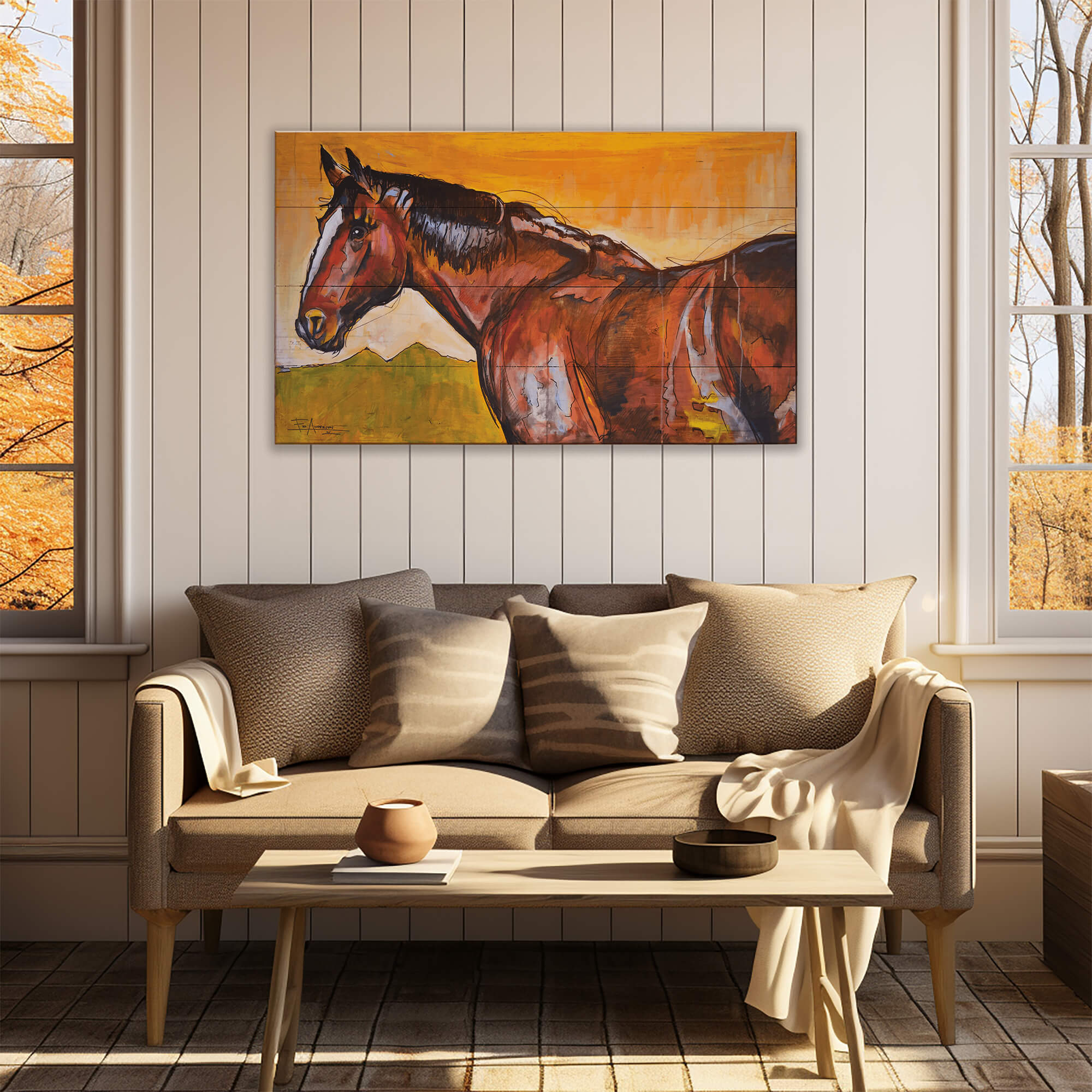 This striking painting features a majestic horse, captured in rich, warm hues, with expressive brushwork emphasizing its muscular form and lively demeanor. The dark mane flows freely, contrasting with the horse's reddish-brown coat. The white blaze running down the horse's forehead, adds character to its gentle gaze. The background, with a blend of yellow, orange, and green tones, suggests a warm, sunlit landscape that adds to the horse's sense of vitality and strength.