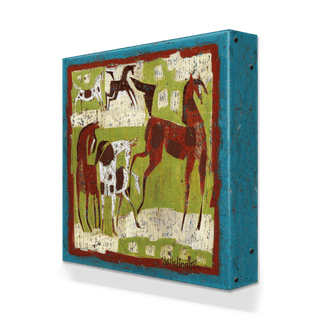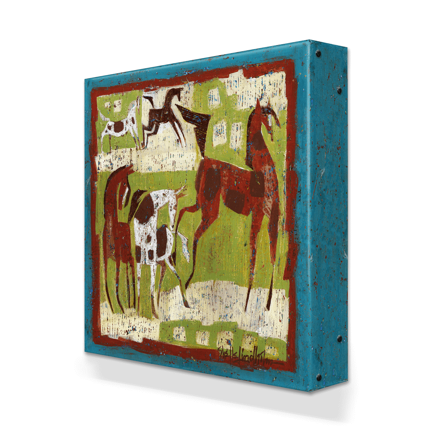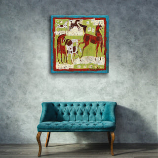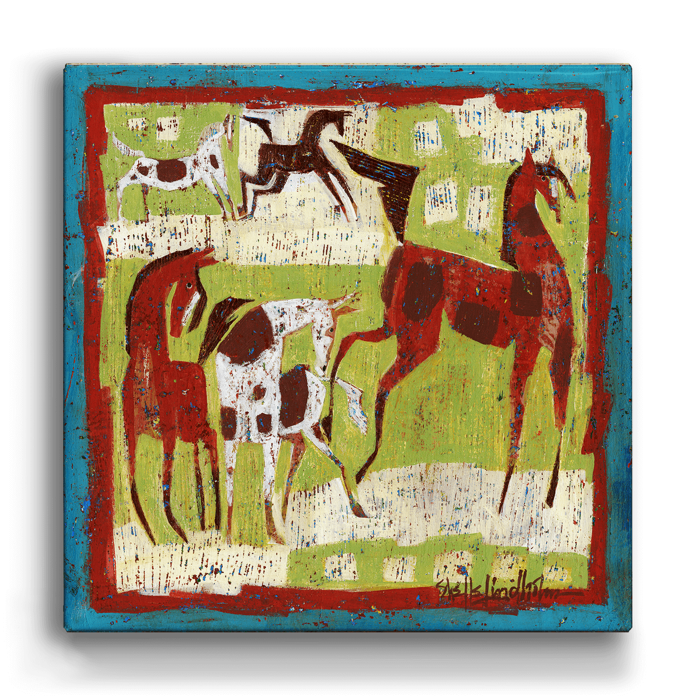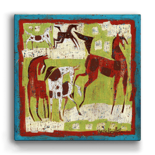 Celebrate the natural grace and dynamic beauty of horses with this lively artwork of a herd of spirited horses in motion, their forms adorned with bold patterns and earthy tones. Set against a textured green and cream background and framed by vibrant red and blue borders, the piece exudes energy and a sense of playful freedom. Perfect for equine enthusiasts and anyone inspired by the untamed spirit of the wild, this piece will bring a sense of cheer to any space.