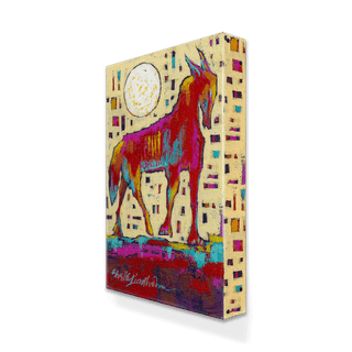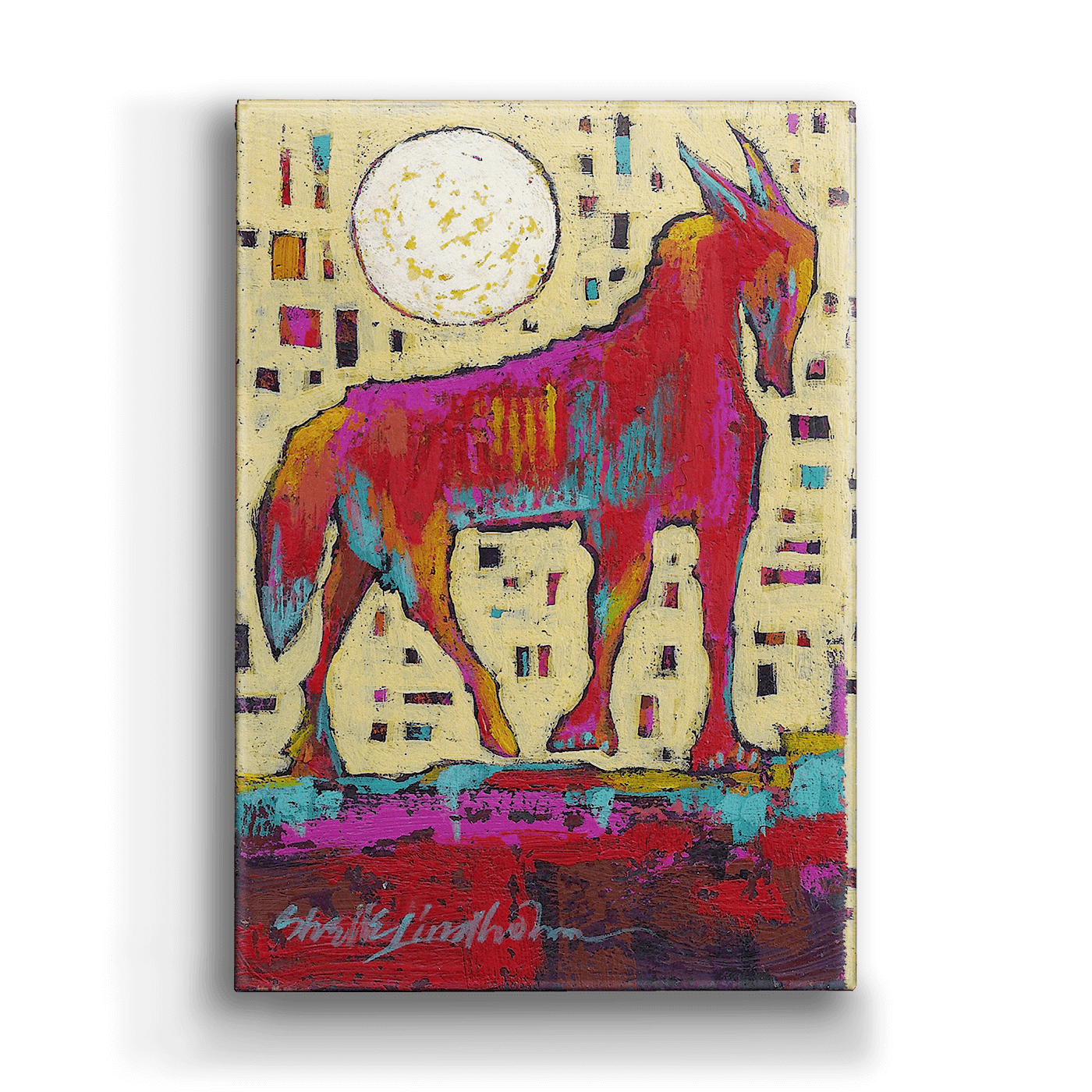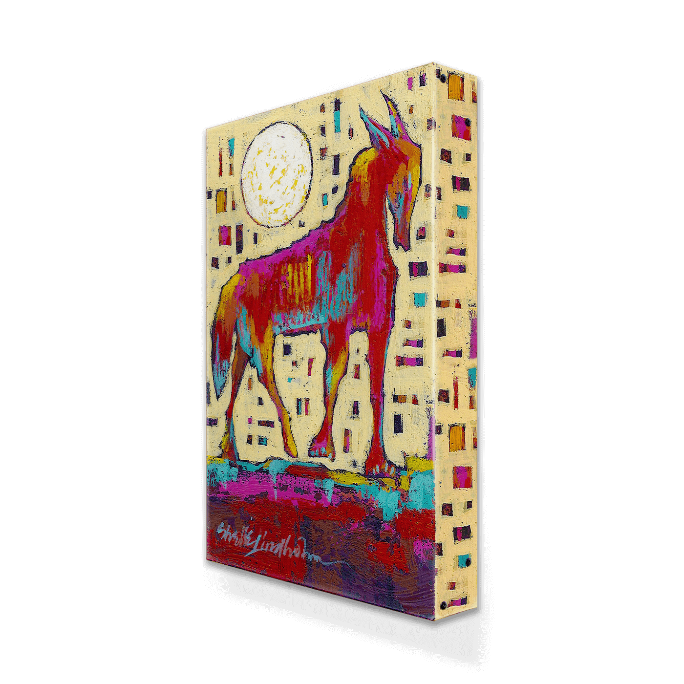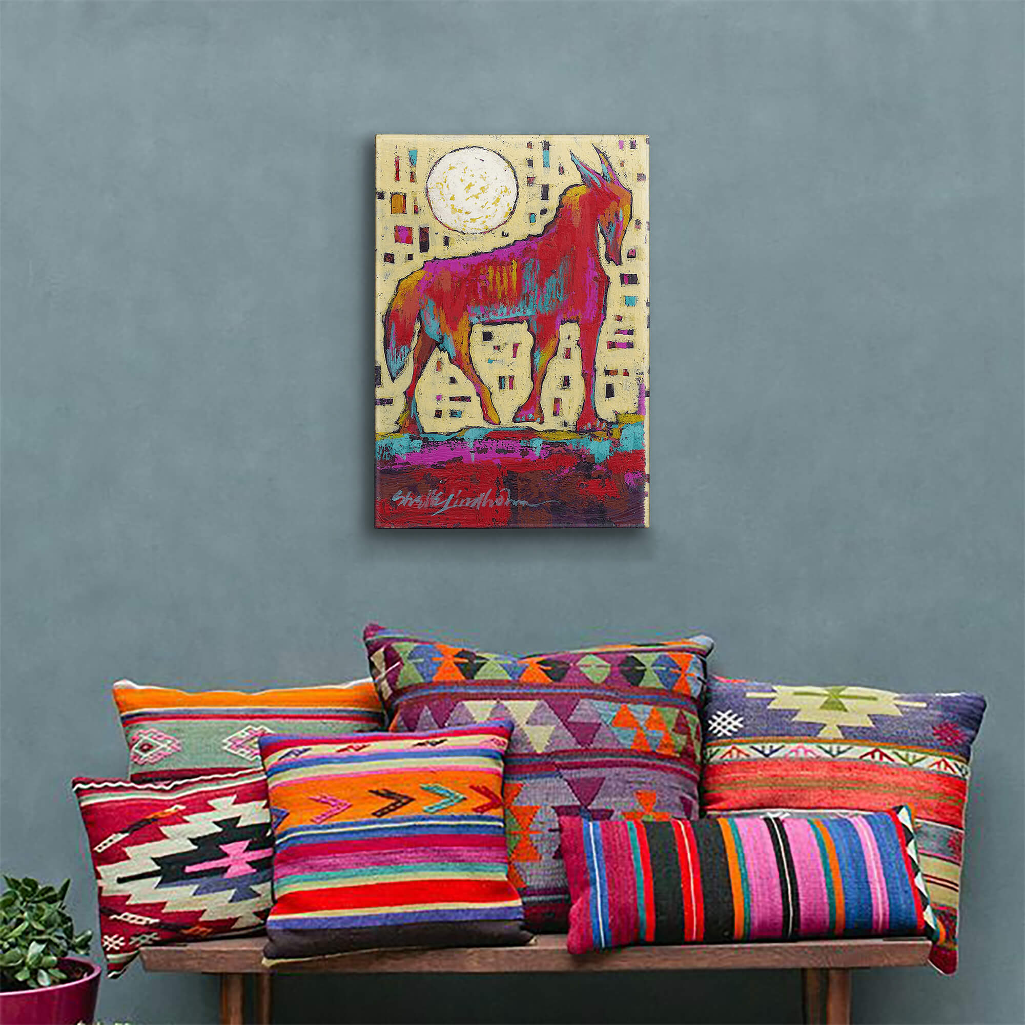 Illuminate your space with this vibrant artwork featuring a striking wolf in bold red, yellow, and teal, set against a cream-colored backdrop with geometric accents. The radiant full moon adds depth and intrigue, creating a dynamic composition full of energy and symbolism. Perfect for those seeking a unique and colorful statement piece, this artwork brings warmth and character to any room.
