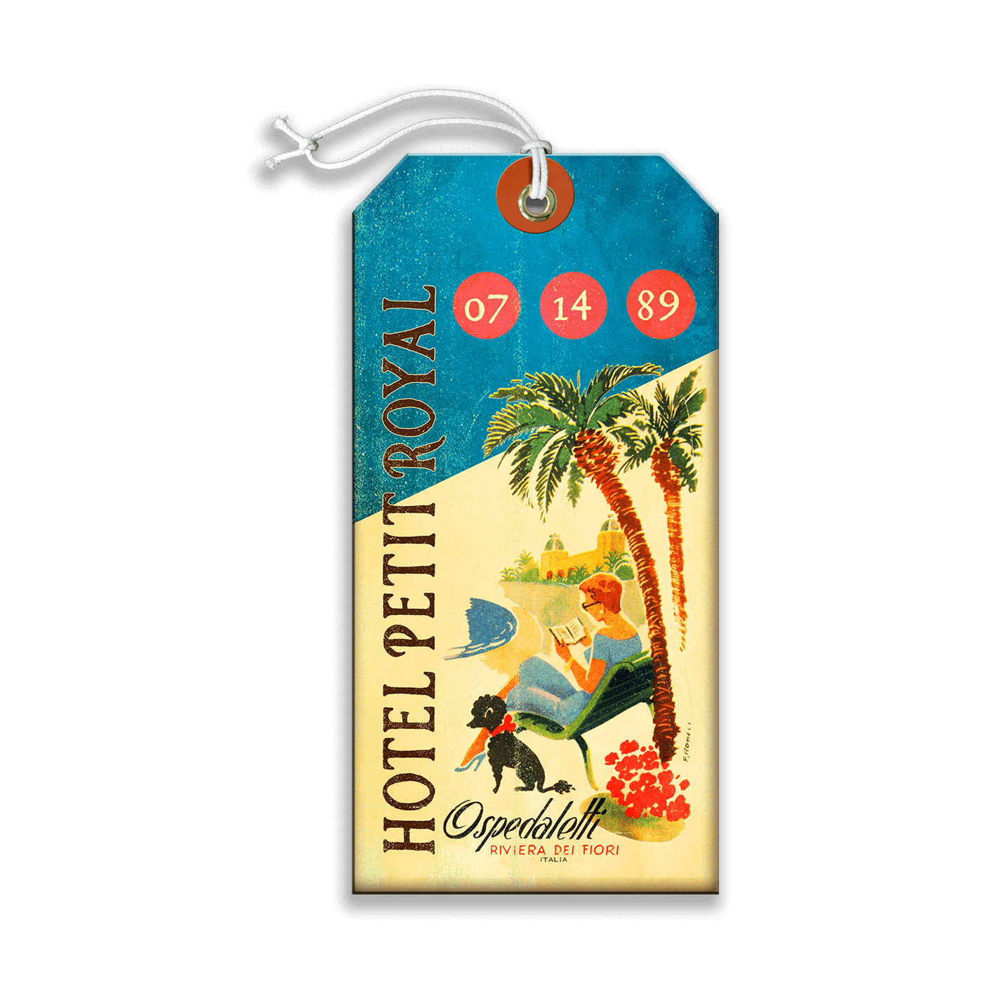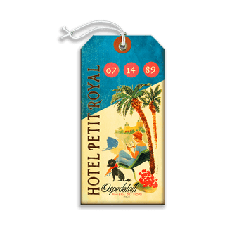 This beautifully crafted luggage tag artwork features a nostalgic design for the Hotel Petit Royal in Ospedaletti, nestled along the stunning Riviera dei Fiori in Italy. The tag captures the essence of a classic Mediterranean getaway, with vibrant illustrations of a serene seaside retreat under the shade of palm trees. The rich colors and retro style make it a standout addition, evoking memories of luxurious holidays on the Italian coast.