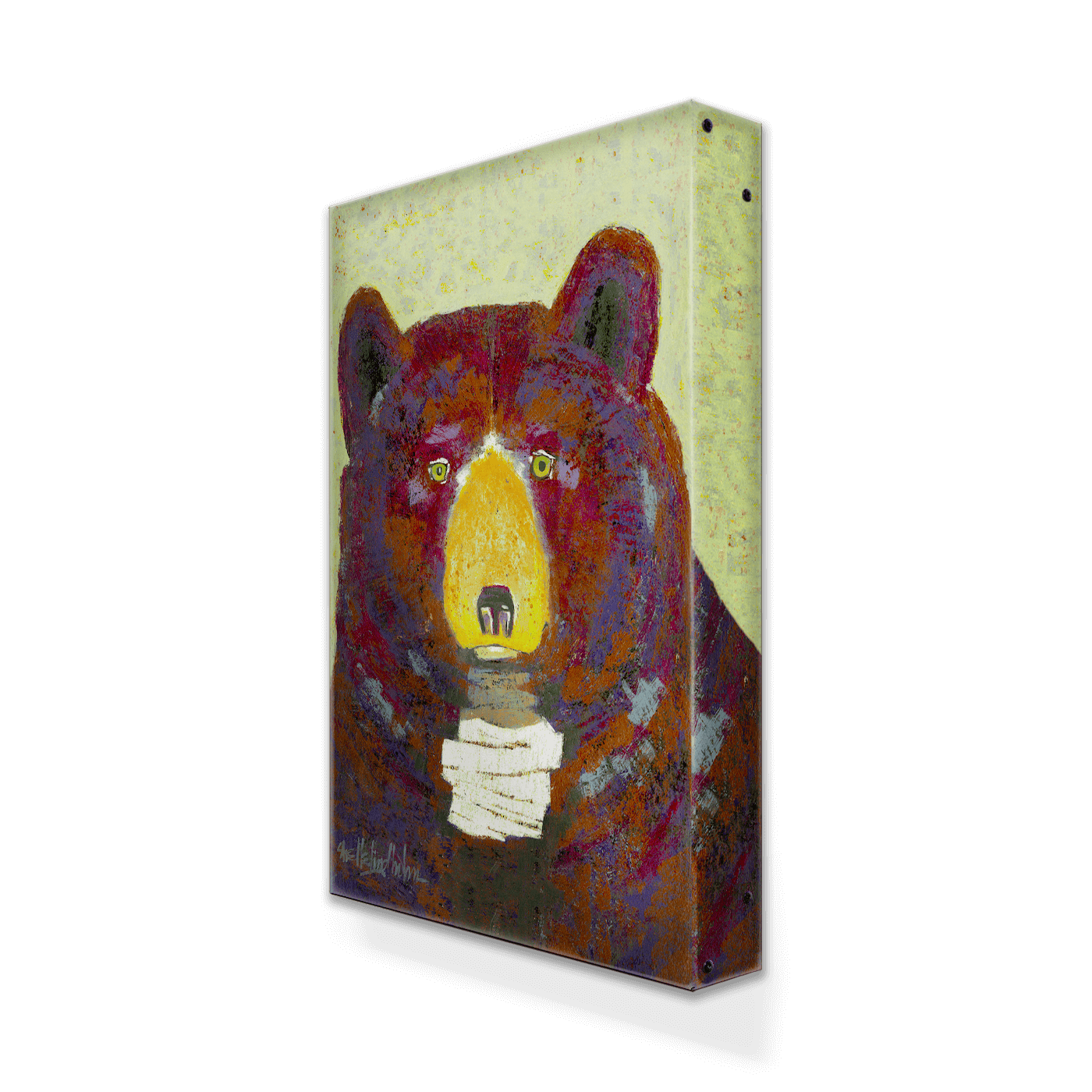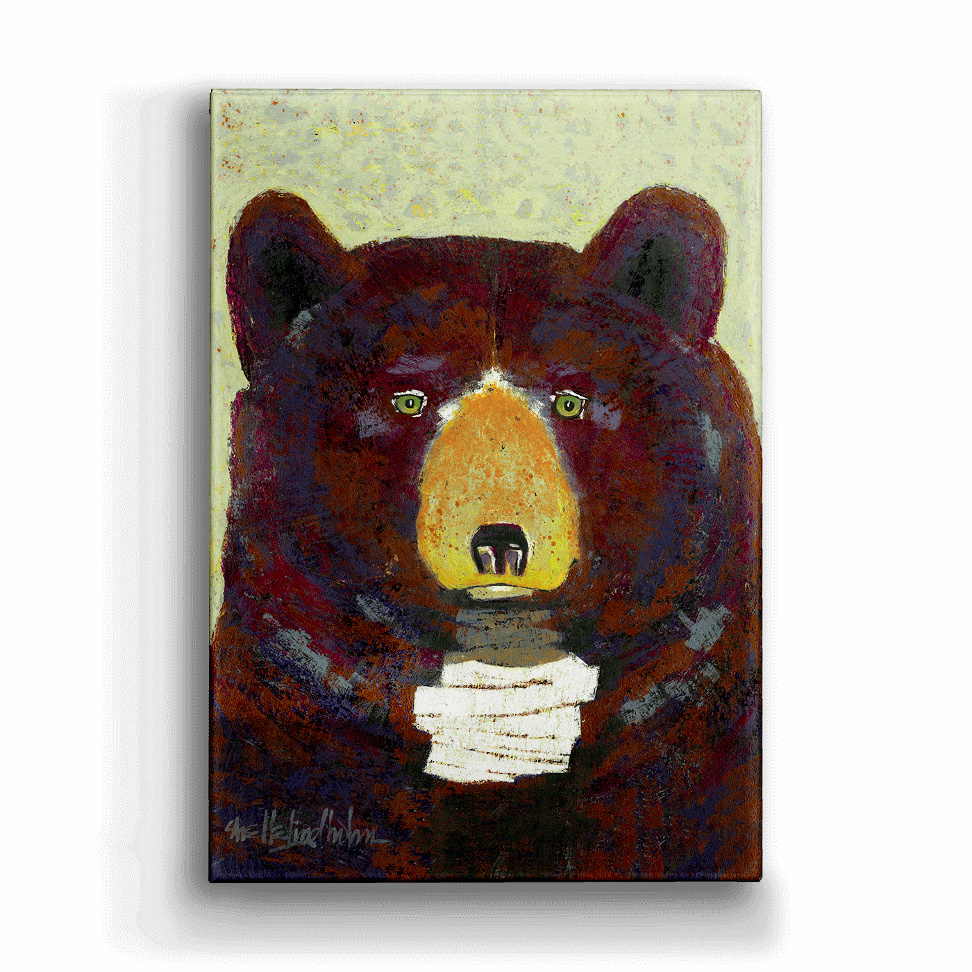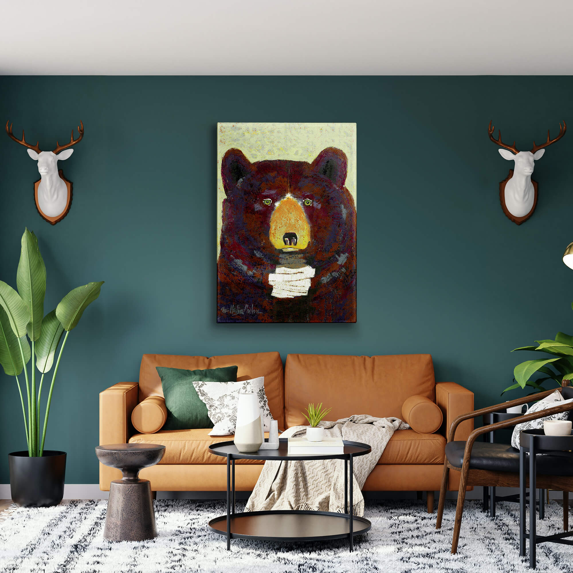 Step into the world of "Huck," an enthralling portrait of a bear rendered in deep, rich hues. This artwork captivates with its intense gaze and textured brushwork, highlighting the bear's rugged features against a speckled background. A perfect choice for collectors and enthusiasts of wildlife art, "Huck" combines traditional motifs with a contemporary artistic expression, making it a striking addition to both modern and rustic interiors.