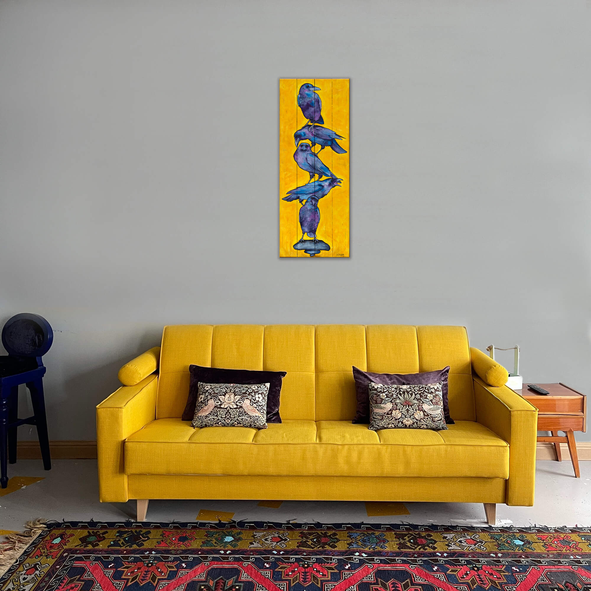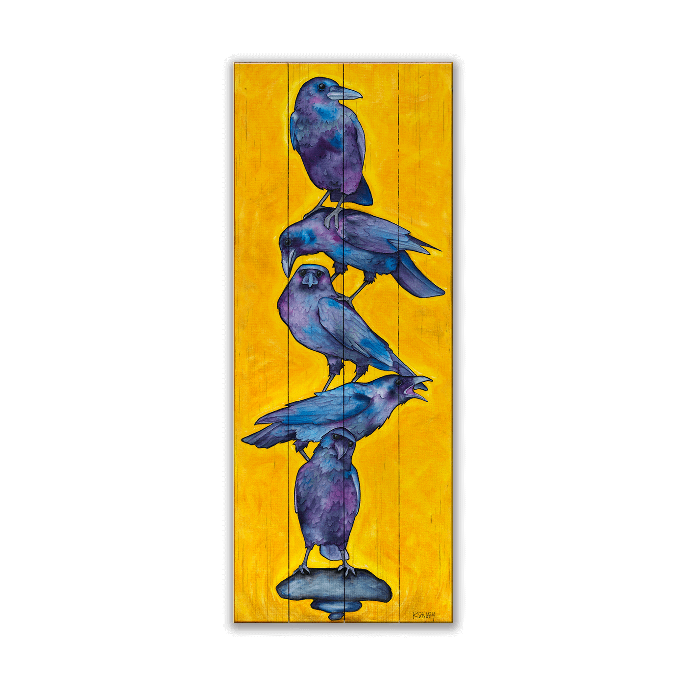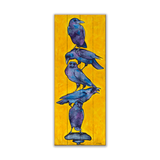 Celebrate the mystique of nature with this bold and dynamic artwork featuring a striking stack of vivid blue crows against a radiant golden background. Each bird, uniquely posed, showcases a sense of individuality and charisma, creating a captivating interplay of color and form. Perfect for those who appreciate the beauty and intelligence of crows, this piece adds a touch of intrigue and energy to any space.