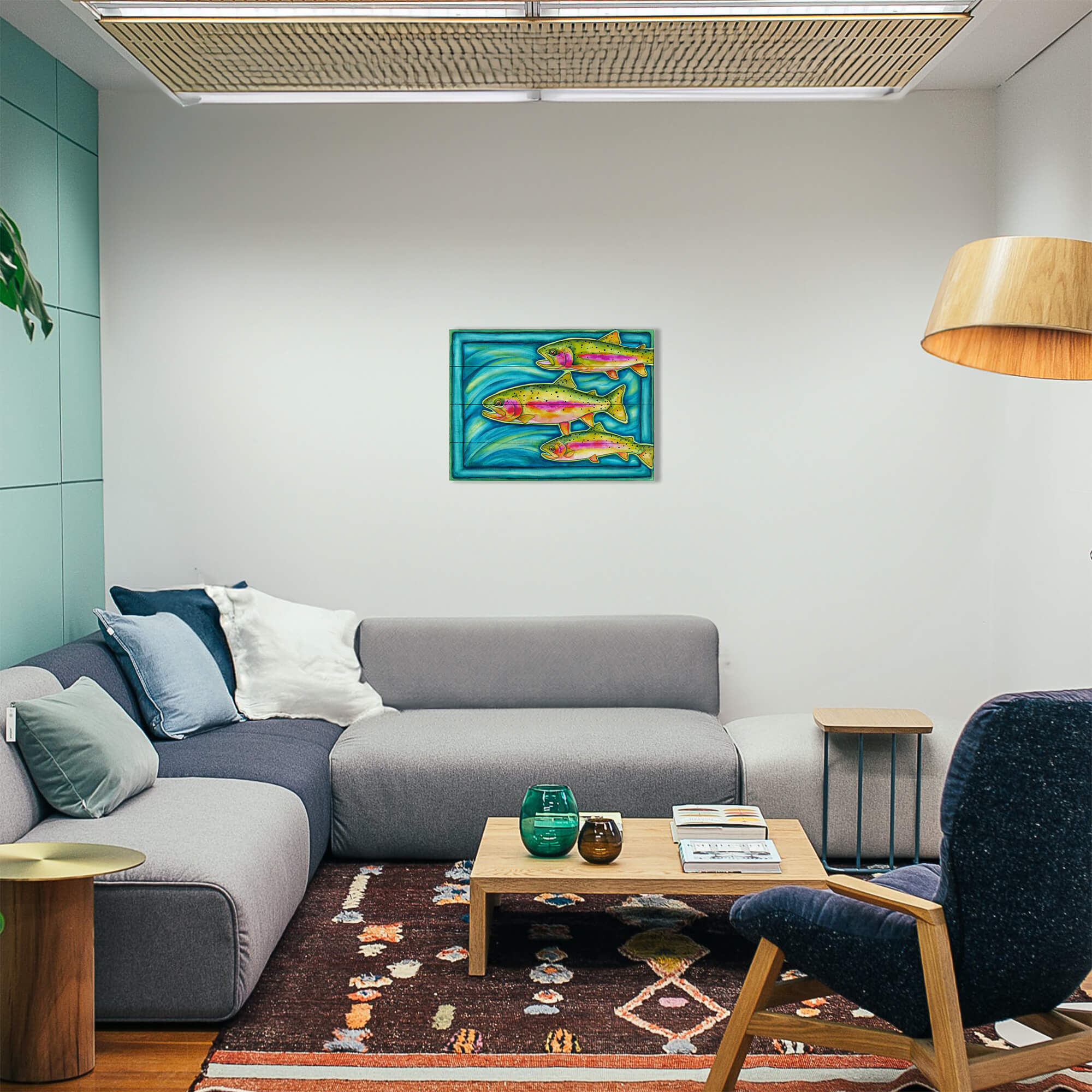 Dive into the vibrant world of water with this stunning artwork featuring a trio of colorful trout swimming gracefully through shimmering blue water. The fish are brought to life with vivid hues of green, pink, and gold, capturing their natural beauty and movement. This piece is perfect for nature enthusiasts, anglers, or anyone who appreciates aquatic art. Its lively colors and dynamic composition make it an eye-catching addition to any space, adding a touch of underwater serenity and charm.