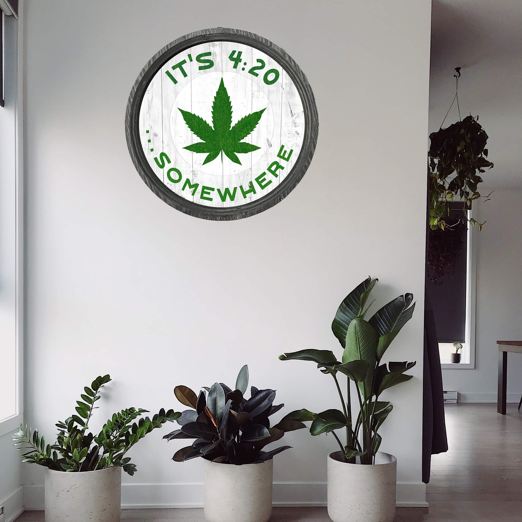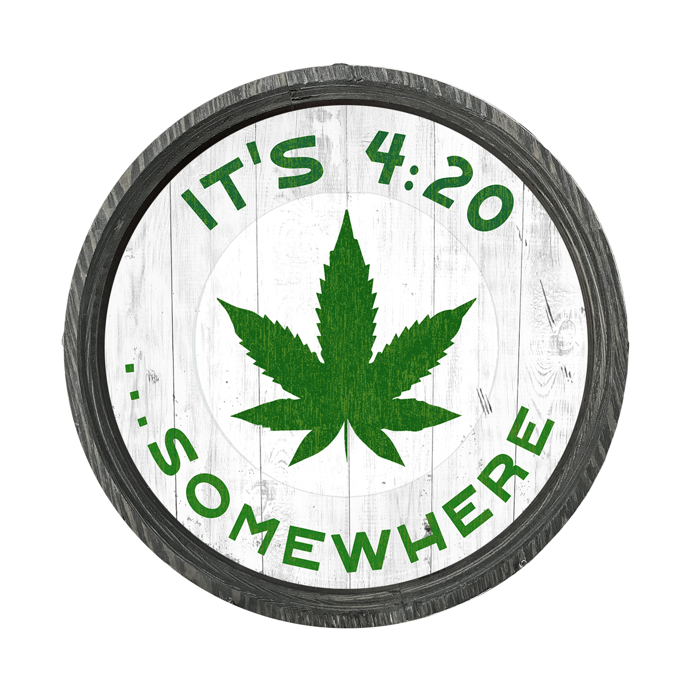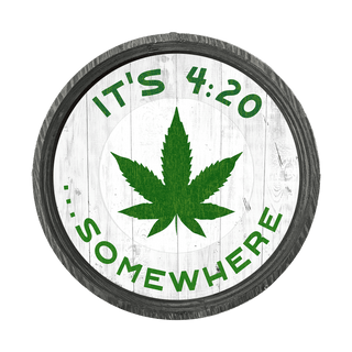 This sign is the perfect blend of rustic charm and contemporary flair with this unique barrel-end artwork. It features a vibrant cannabis leaf at the center, surrounded by the playful phrase - It's 4:20 somewhere - in bold, eye-catching fonts. The first artwork presents a classic, weathered background, giving it a vintage feel that's ideal for any space that embraces a shabby chic or farmhouse aesthetic.