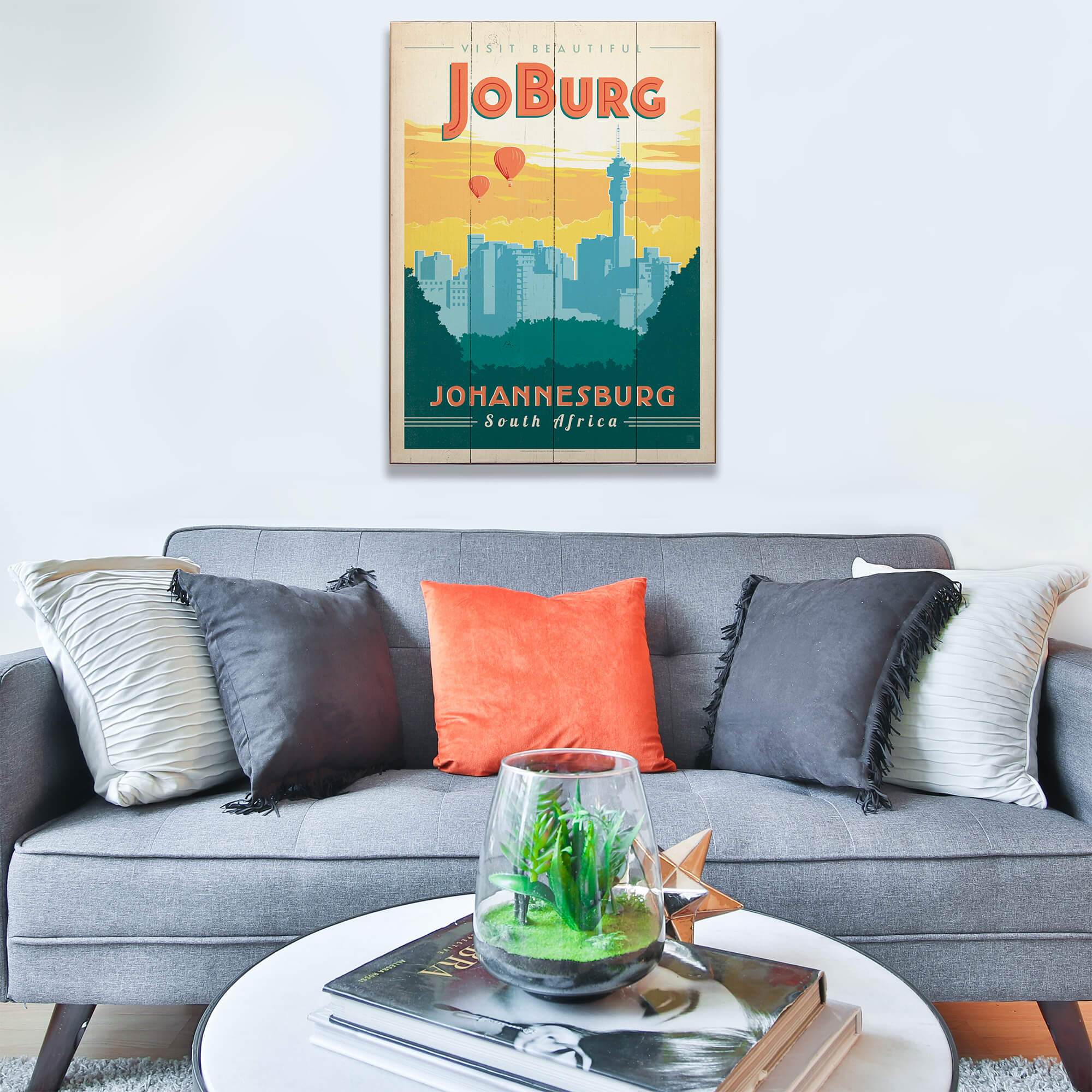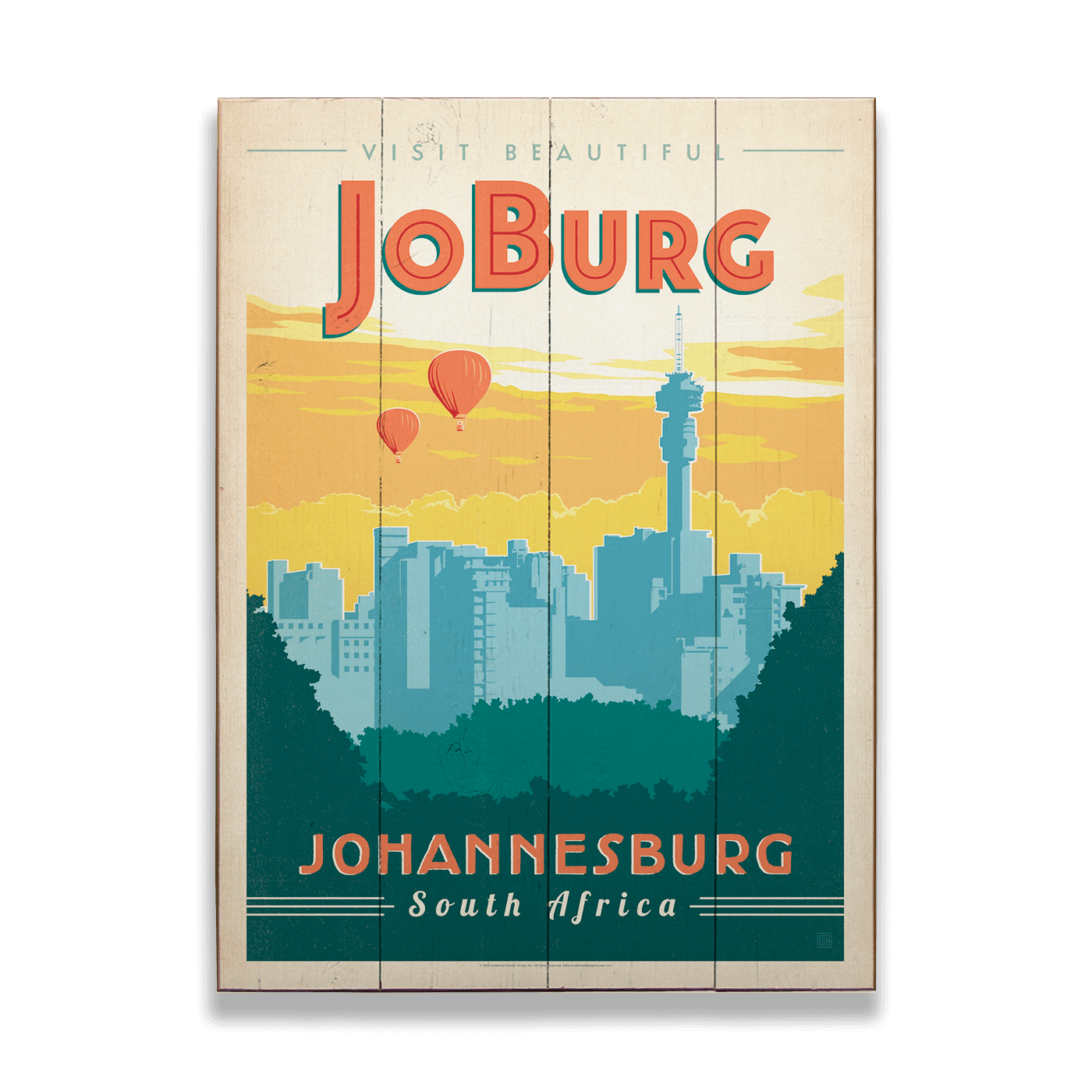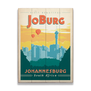 Step into the vibrant heart of South Africa with this Johannesburg travel print, an artistic tribute to the city affectionately known as Jo'burg. The artwork features the iconic Johannesburg skyline punctuated by the Hillbrow Tower, all set against a backdrop of a warm, golden sky that mirrors the city's sunny disposition. Hot air balloons add a touch of whimsy, suggesting adventure and exploration in this urban jungle. With its nostalgic appeal and contemporary flair, this print is perfect for those who have experienced the city's dynamic pulse or dream of visiting.