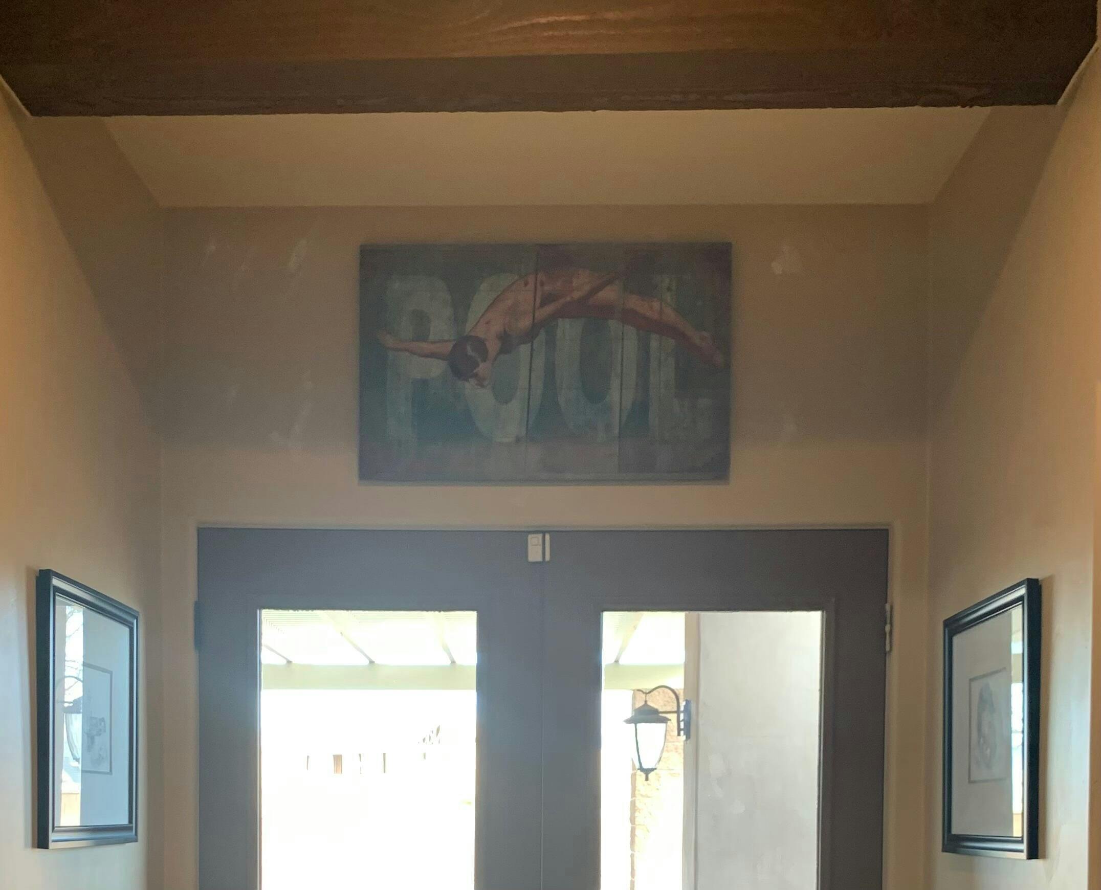 The piece depicts a dynamic moment of a two friends leaping into the water, while other children frolic nearby. Captured in mid-motion, this artwork radiates the carefree spirit and excitement of a day spent by the sea. With its bright colors and lively composition, it's a delightful addition to any space that celebrates the pure fun and adventure of outdoor activities. Ideal for those who love a splash of energy and nostalgia in their decor.