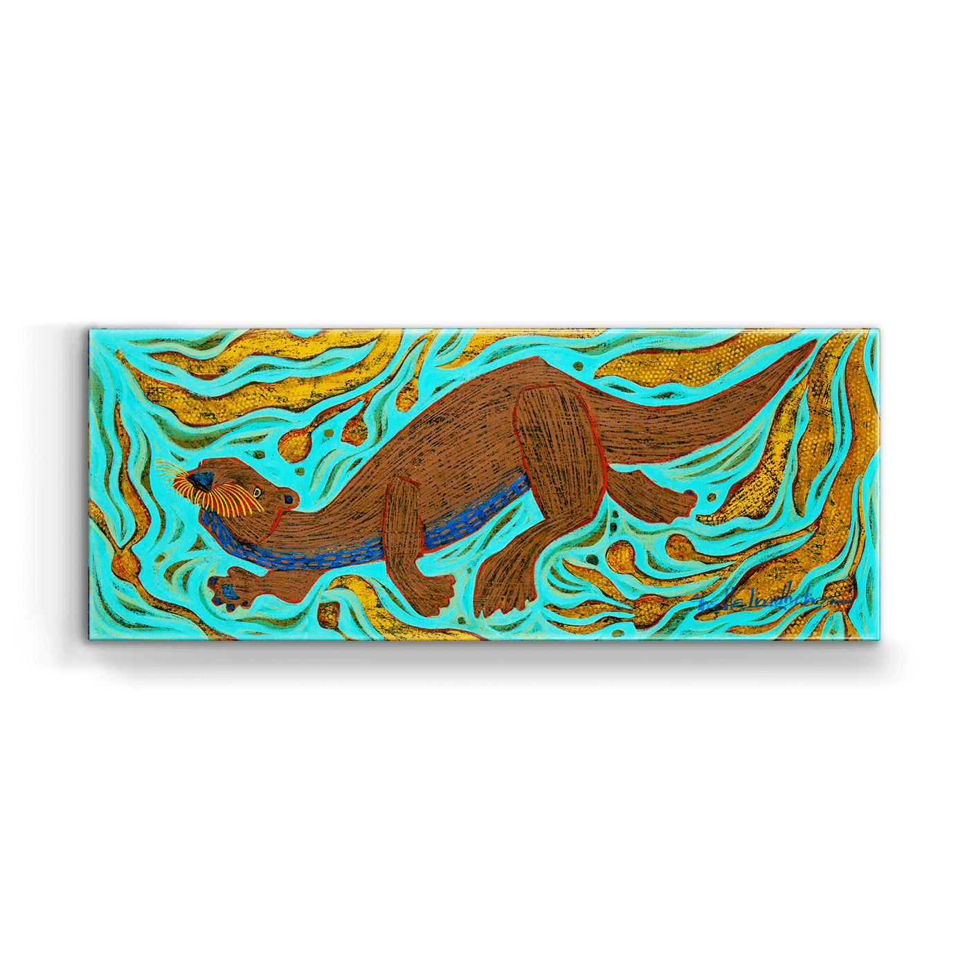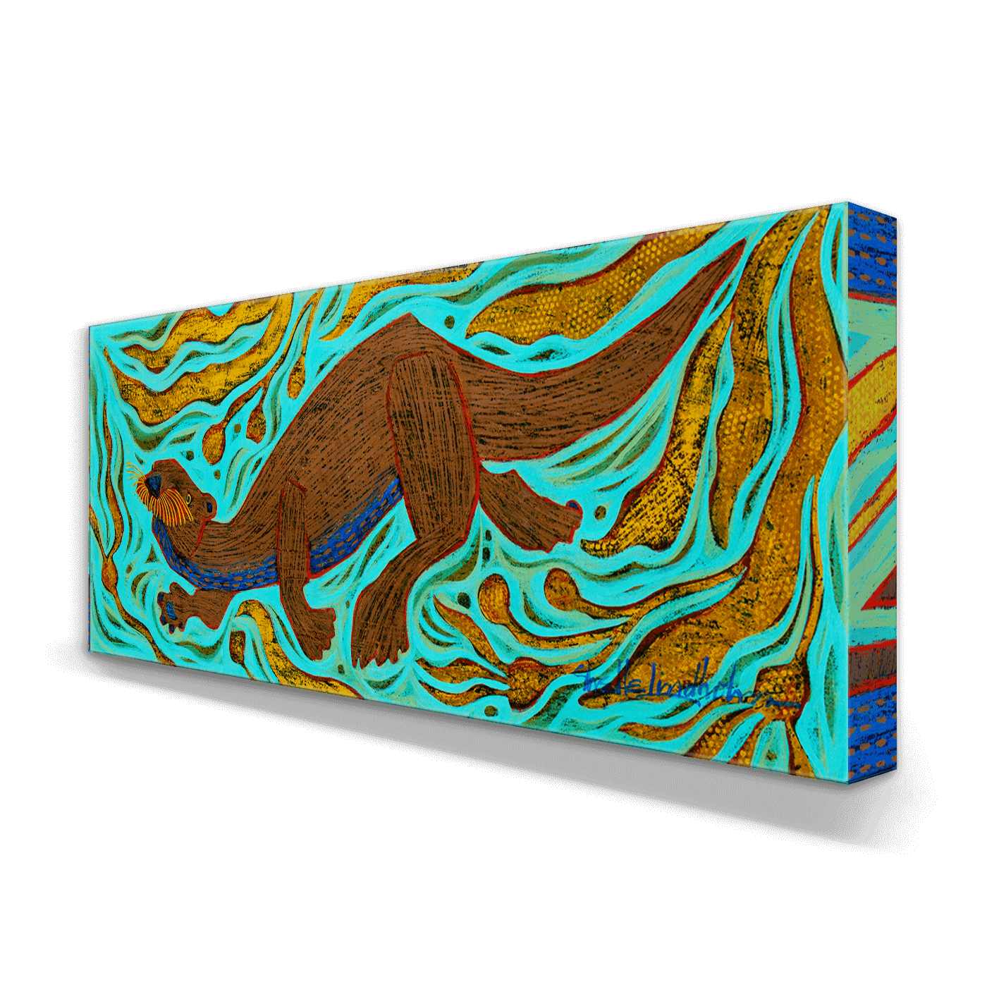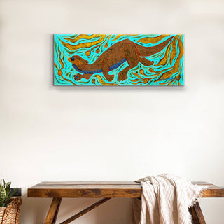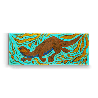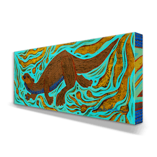 This lively artwork showcases an otter in motion, joyfully navigating swirling waters filled with dynamic golden plantlife. The vibrant turquoise background contrasts beautifully with the warm earth tones of the otter, creating a sense of playfulness and energy. A celebration of aquatic life and this charming creature's curious spirit, this piece adds a touch of whimsy and vitality to any space. Perfect for animal lovers and those seeking art that inspires joy and connection.