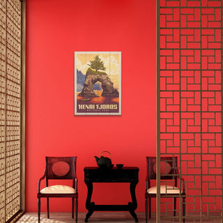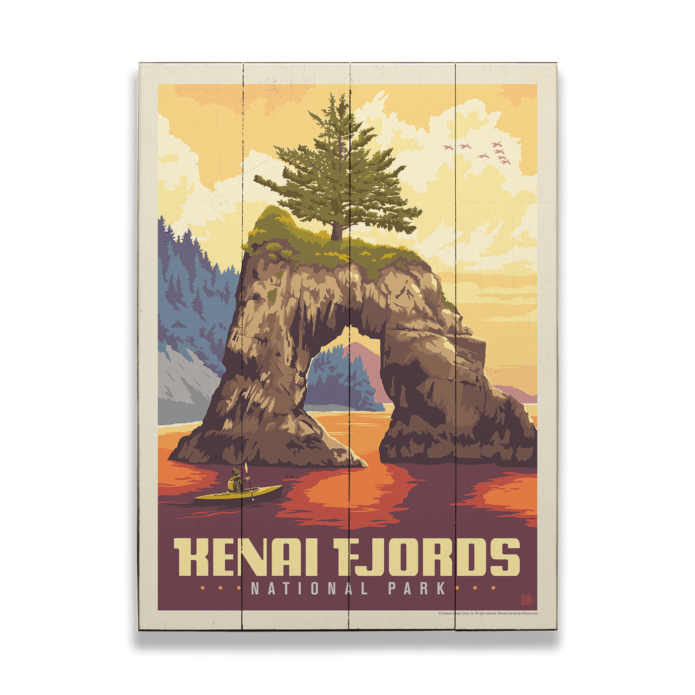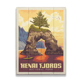 Paddle through a world shaped by time and tide in Kenai Fjords National Park, where sea stacks and sculpted rock formations rise from glacier-fed waters. This artwork captures the dramatic beauty of a lone kayaker beneath a natural arch, surrounded by serene reflections and rugged coastal cliffs. A tribute to the park’s untamed shoreline and sense of remote wonder, it evokes the spirit of exploration that defines Alaska’s coastal wilderness.