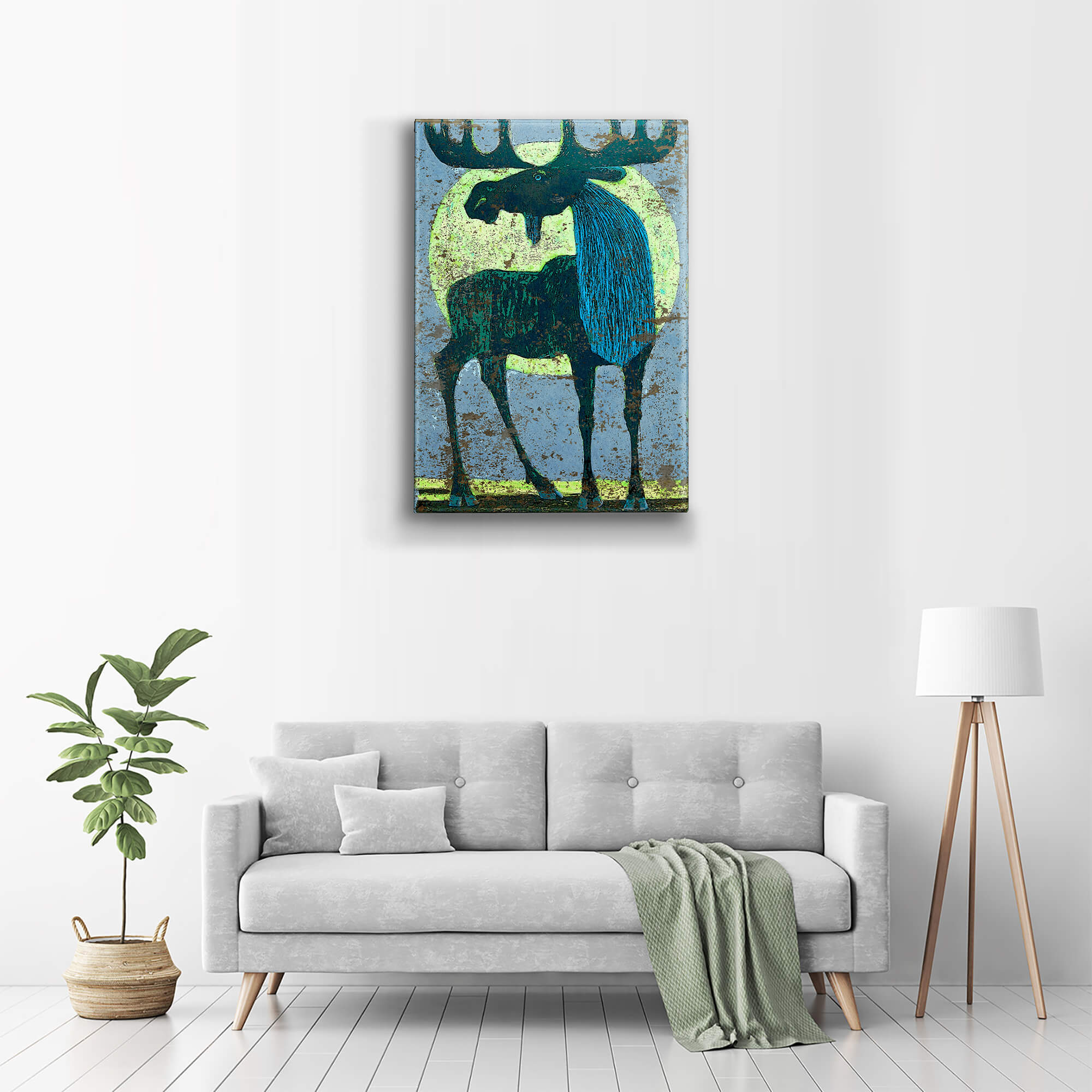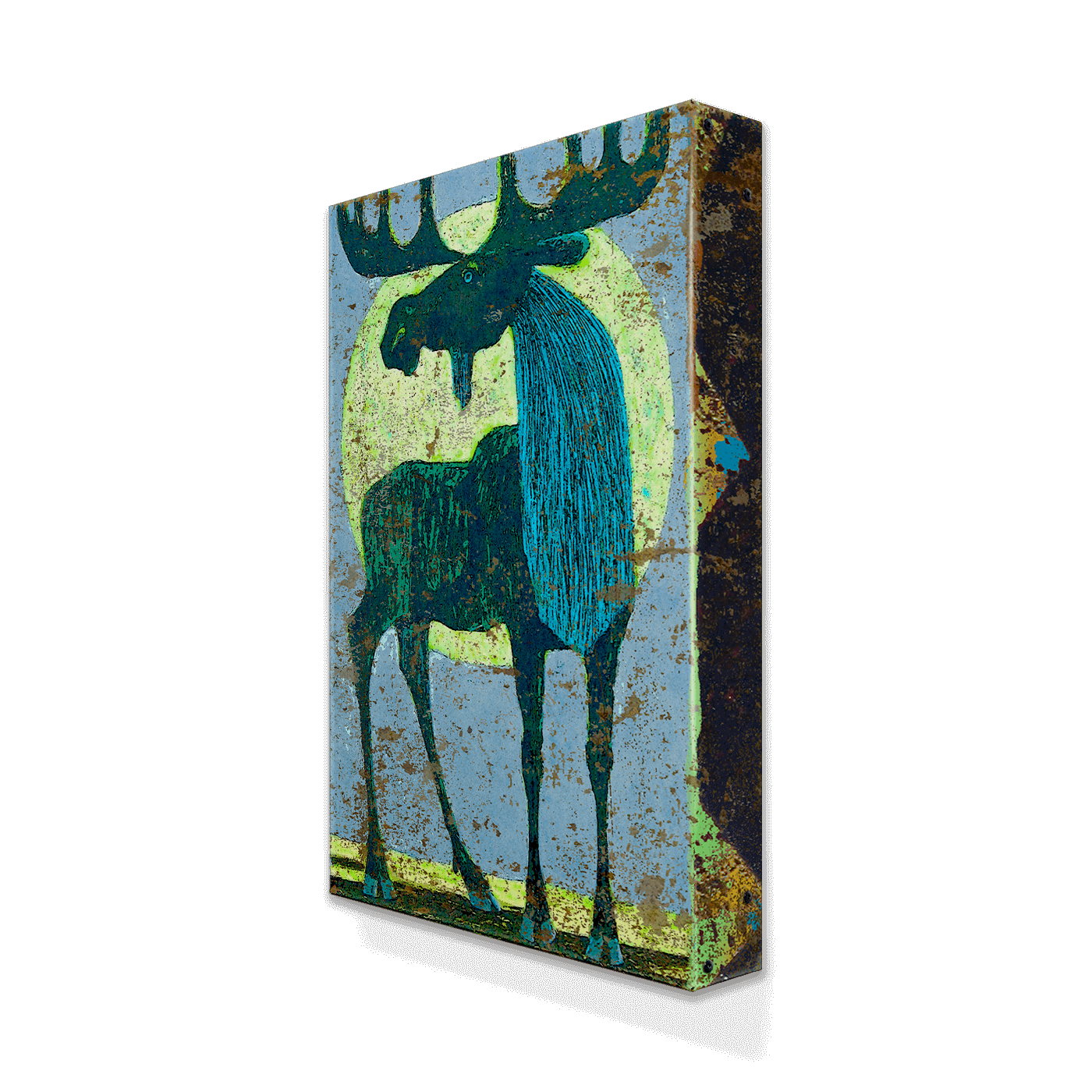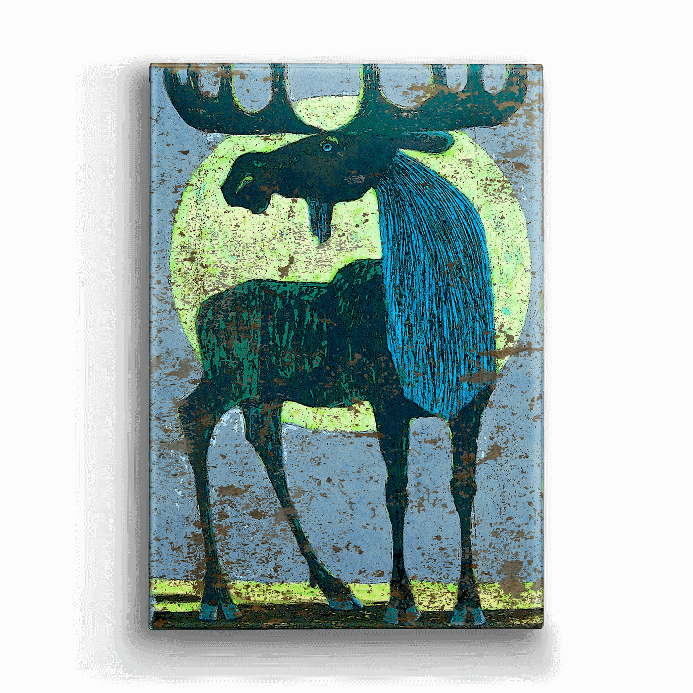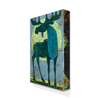 Explore "King of the Mountain," an evocative artwork featuring a stylized moose against a luminescent moon backdrop. This piece uses a unique combination of textures and a striking color palette of blue and green to bring the majestic creature to life. Perfect for art lovers and collectors seeking a blend of rustic charm and contemporary art techniques. Ideal for enhancing any space with a touch of wilderness-inspired elegance.