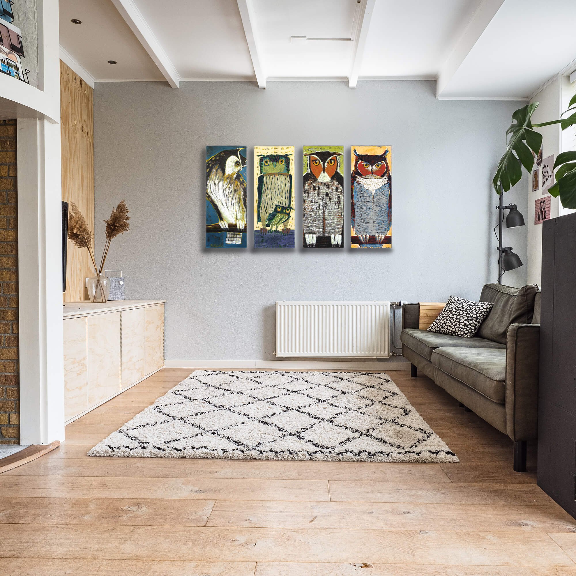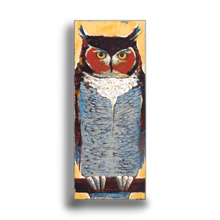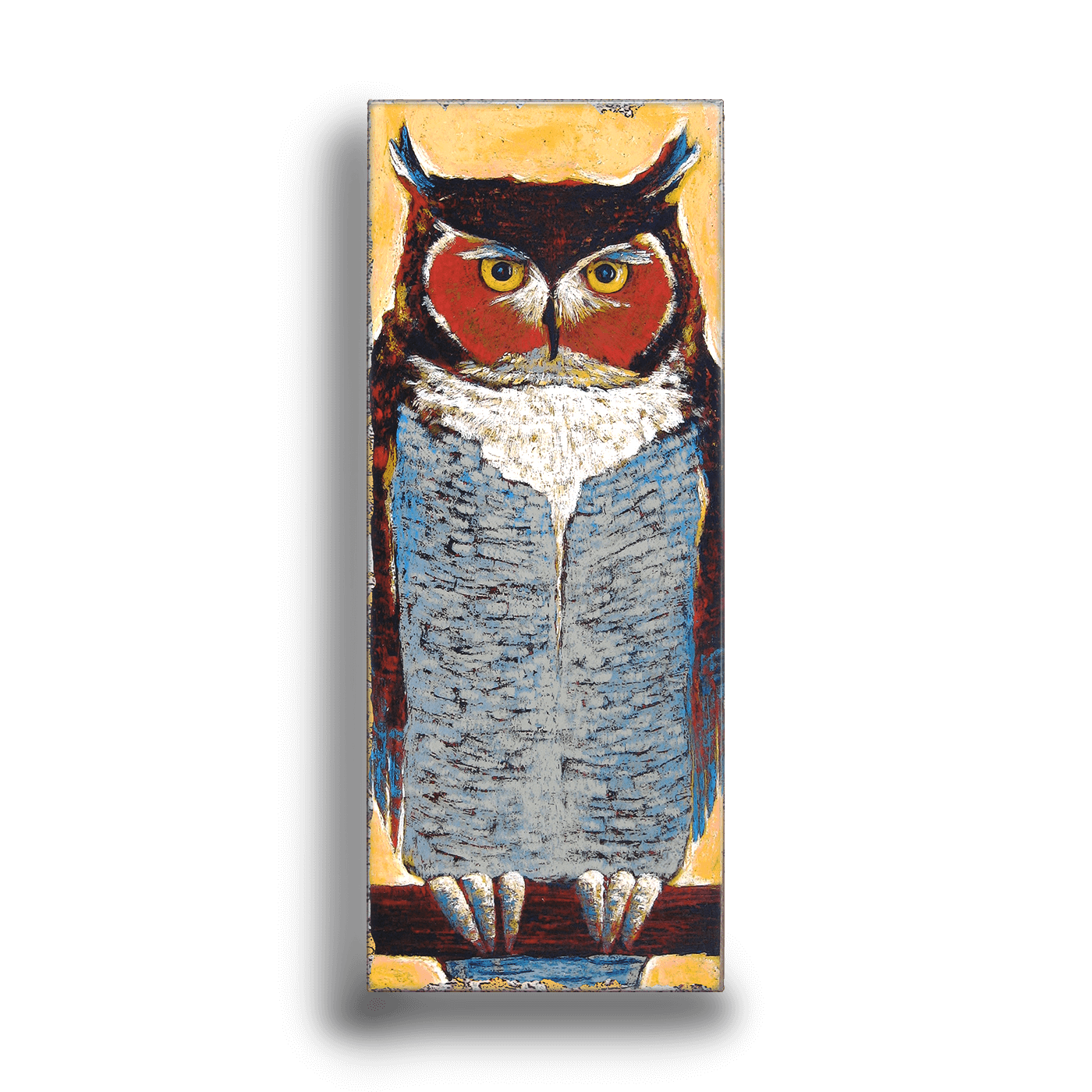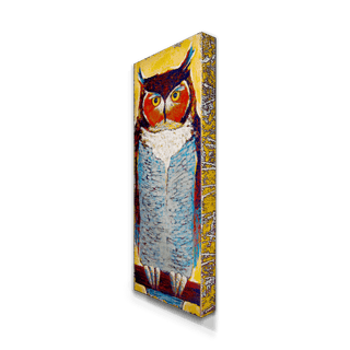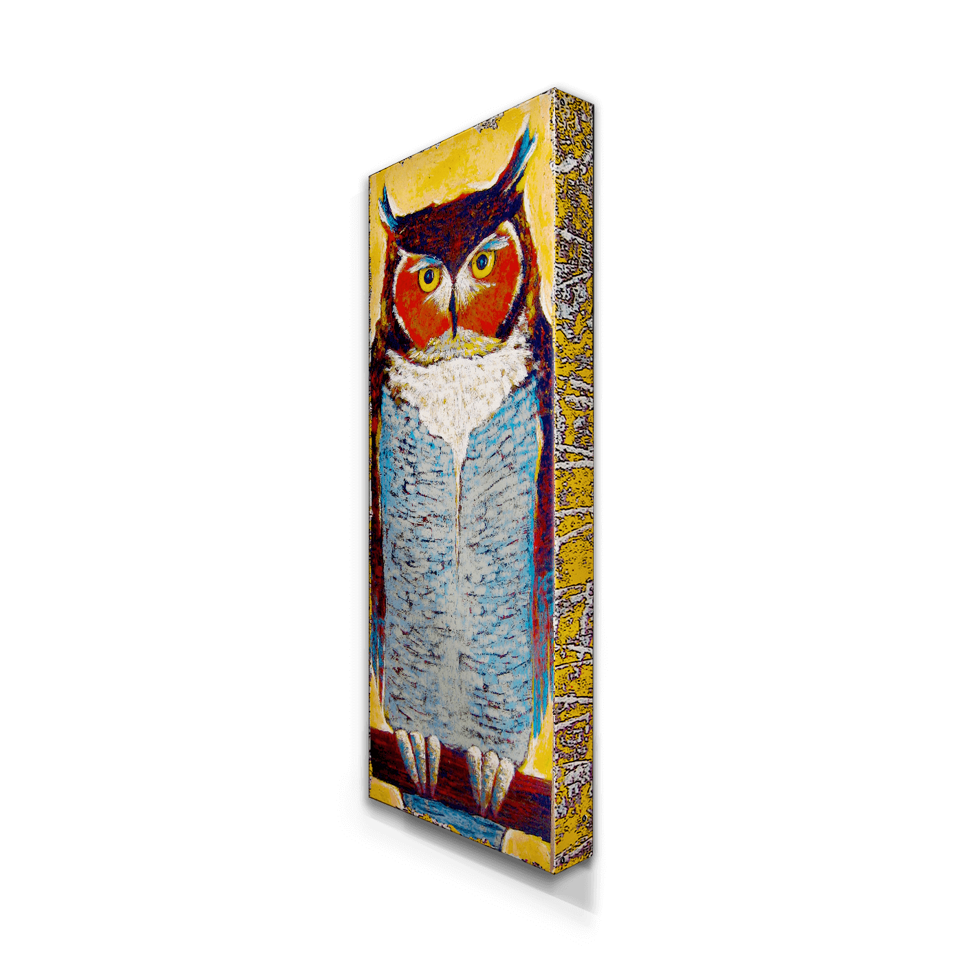 This striking artwork features a majestic owl perched with regal poise, the rich textures and bold color palette of deep reds, blues, and golden hues bringing its commanding presence to life. With intricate detailing and a powerful gaze, this piece captures the wisdom and mystery often associated with these nocturnal creatures. Perfect for nature enthusiasts or anyone looking to add a touch of strength and intrigue to their space, this artwork is a true celebration of the owl’s enduring allure.