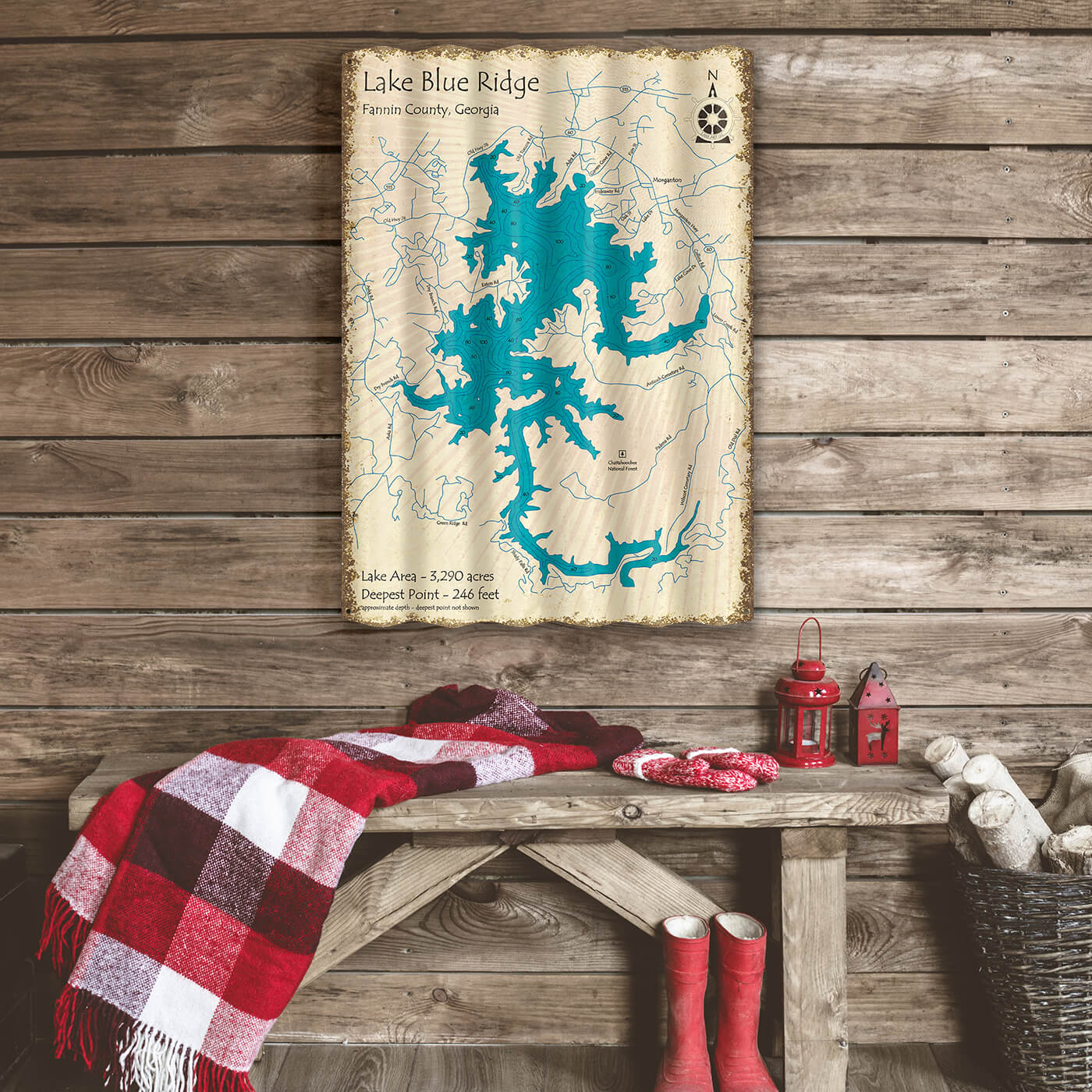 Introducing our striking vintage wood or metal map of Blue Ridge Lake, located in the picturesque mountains of North Georgia. This man-made reservoir offers visitors over 3,300 acres of pristine waters, surrounded by lush forests and stunning scenic views.