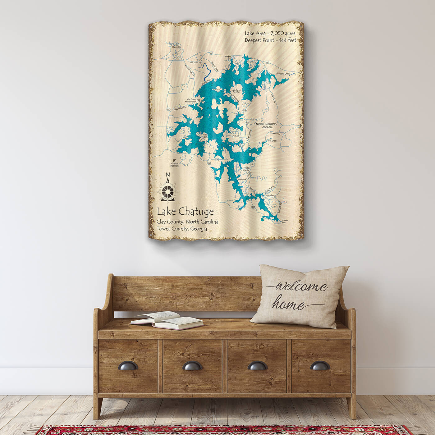 Celebrate the striking beauty of Lake Chatuge, spanning Clay County, North Carolina, and Towns County, Georgia. This detailed artwork captures the lake’s sprawling, island-dotted shape and surrounding roadways. With 7,050 acres of surface area and depths reaching 144 feet, Lake Chatuge is a favorite for boating, fishing, paddling, and lakeside living. Its intricate shoreline offers countless coves and inlets to explore, all framed by scenic mountain views. Whether you're drawn to its recreational opportunities or fond memories made along its shores, this piece offers a distinctive way to honor a beloved Southern lake.