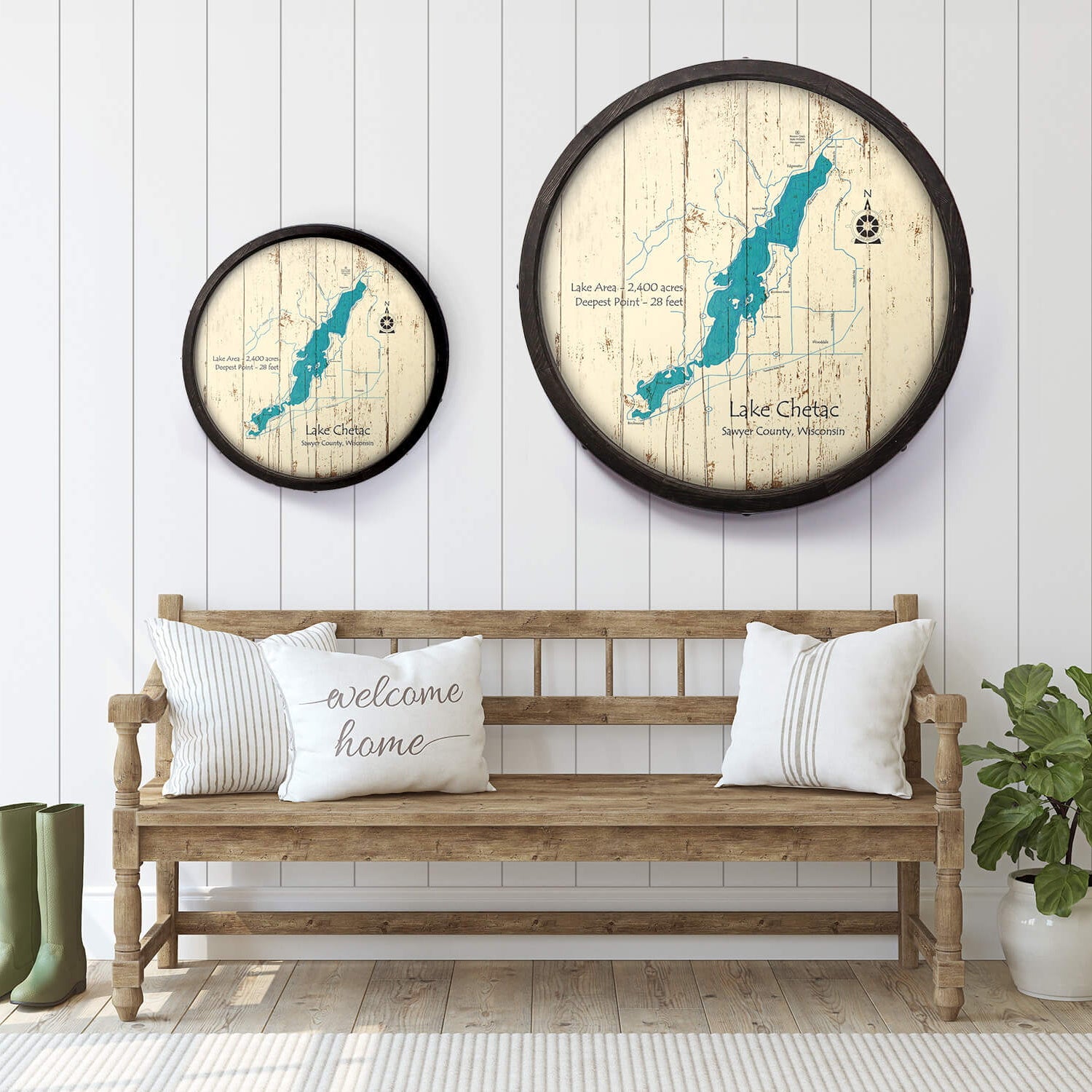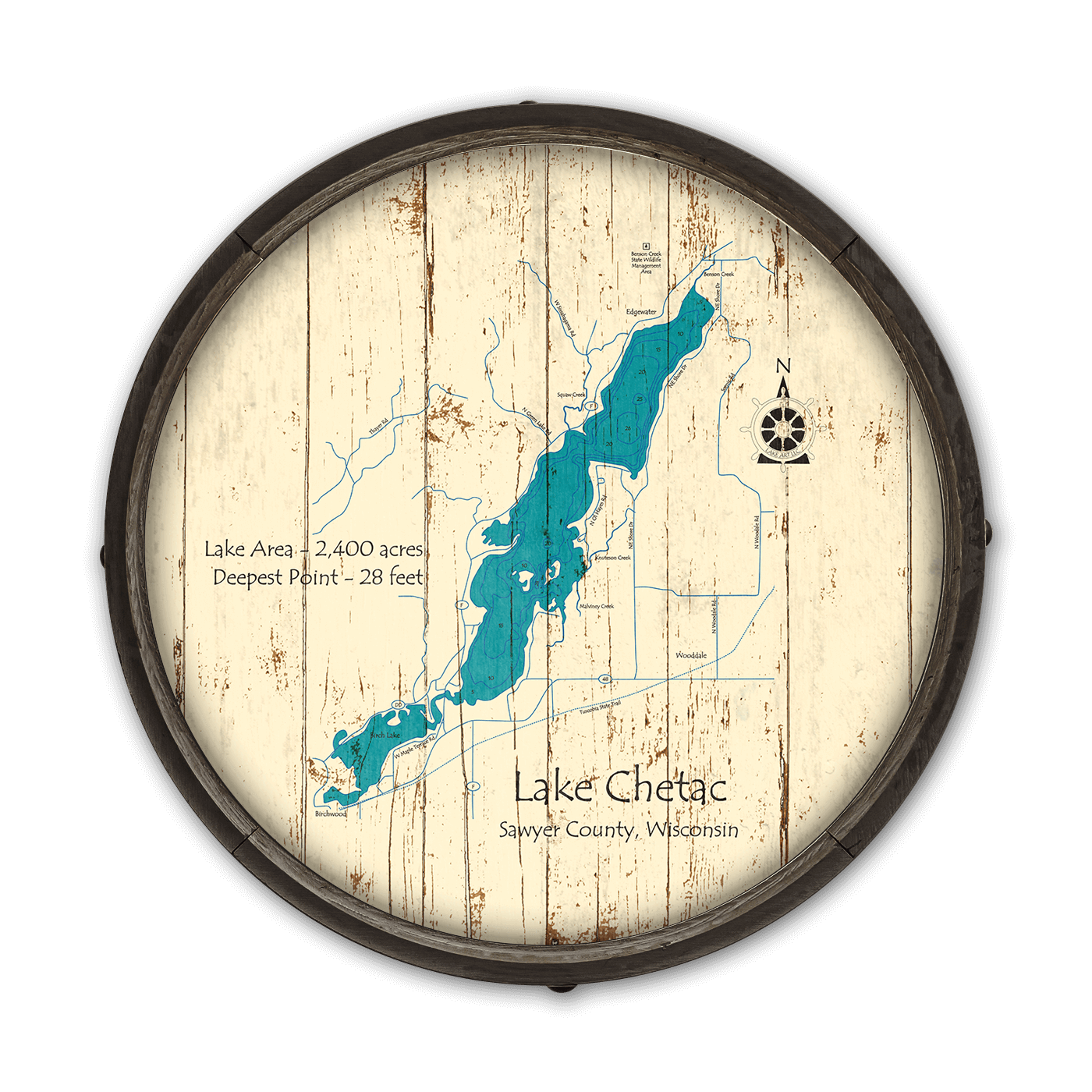 Discover the stunning intricacy and charm of this meticulously crafted bathymetric map of Lake Chetac, nestled in the serene landscapes of Sawyer County, Wisconsin. This piece of art captures not only the lake's geographical beauty but also serves as an informative tool, detailing the lake's substantial 2,400-acre expanse and its deepest point at 28 feet. The design marries the allure of topographic art with lake mapping, making it an ideal addition to the decor of outdoor enthusiasts, cartography aficionados, and local residents who take pride in their picturesque environment. Add a touch of Lake Chetac's tranquil vibes to your living space or office, and let the conversation flow as seamlessly as the waters of this beloved Wisconsin treasure.