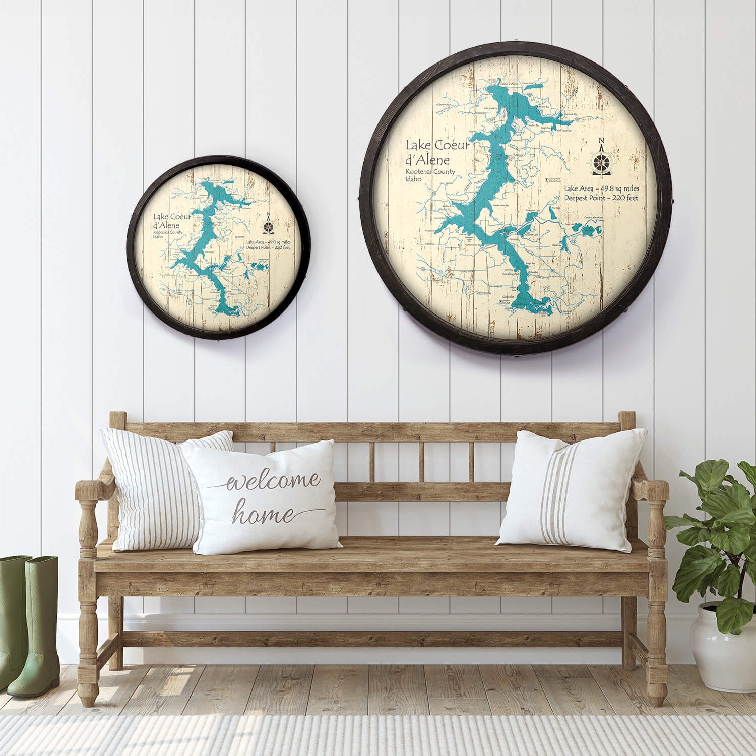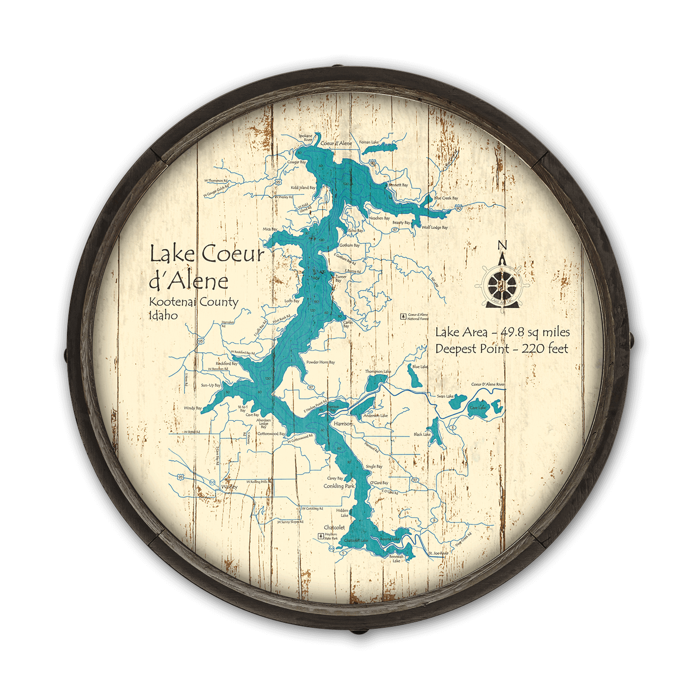 Discover the captivating beauty of Lake Coeur d'Alene in Kootenai County, Idaho, through this exquisite map representation. Ideal for enthusiasts of cartography and nature alike, this piece highlights the stunning topography and vast expanse of the lake, with an area of 49.8 square miles and reaching depths of up to 220 feet. It's not only an informative piece but also a stylish addition to any space. This map accentuates key locations and geographical features around the lake, making it a perfect reference for adventurers and locals. Add a touch of Idaho's natural elegance to your collection with this distinctive Lake Coeur d'Alene map.