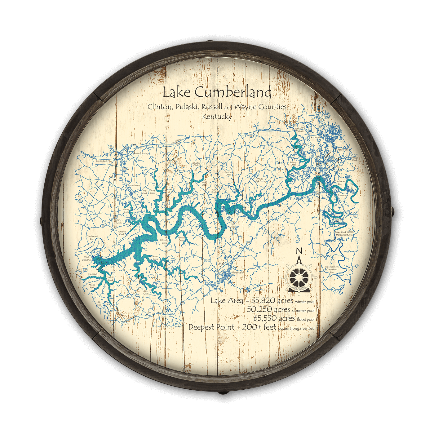 Discover the vast beauty of Lake Cumberland, stretching across Clinton, Pulaski, Russell, and Wayne Counties in Kentucky. This intricately detailed map highlights the lake’s impressive shoreline, winding waterways, and surrounding landmarks. With a lake area ranging from 35,820 acres in winter to 65,530 acres at flood pool, and a deepest point exceeding 200 feet, Lake Cumberland is a premier destination for boating, fishing, and outdoor adventure. Known as the "Houseboat Capital of the World," this stunning reservoir offers breathtaking scenery and endless recreation. Whether you cherish time spent on the water or admire the region’s natural splendor, this unique piece is a perfect way to commemorate a beloved destination.