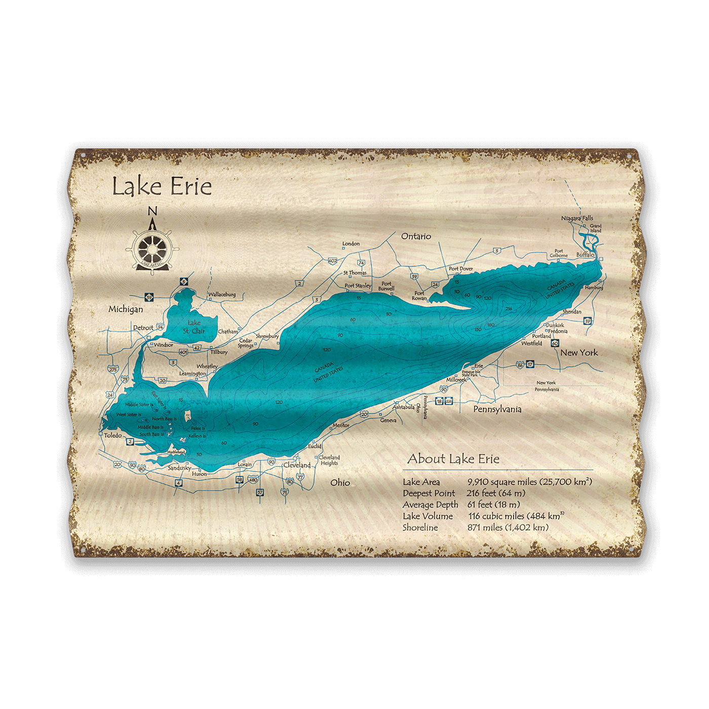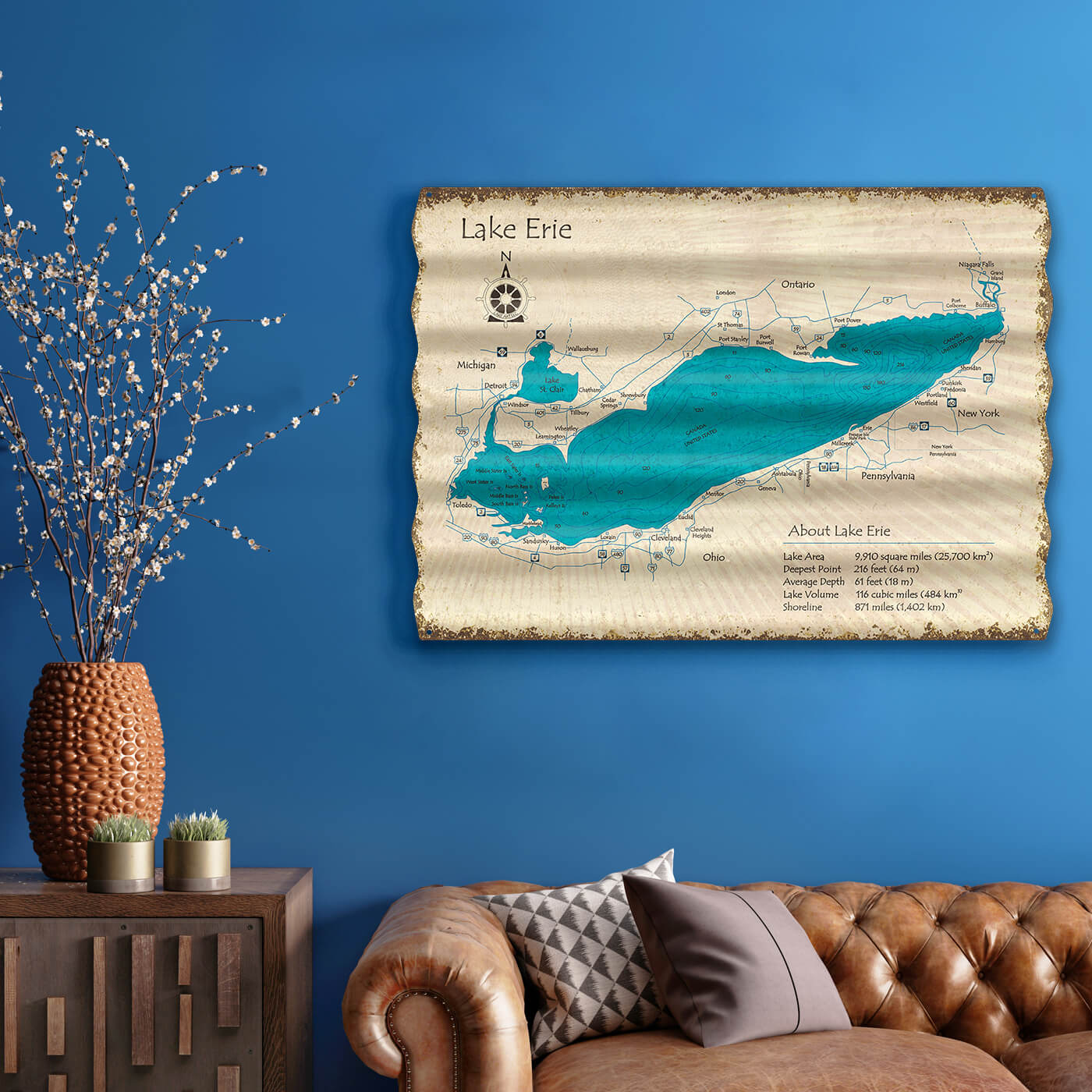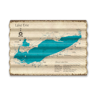 Discover the enchanting beauty of Lake Erie through this exquisite artwork. Embodying both form and function, the map captures the grandeur of the fourth-largest of the Great Lakes in North America. With meticulously detailed contours and annotations, this piece is a stunning wall display. Perfect for geography aficionados, nautical enthusiasts, or anyone charmed by the allure of cartography, this representation marries the intricacies of topographical mapping with artistic elegance. Celebrate the majestic Lake Erie, bordered by Ontario, New York, Pennsylvania, Ohio, and Michigan, and bring a touch of the lake's serene essence into your space.