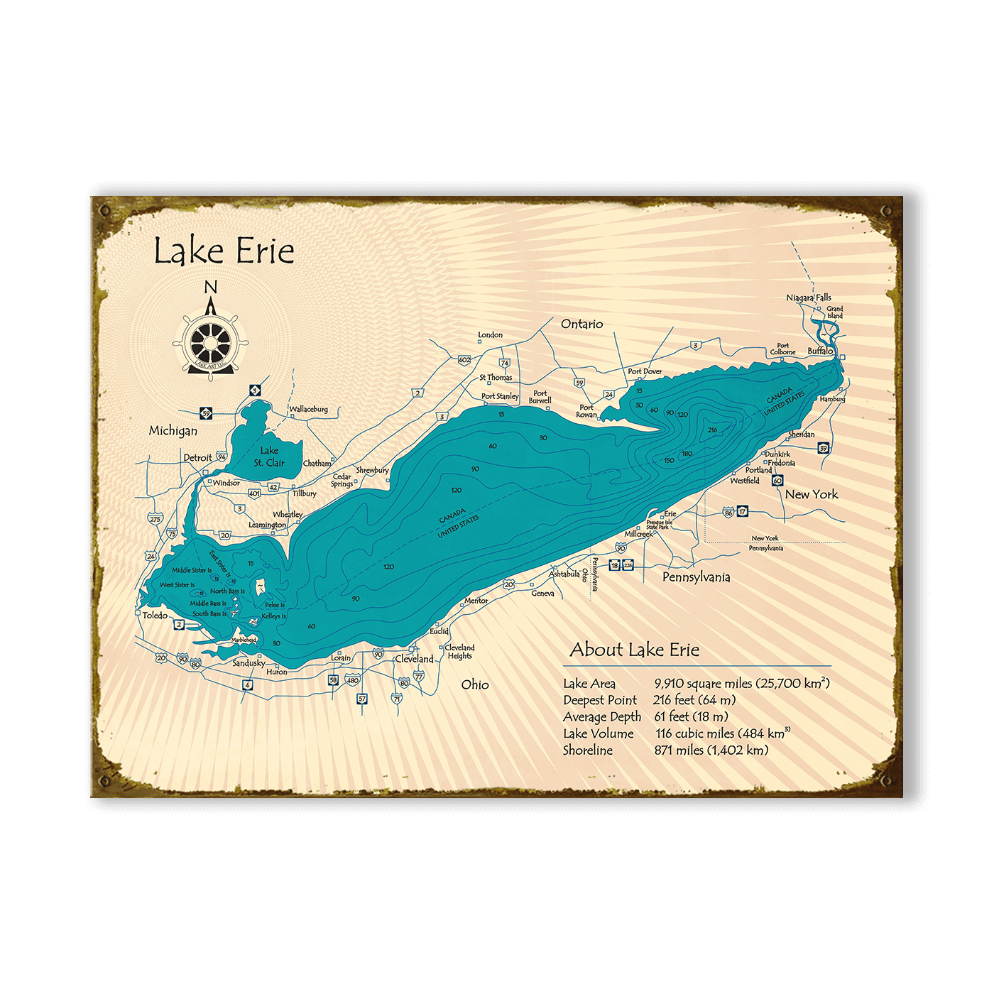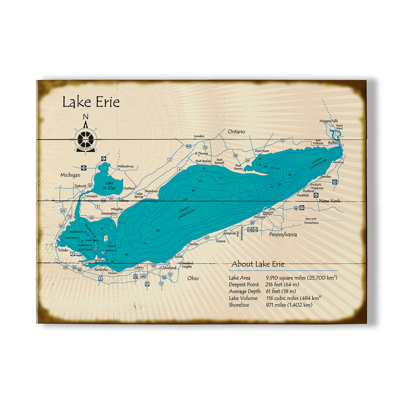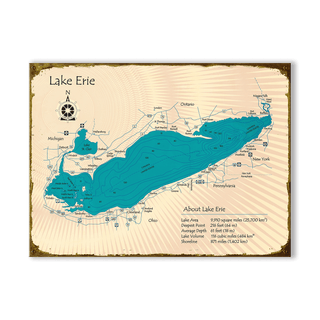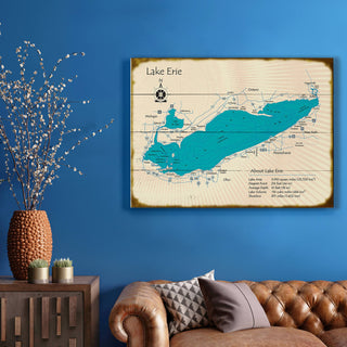 Discover the enchanting beauty of Lake Erie through this exquisite artwork. Embodying both form and function, the map captures the grandeur of the fourth-largest of the Great Lakes in North America. With meticulously detailed contours and annotations, this piece is a stunning wall display. Perfect for geography aficionados, nautical enthusiasts, or anyone charmed by the allure of cartography, this representation marries the intricacies of topographical mapping with artistic elegance. Celebrate the majestic Lake Erie, bordered by Ontario, New York, Pennsylvania, Ohio, and Michigan, and bring a touch of the lake's serene essence into your space.