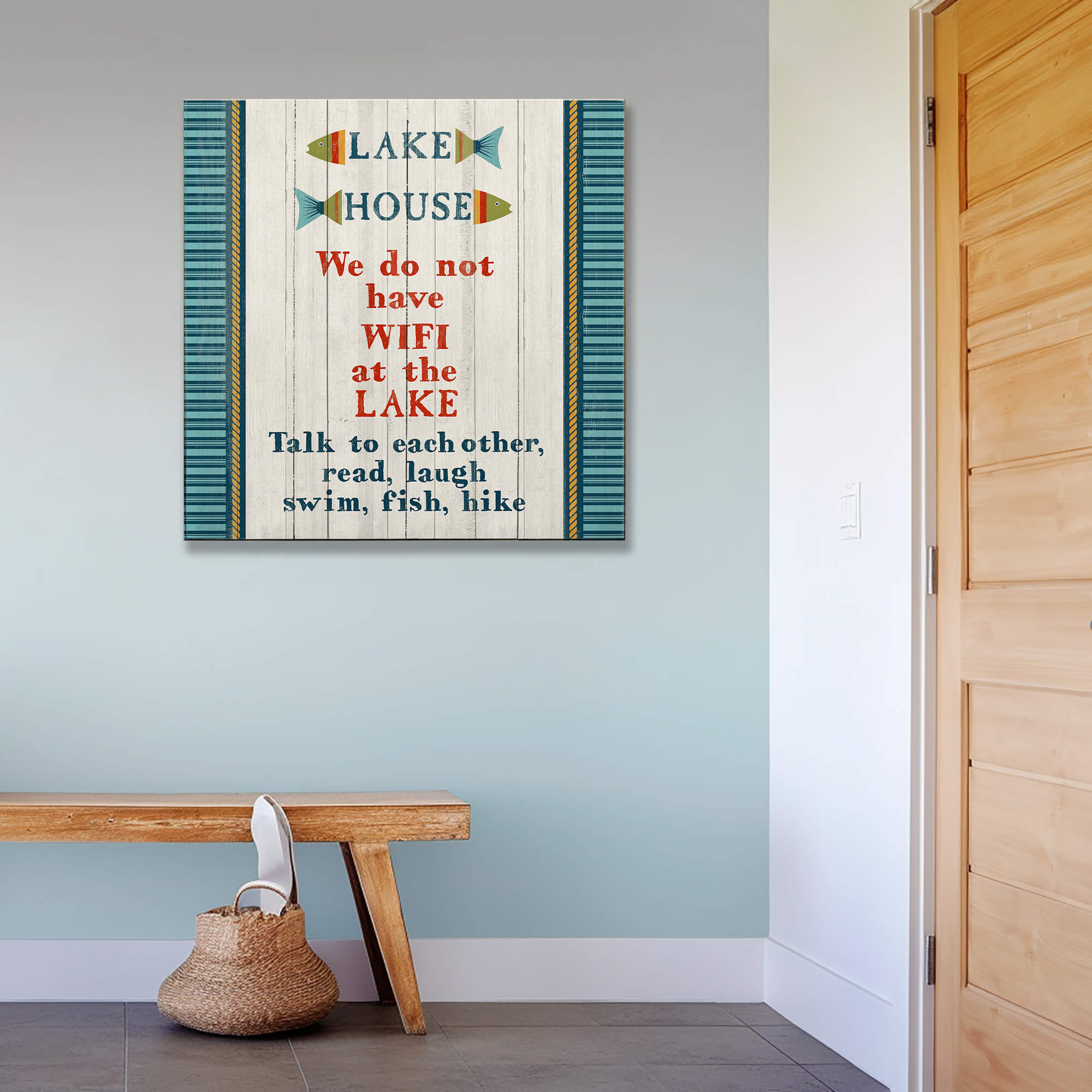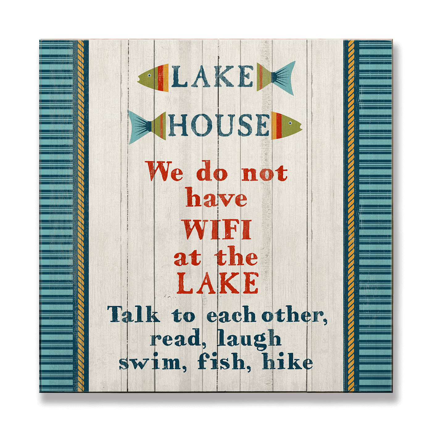 Step away from the digital world and into the rustic charm of this 'Lake House' sign. This delightful wall art invites you to disconnect and enjoy simple pleasures like talking, reading, laughing, swimming, fishing, and hiking—all without WiFi. Decorated with whimsical fish and stylish stripes, this piece is perfect for any lake house, cabin, or home that cherishes making memories in nature. Add a playful touch to your decor and remind everyone of the joys of lakeside living with this unique and heartwarming piece.