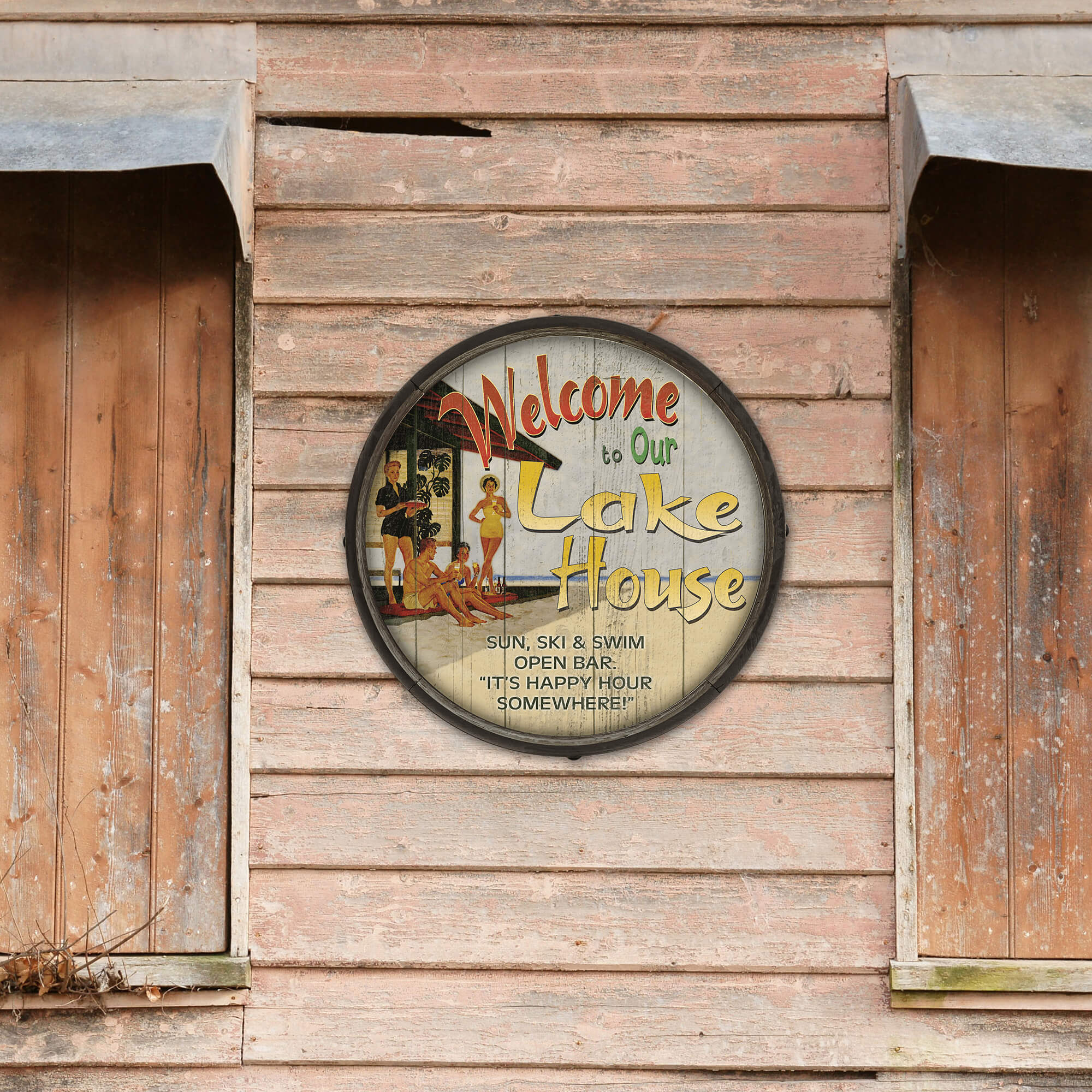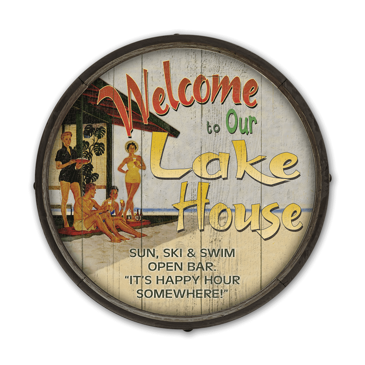 Create the perfect lake house retreat with this vintage-style barrel-end sign, crafted from wood and featuring a nostalgic mid-century lakeside scene. Designed to bring a warm and inviting touch to any cabin, lodge, or lake home, this rustic wooden wall décor sets the tone for relaxation and good times by the water. Ideal for lake lovers, boaters, and weekend getaways, this unique lake house sign makes a charming statement piece.