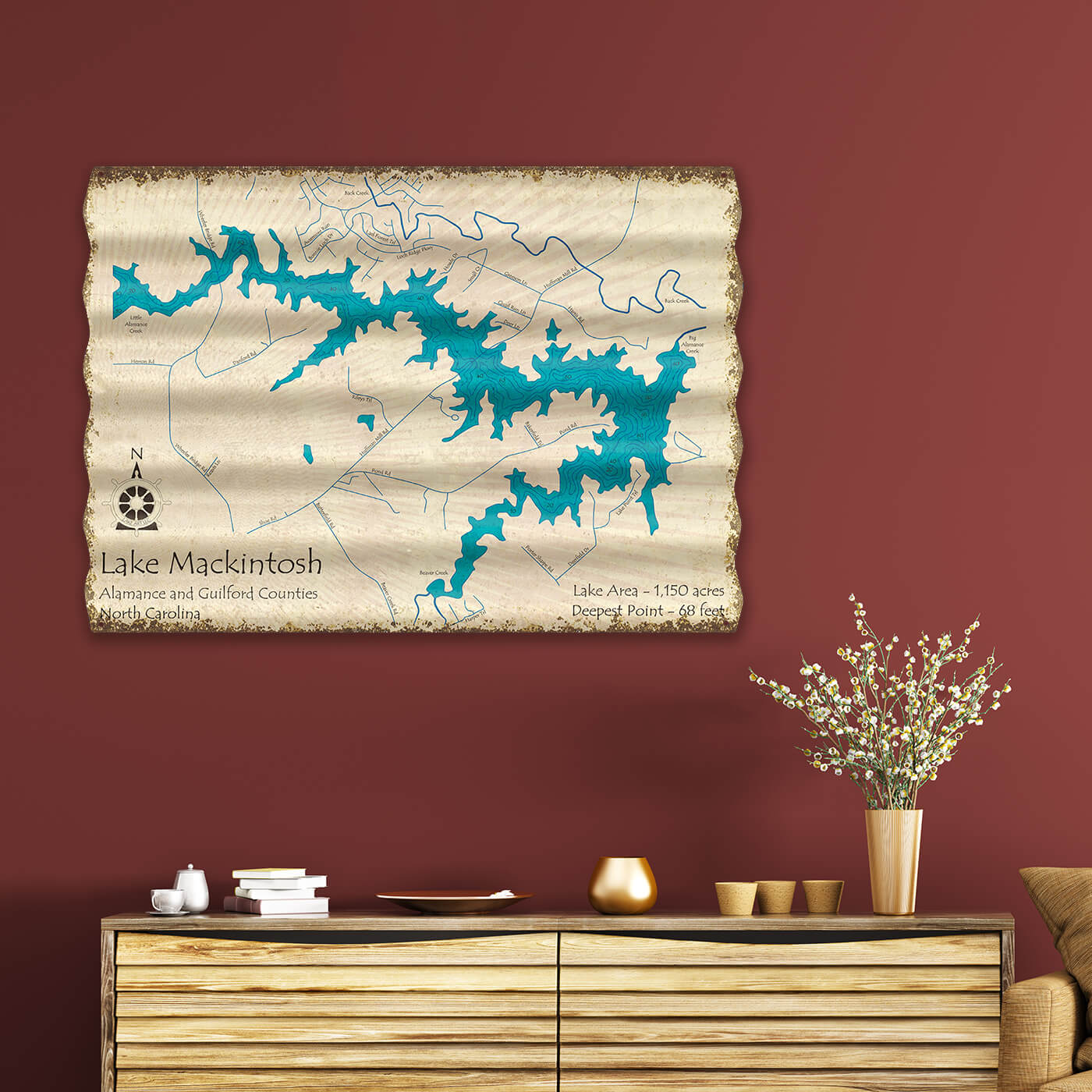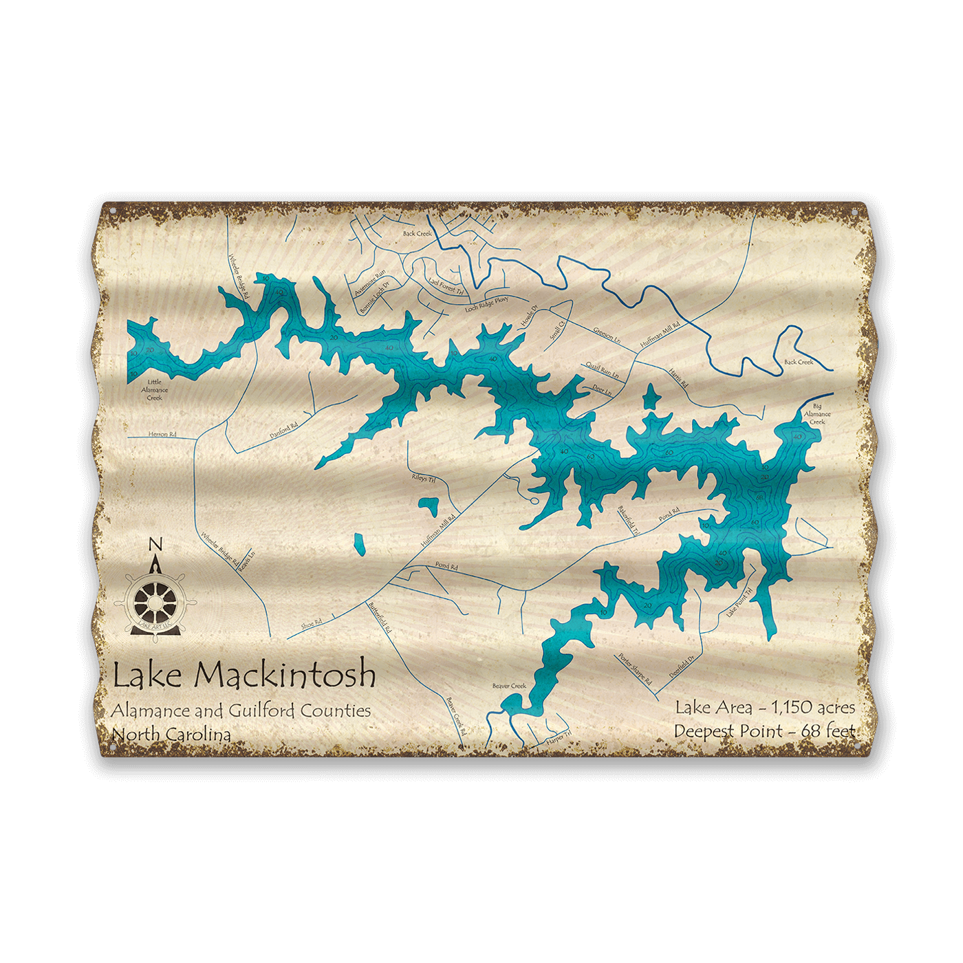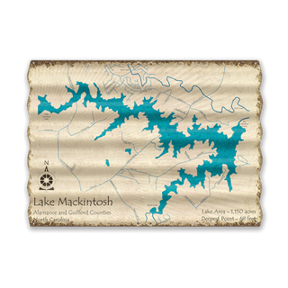 Discover the intricate beauty and natural allure of Lake Mackintosh, a stunning freshwater haven nestled between Alamance and Guilford Counties in North Carolina. This detailed map showcases Lake Mackintosh's expansive waters, spanning approximately 1,150 acres, with a depth reaching up to 68 feet. Known for its meandering shoreline and an array of coves, Lake Mackintosh is a favorite among both water sports and nature lovers.