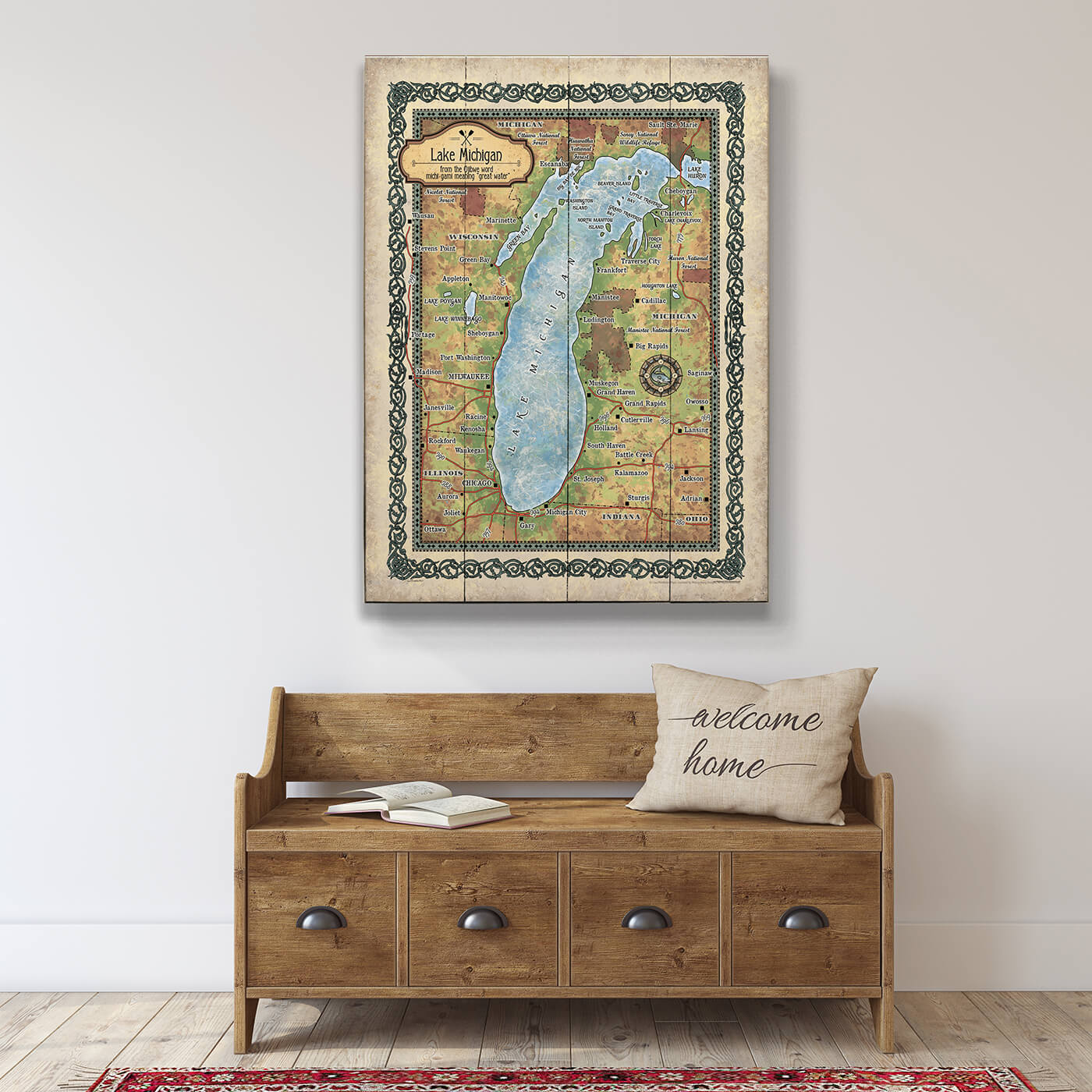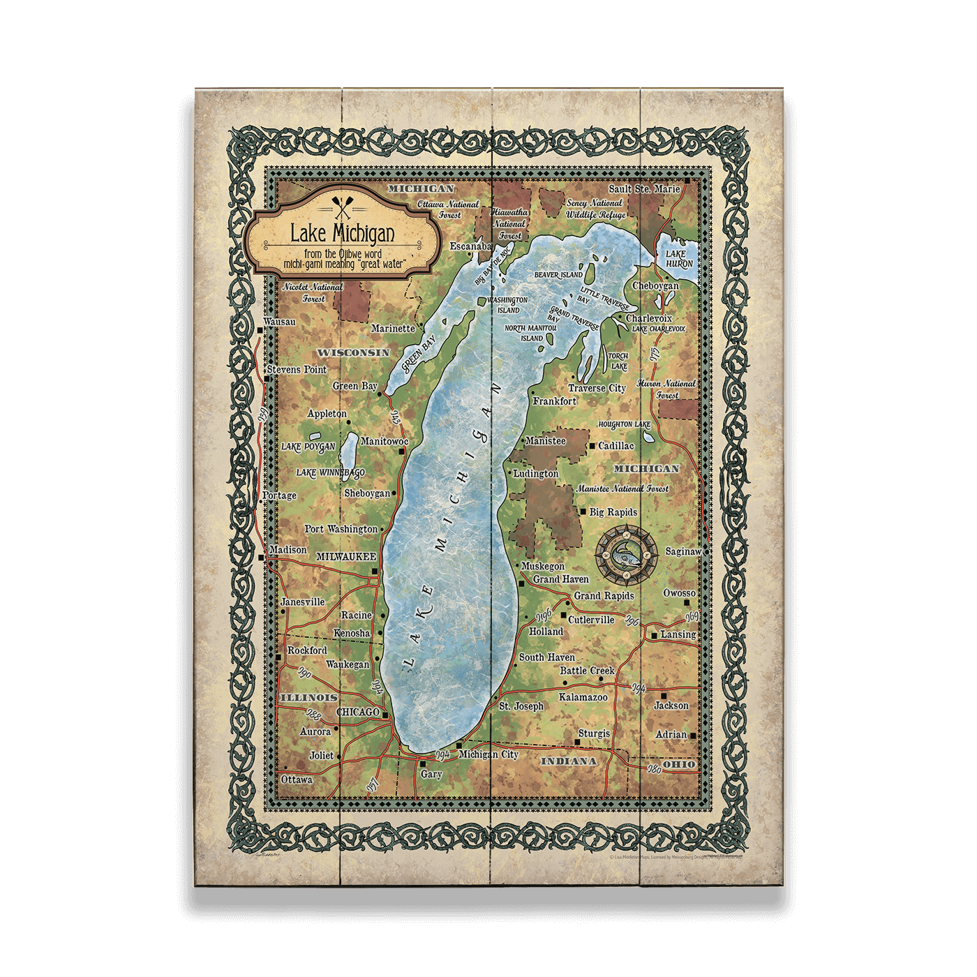 Perfect for lovers of geography, history, or maritime charm, this map adds a unique artistic touch to any space. It’s a magnificent tribute to the cultural and natural heritage of the Lake Michigan area, ideal for both personal collections and as a gift to those who cherish the iconic landscapes of the Midwest.